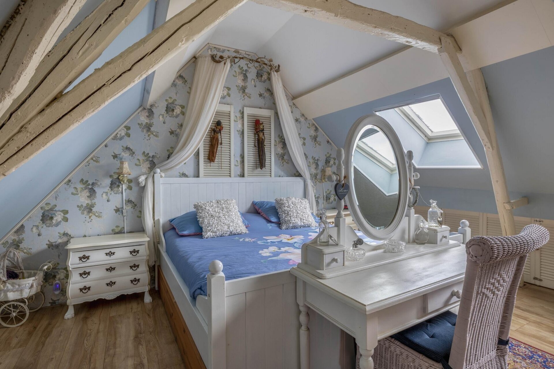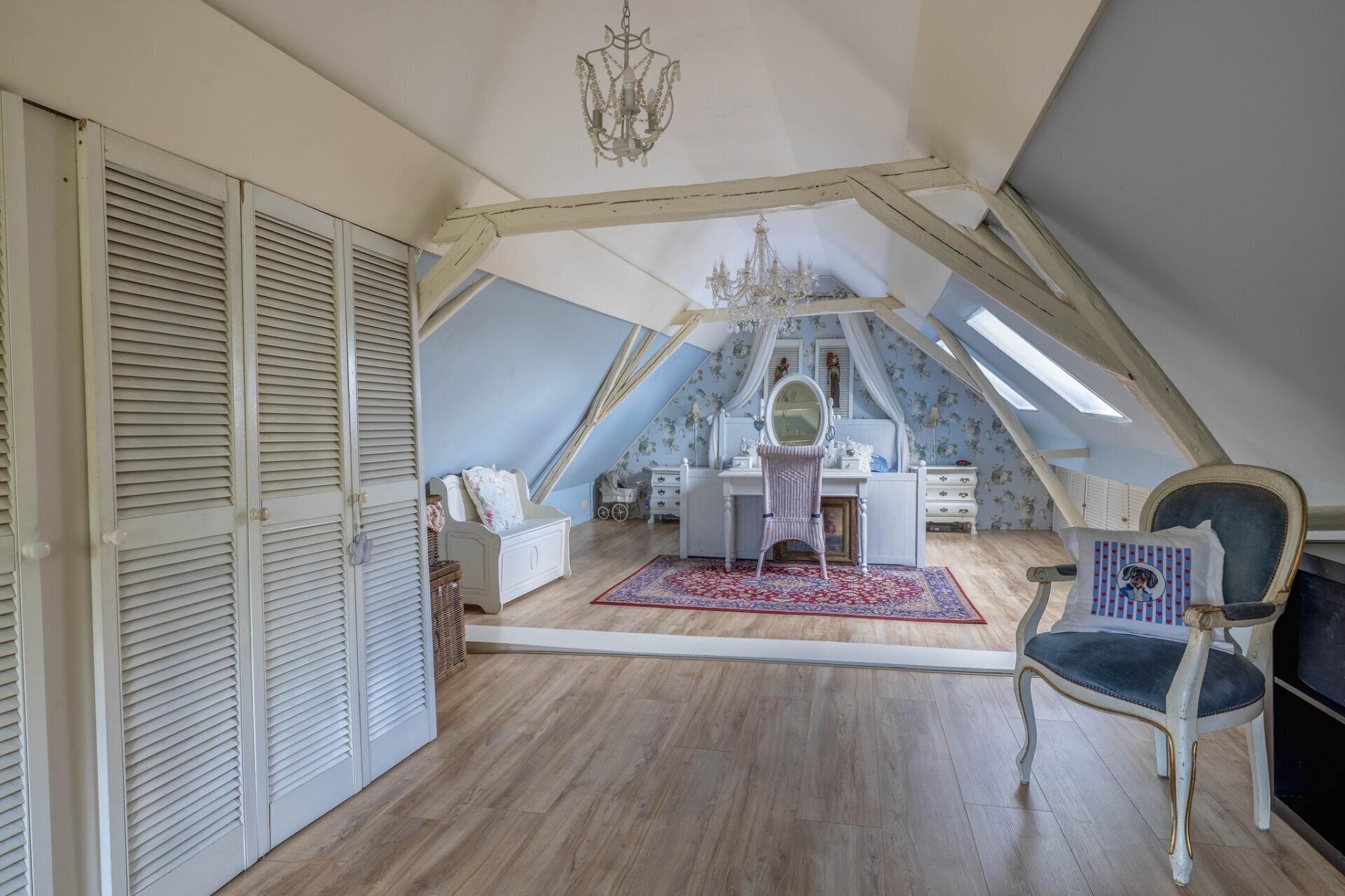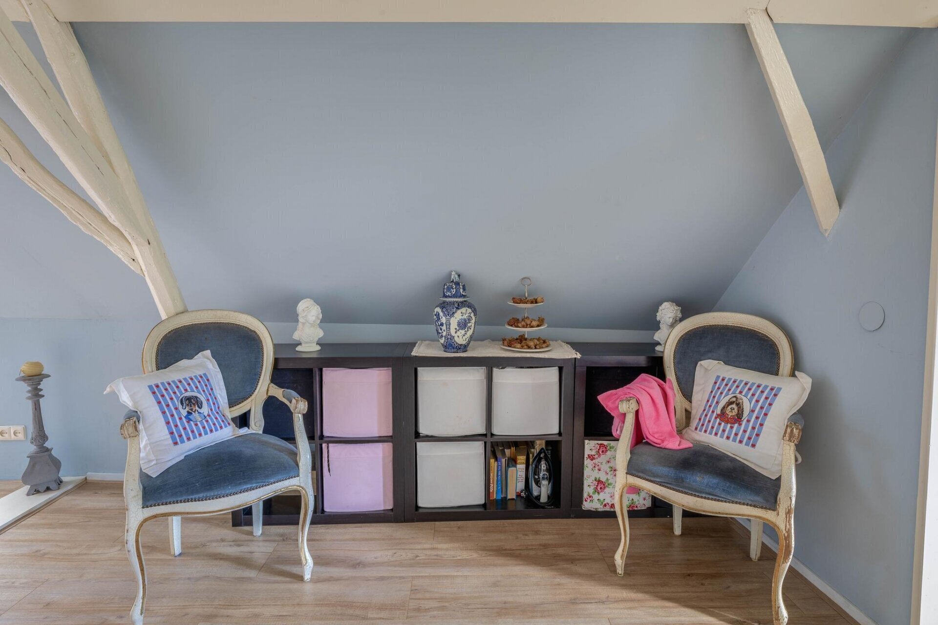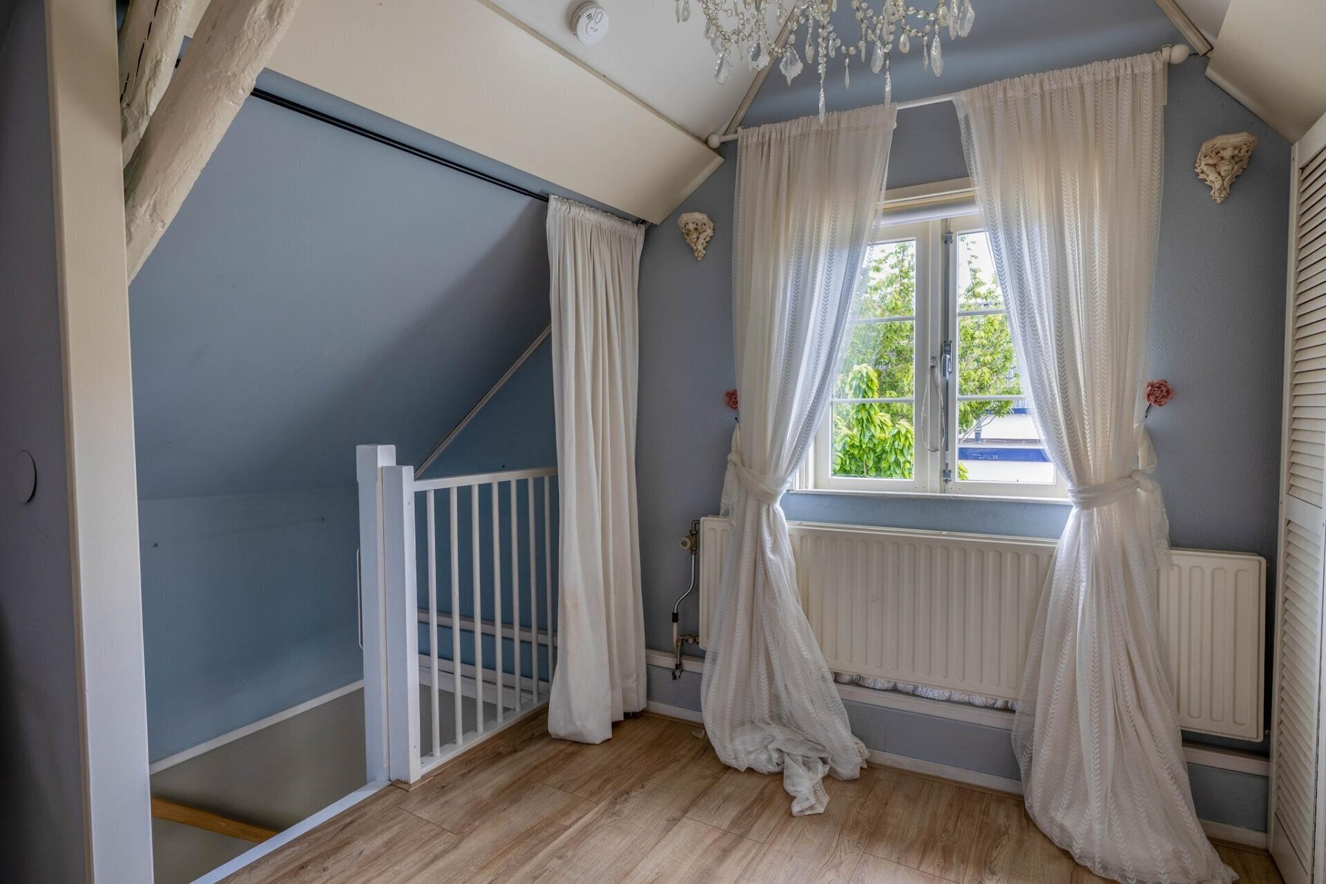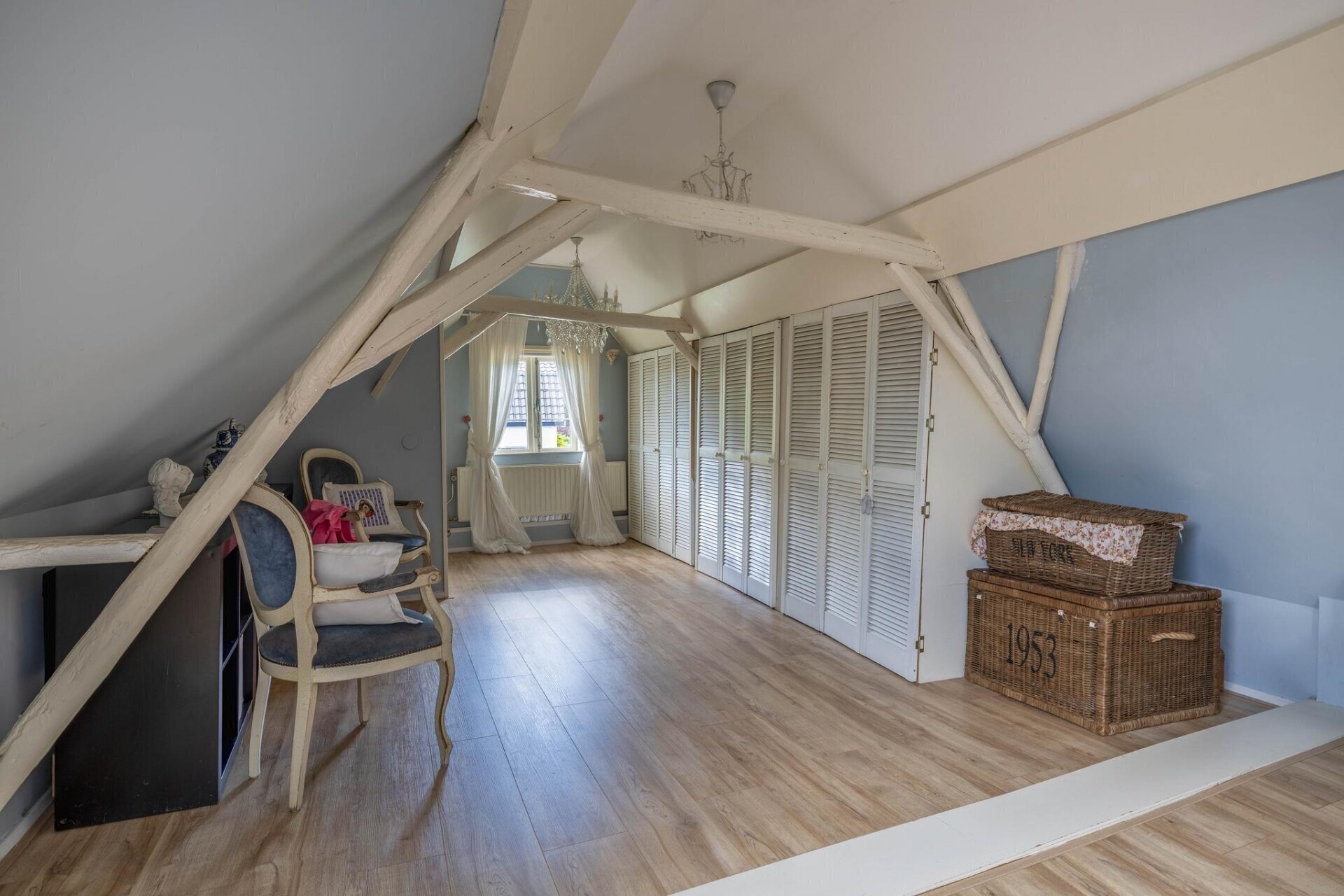 Op de eerste verdieping vind je nu één royale slaapkamer, met volop licht en zicht op de tuin. In het verleden waren dit twee ruime slaapkamers – wie dat wenst, kan die indeling eenvoudig terugbrengen. De bovenverdieping is bereikbaar via een karakteristieke trap en heeft een prettige, rustige sfeer die past bij het huis. Boven slapen en beneden leven? Of toch liever slapen én werken op beide verdiepingen? Alles is mogelijk.