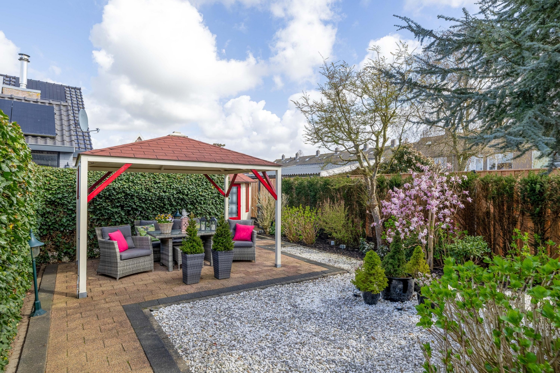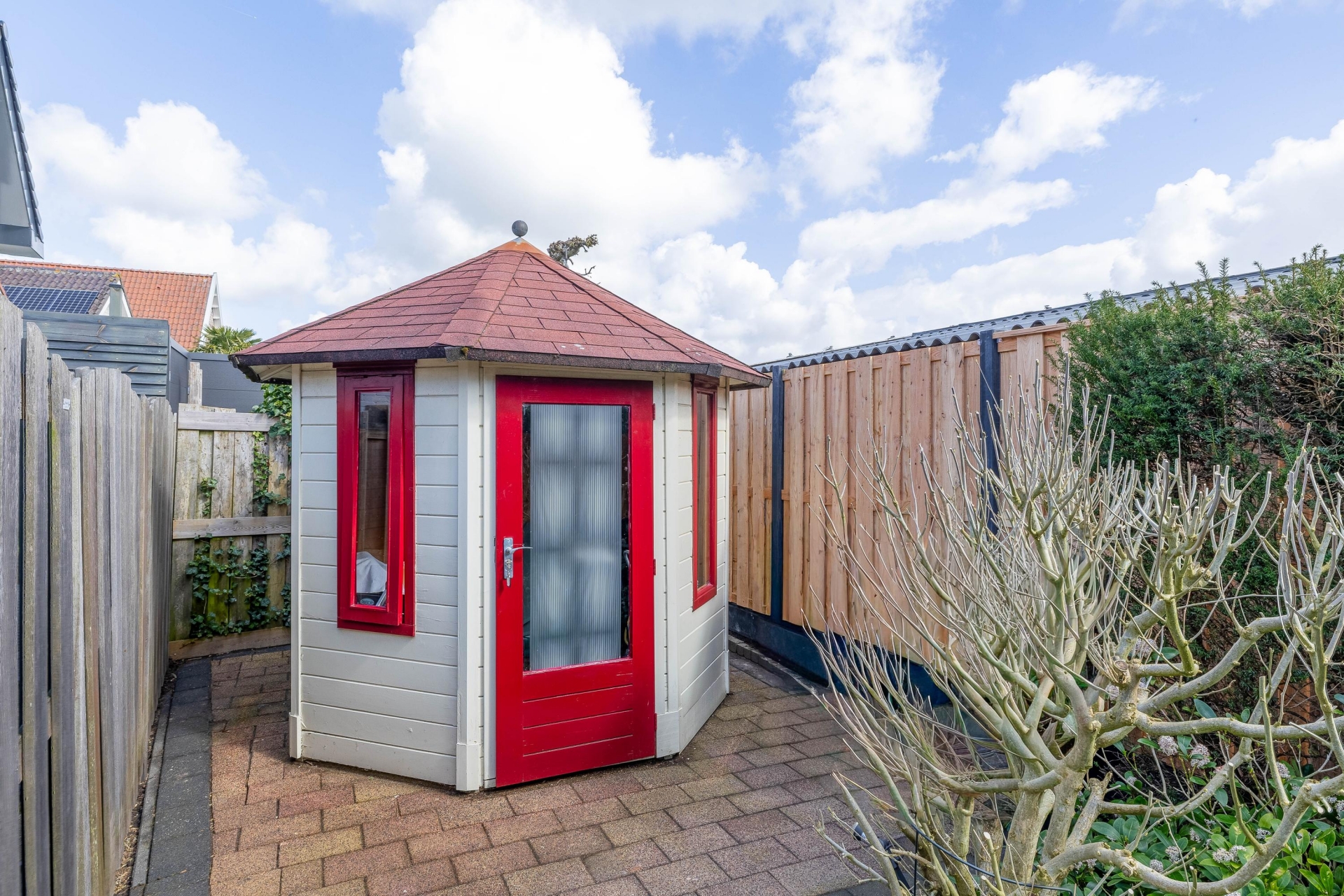 De overkapping in de achtertuin is een echte meerwaarde. Hier zit je beschut en comfortabel, ongeacht het seizoen. Daarnaast is er een vrijstaande houten berging aanwezig voor extra opslag.