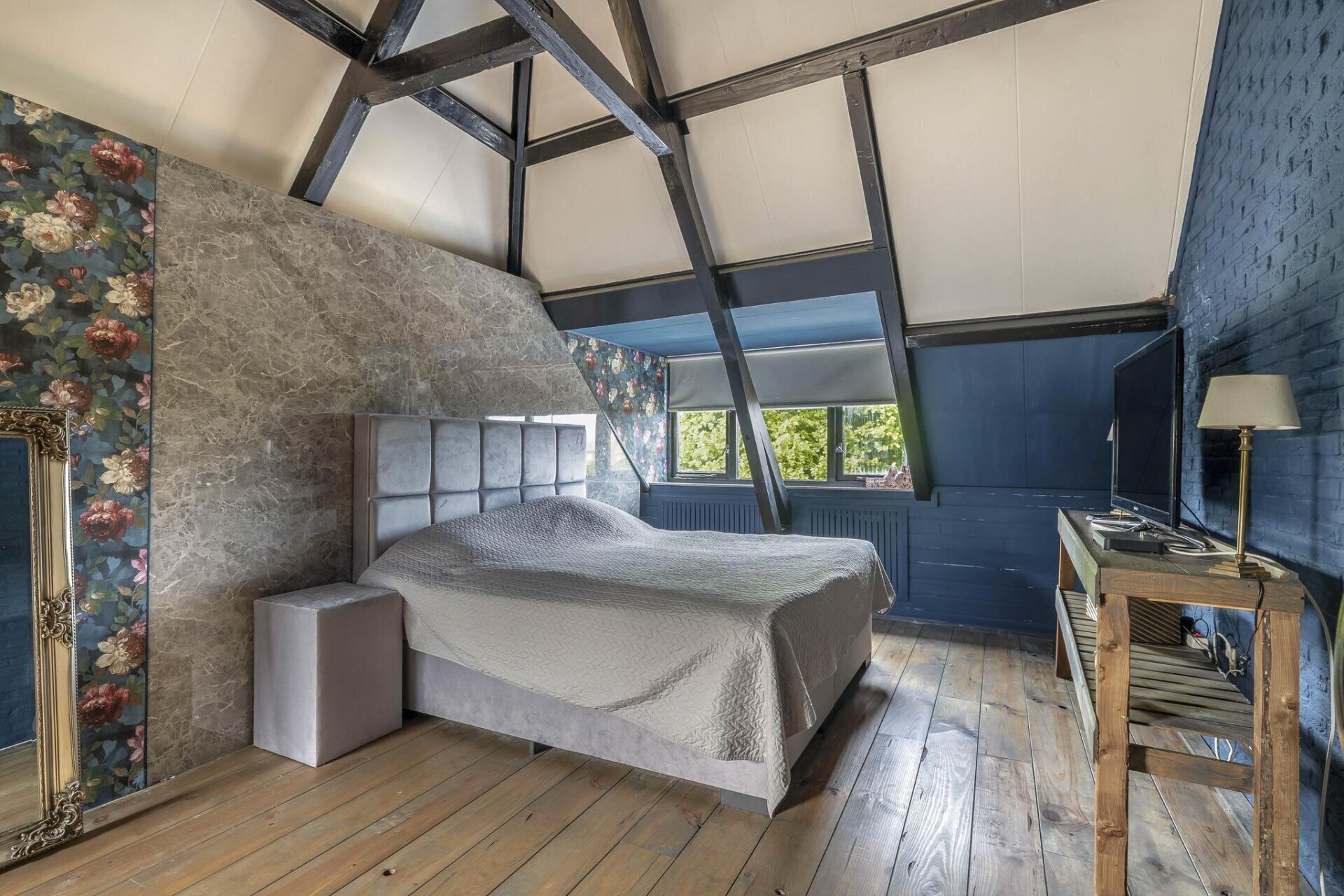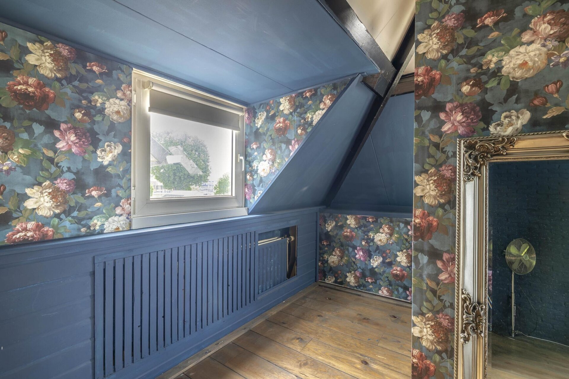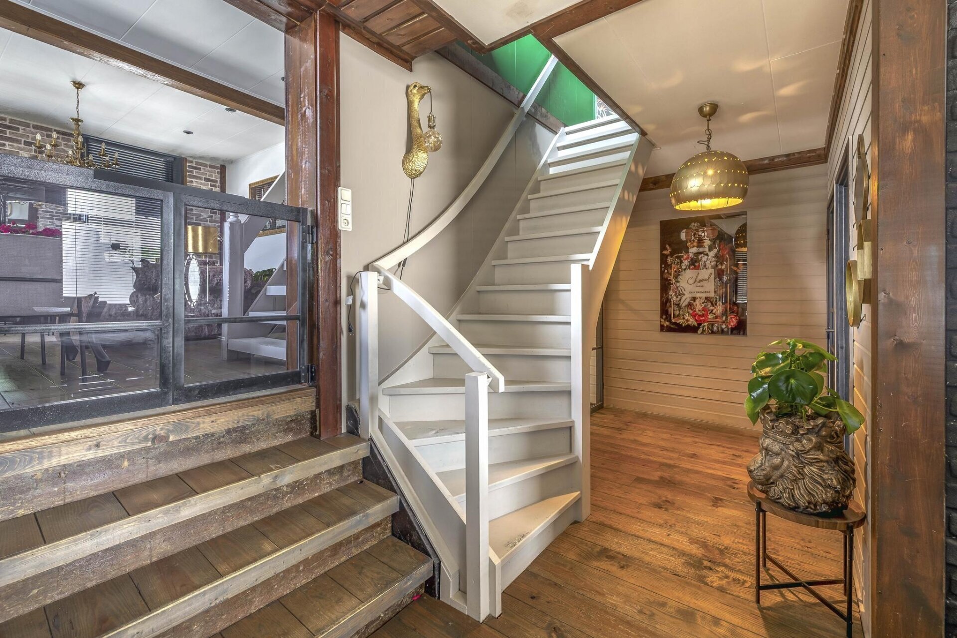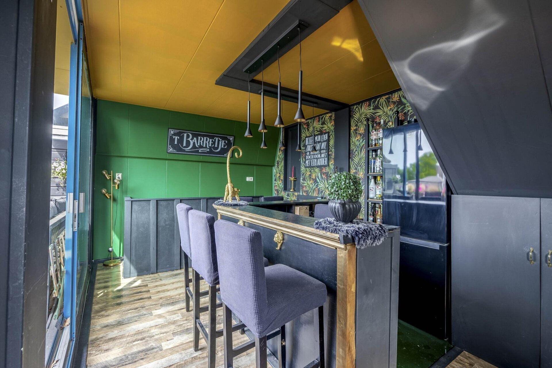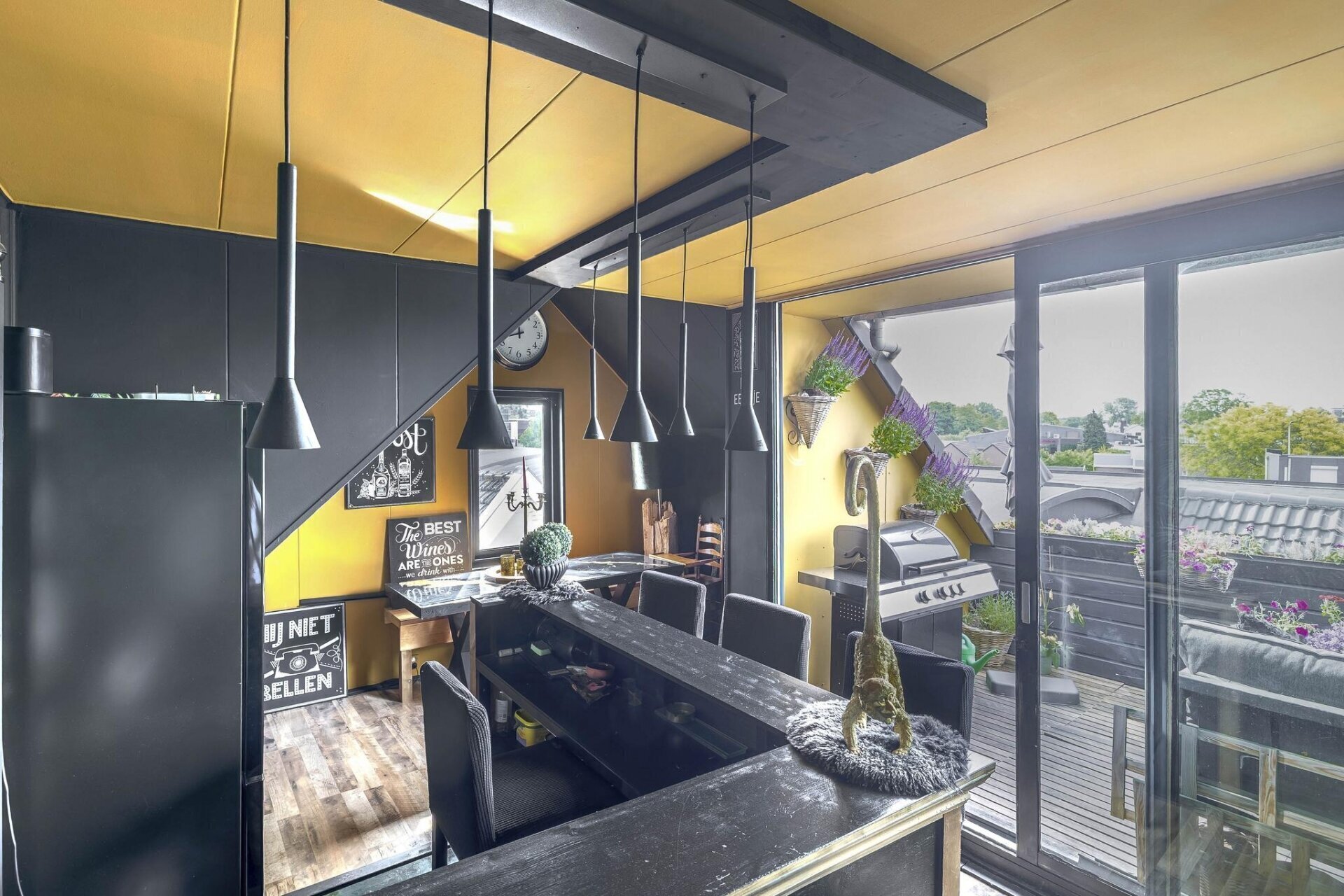 Via de centrale entree stap je de woonverdieping binnen, gelegen op de eerste etage. Hier vind je een fijne overloop die toegang geeft tot de keuken, het toilet en de badkamer. De keuken sluit aan op een gezellige woonkamer waar warme kleuren en gouden accenten zorgen voor een karakteristieke sfeer. Een stijlvolle trap in de woonkamer leidt naar de bovenste woonlaag. Daar vind je een royale slaapkamer en een grote multifunctionele ruimte met een bar, ideaal als hobbyruimte, tweede woonkamer of werkkamer. Deze ruimte grenst aan een loggia waar je heerlijk beschut kunt zitten.