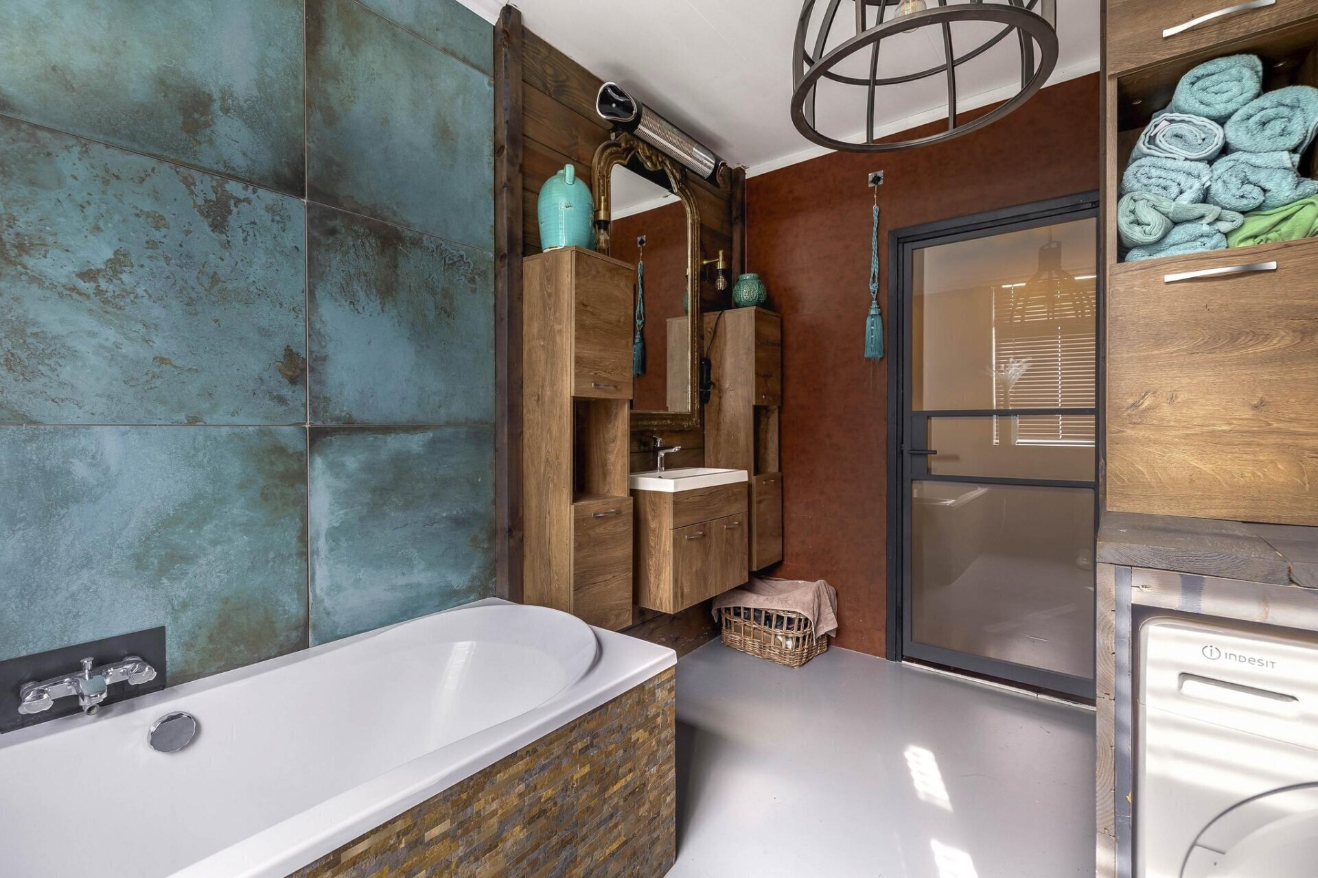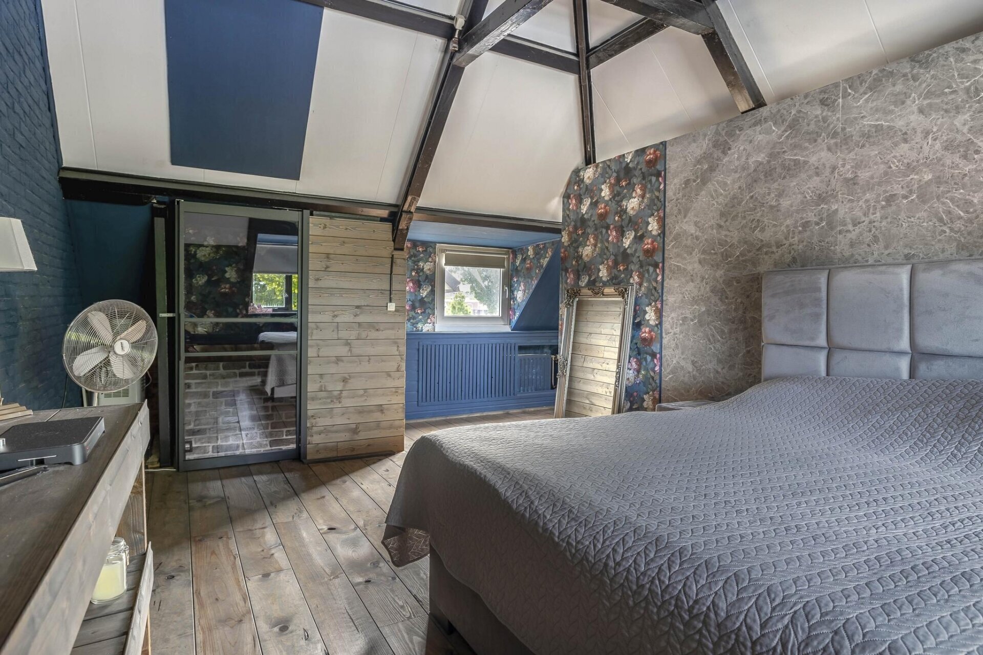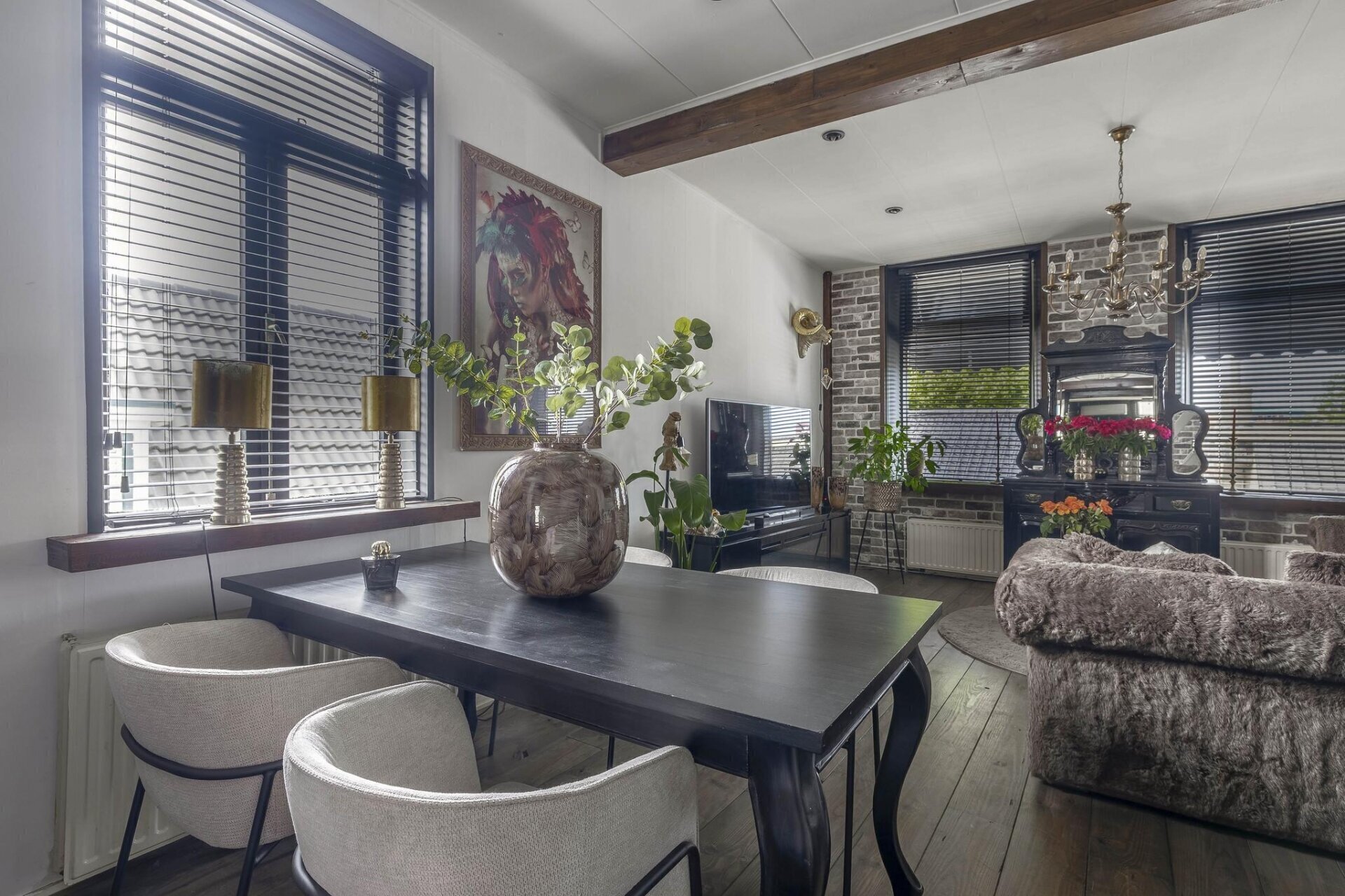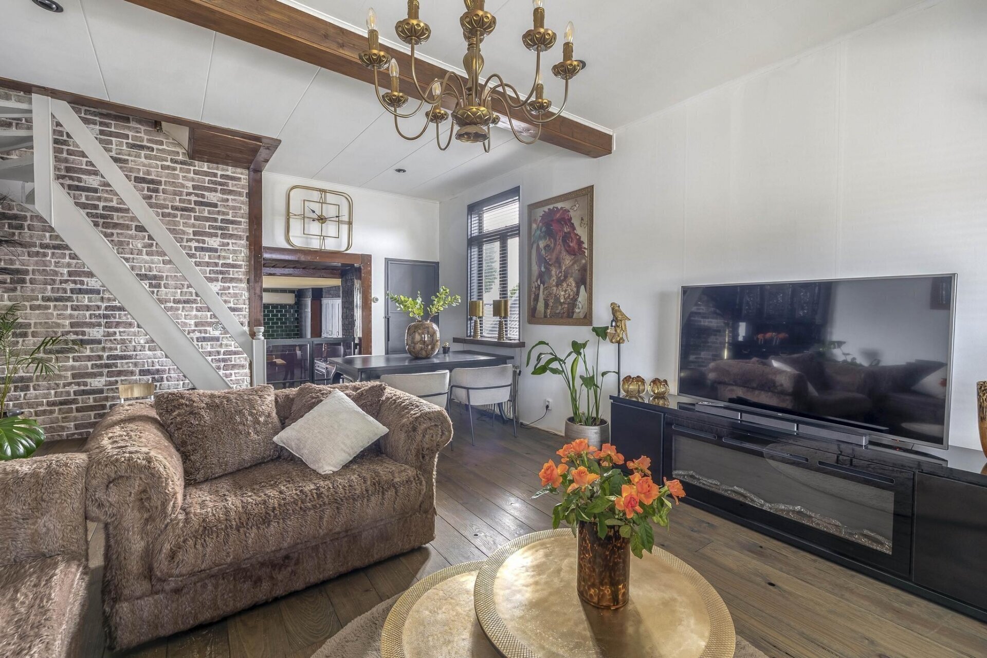 Via de centrale entree stap je de woonverdieping binnen, gelegen op de eerste etage. Hier vind je een fijne overloop die toegang geeft tot de keuken, het toilet en de badkamer. De keuken sluit aan op een gezellige woonkamer waar warme kleuren en gouden accenten zorgen voor een karakteristieke sfeer. Een stijlvolle trap in de woonkamer leidt naar de bovenste woonlaag. Daar vind je een royale slaapkamer en een grote multifunctionele ruimte met een bar, ideaal als hobbyruimte, tweede woonkamer of werkkamer. Deze ruimte grenst aan een loggia waar je heerlijk beschut kunt zitten.