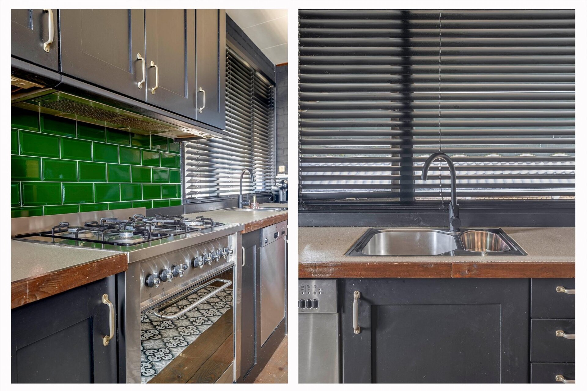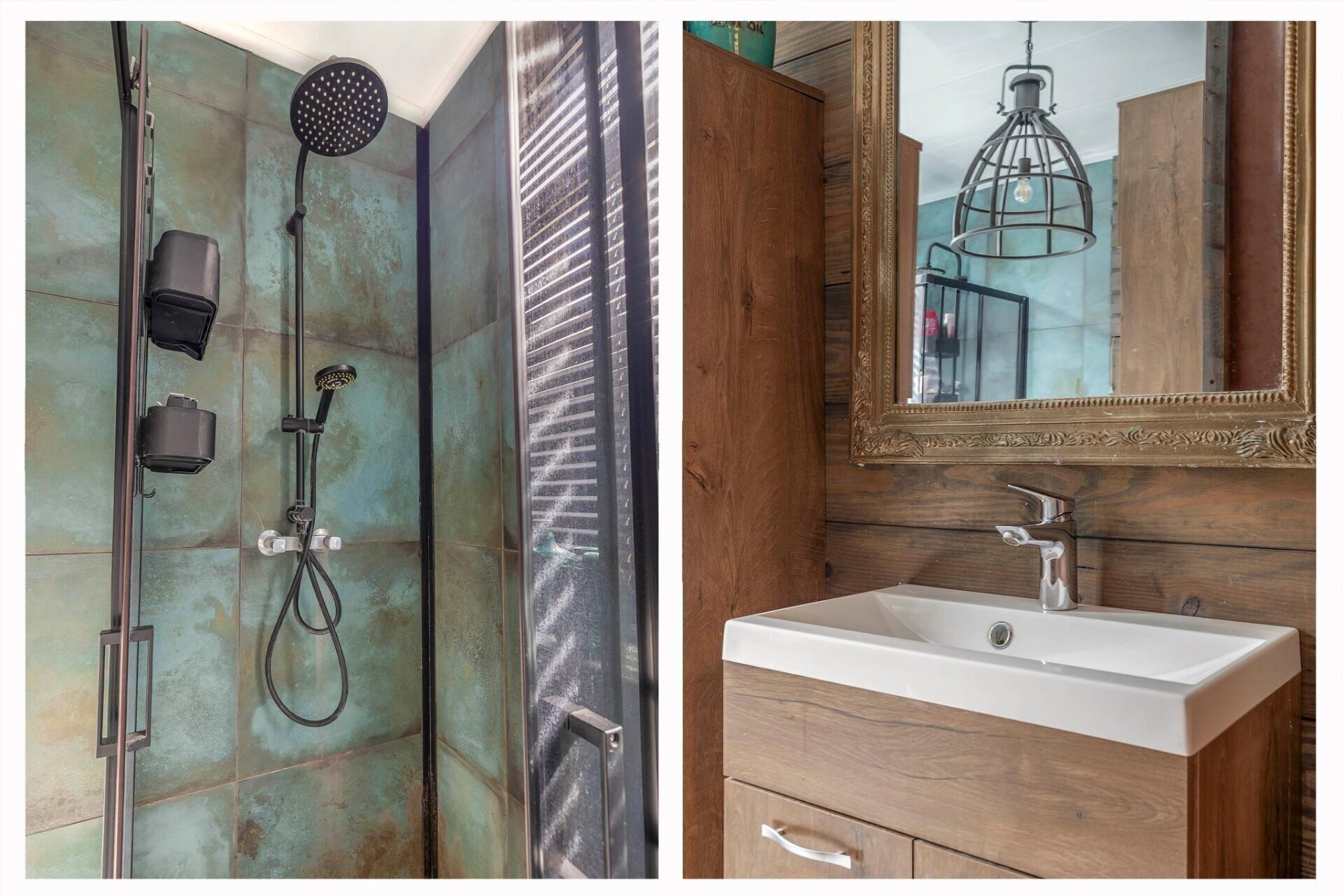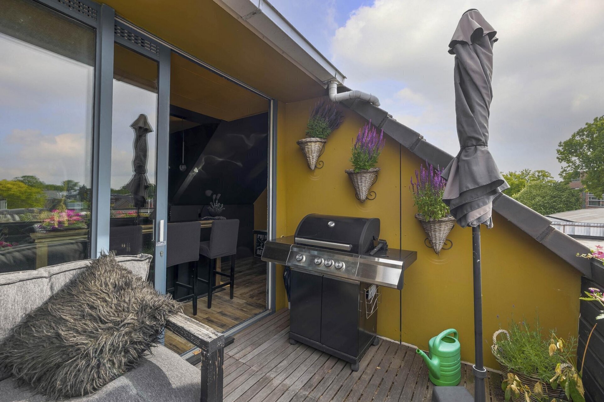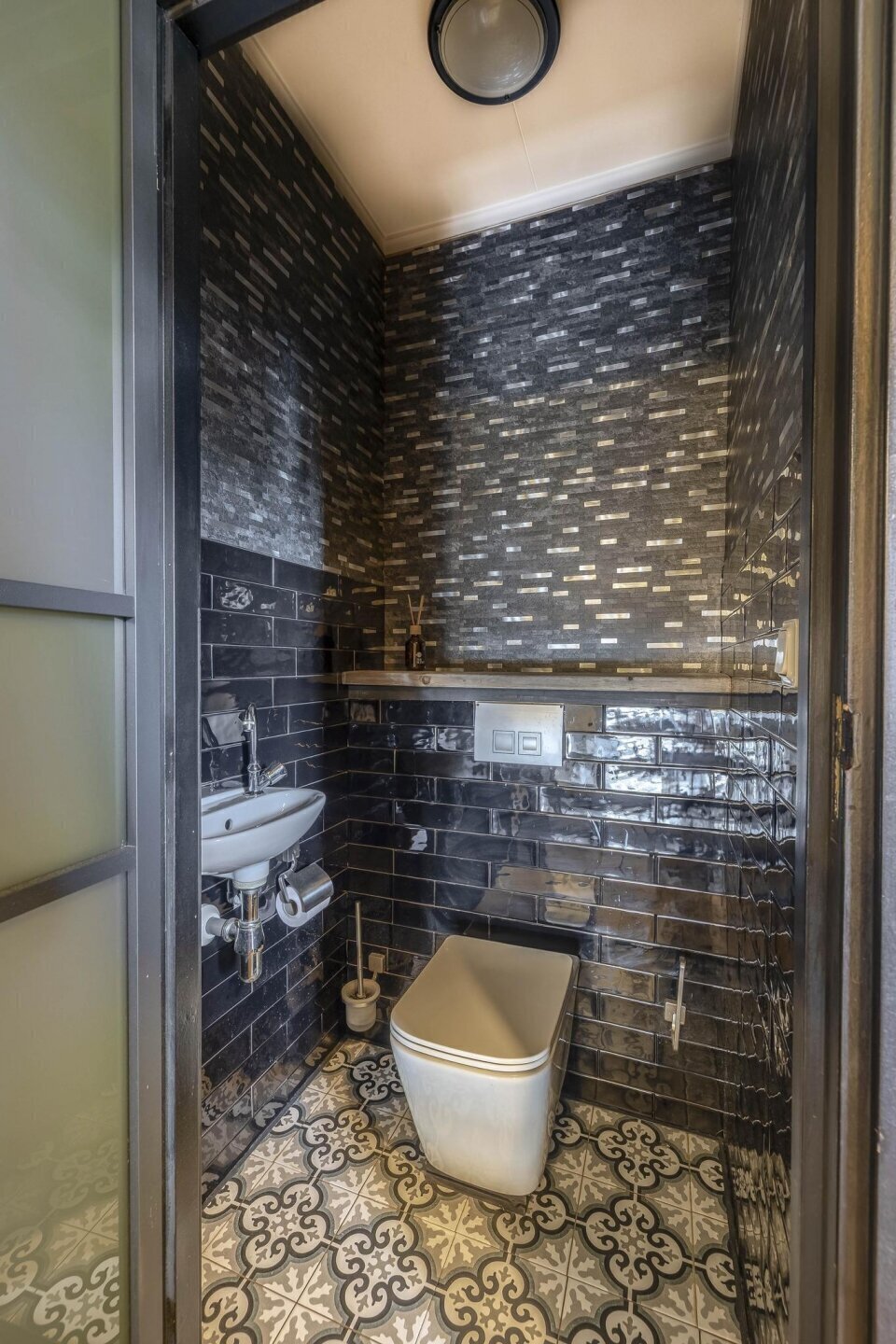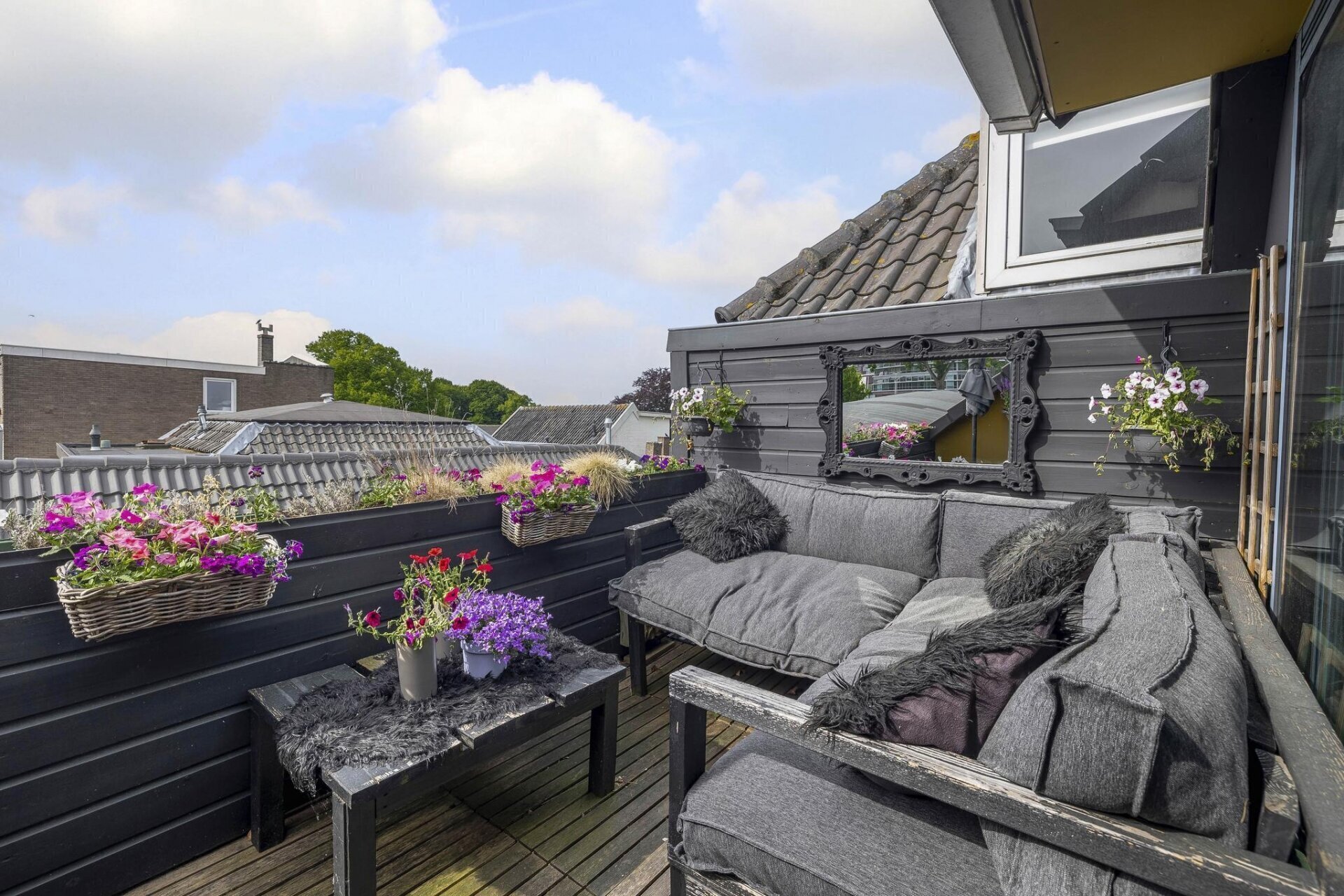 Via de centrale entree stap je de woonverdieping binnen, gelegen op de eerste etage. Hier vind je een fijne overloop die toegang geeft tot de keuken, het toilet en de badkamer. De keuken sluit aan op een gezellige woonkamer waar warme kleuren en gouden accenten zorgen voor een karakteristieke sfeer. Een stijlvolle trap in de woonkamer leidt naar de bovenste woonlaag. Daar vind je een royale slaapkamer en een grote multifunctionele ruimte met een bar, ideaal als hobbyruimte, tweede woonkamer of werkkamer. Deze ruimte grenst aan een loggia waar je heerlijk beschut kunt zitten.