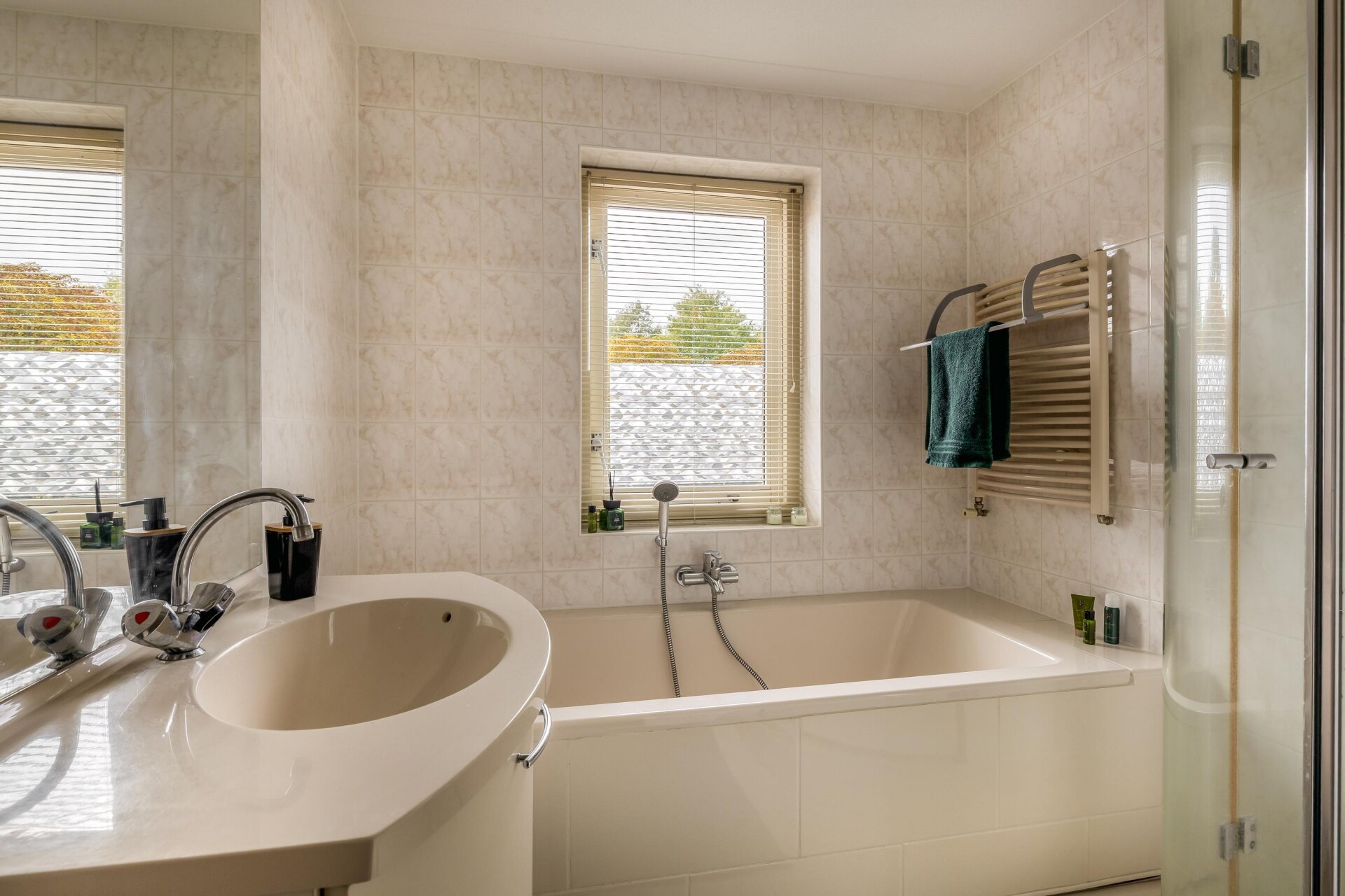 Op de eerste verdieping zijn nu twee kamers ingericht, waarvan de grote slaapkamer toegang heeft naar het ruime dakterras. Deze verdieping is eenvoudig weer terug te brengen naar de oorspronkelijke indeling met drie (slaap)kamers. De badkamer is functioneel ingedeeld met een ligbad, aparte douche, wastafel en een raam voor natuurlijke ventilatie.