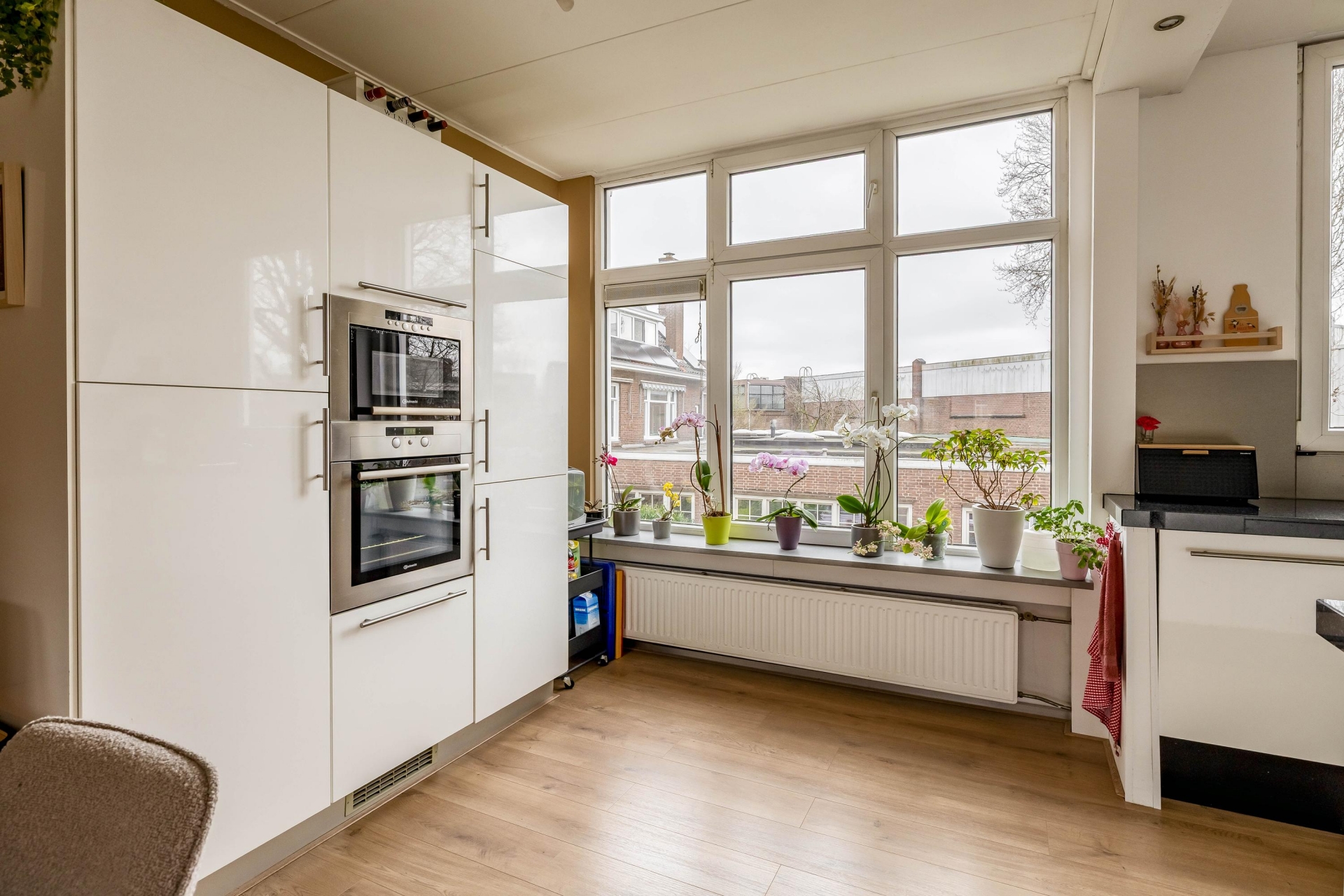 De keuken is opgesteld in een praktische hoekopstelling met donkere werkbladen en veel kastruimte. Door het raam valt prettig daglicht naar binnen en kijk je uit over de achtergelegen bebouwing.
