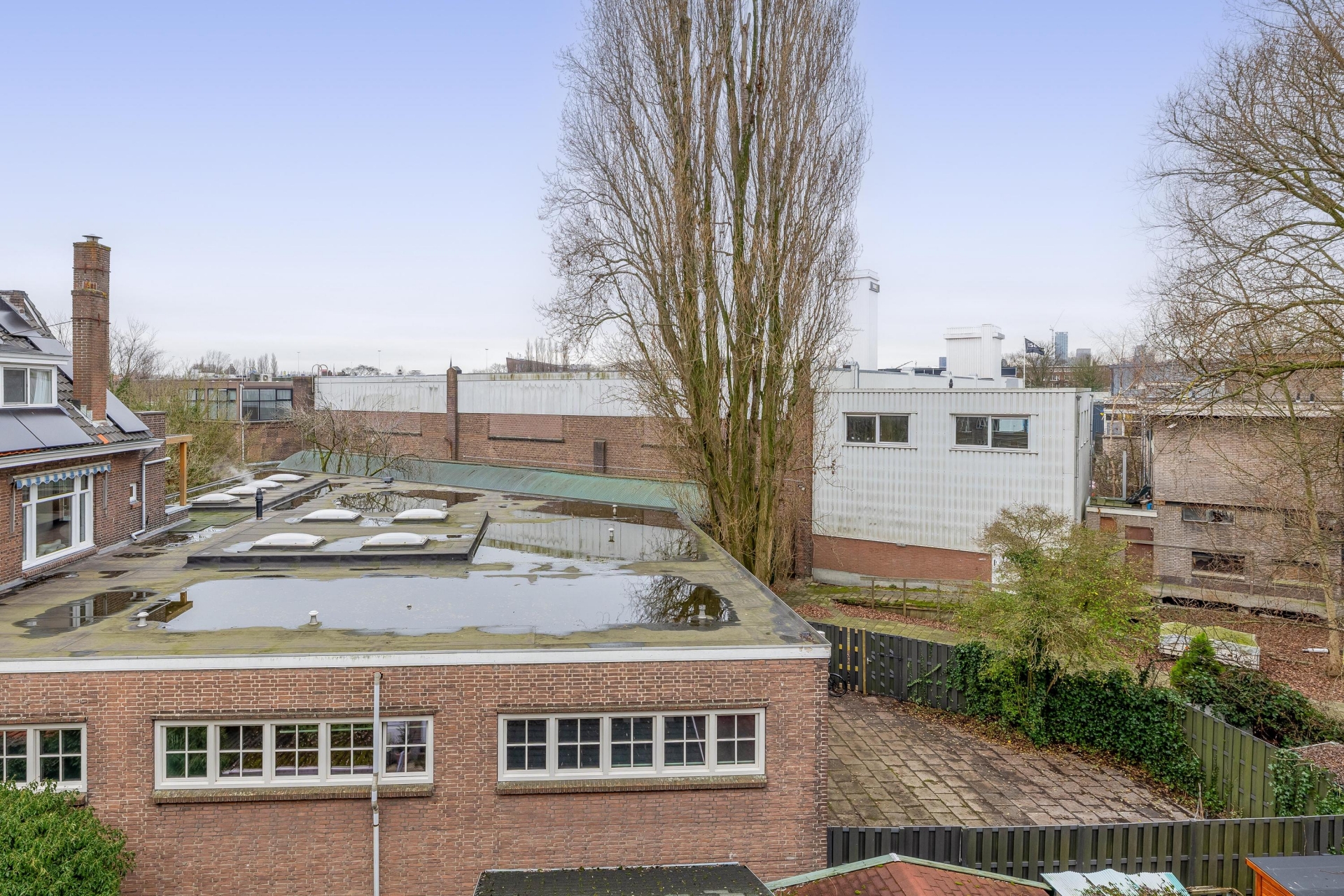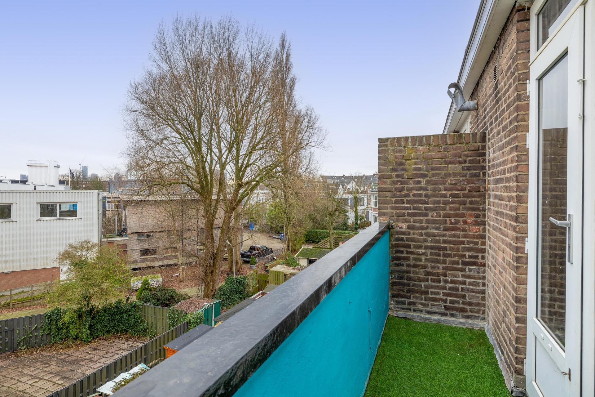 Aan de achterzijde, op de tweede verdieping, bevindt zich het balkon op het zuidoosten. Hier zit je heerlijk in de ochtend- en vroege middagzon met uitzicht over karakteristieke jaren ’30 bebouwing. Een fijne plek voor een kop koffie in de zon of om na een werkdag even buiten te zitten.