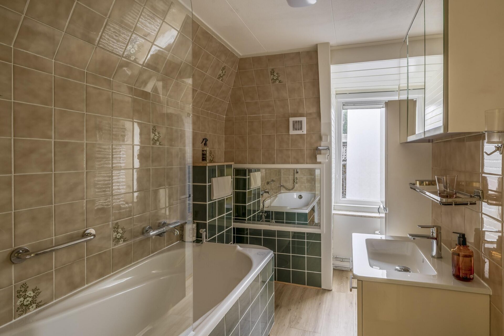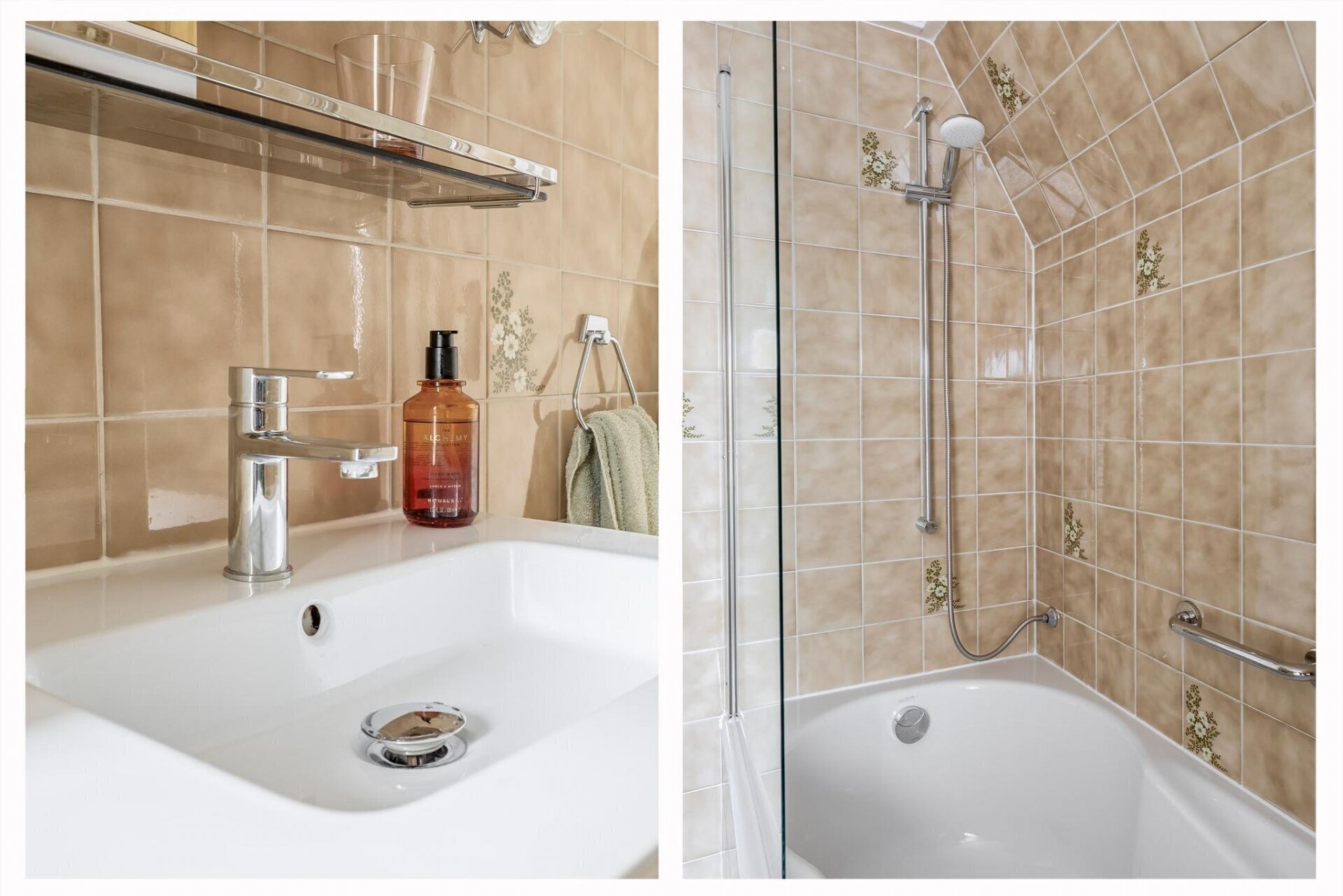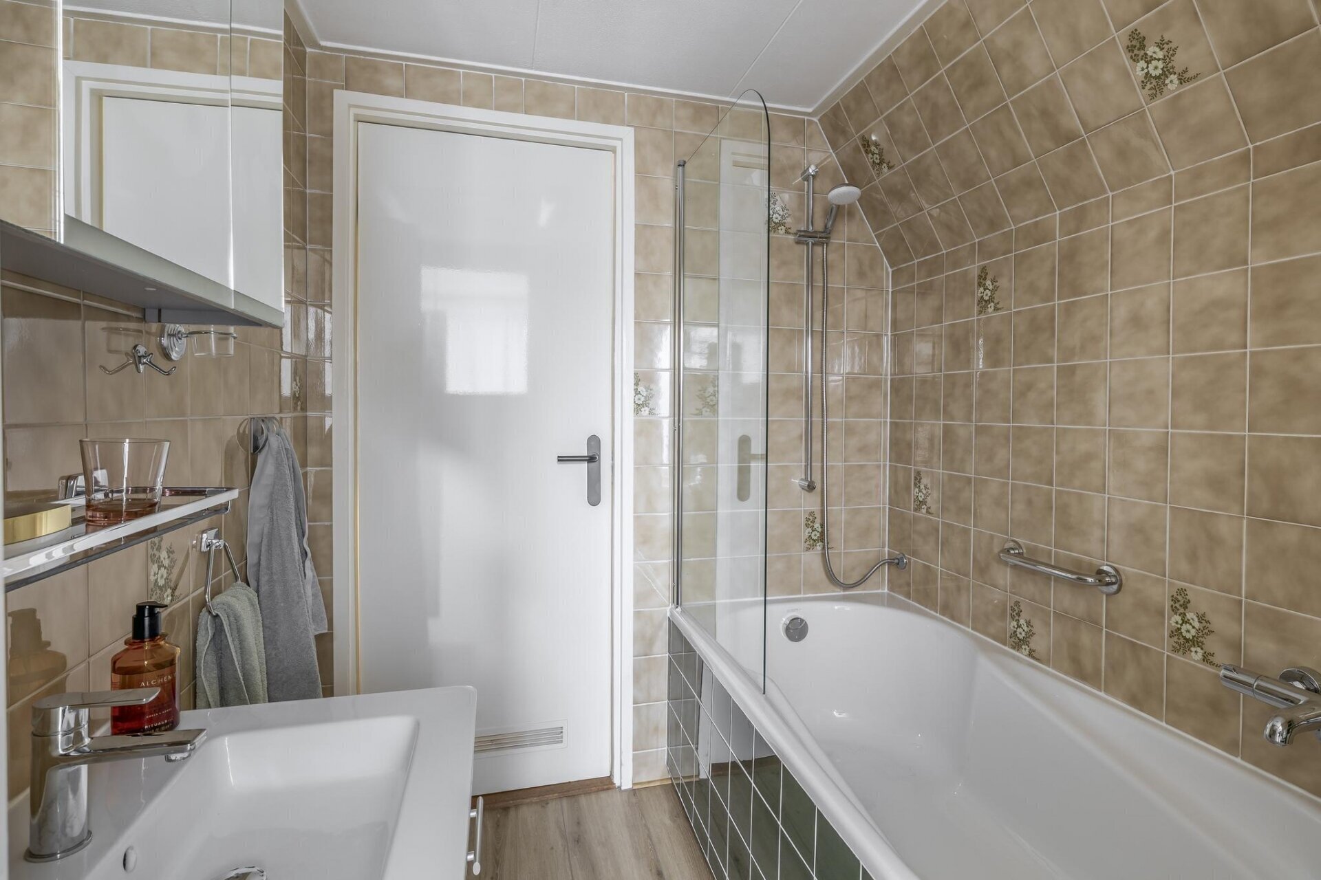Badkamer voorzien van wastafelmeubel, toilet, bad met douche gelegenheid en handdoek radiator.