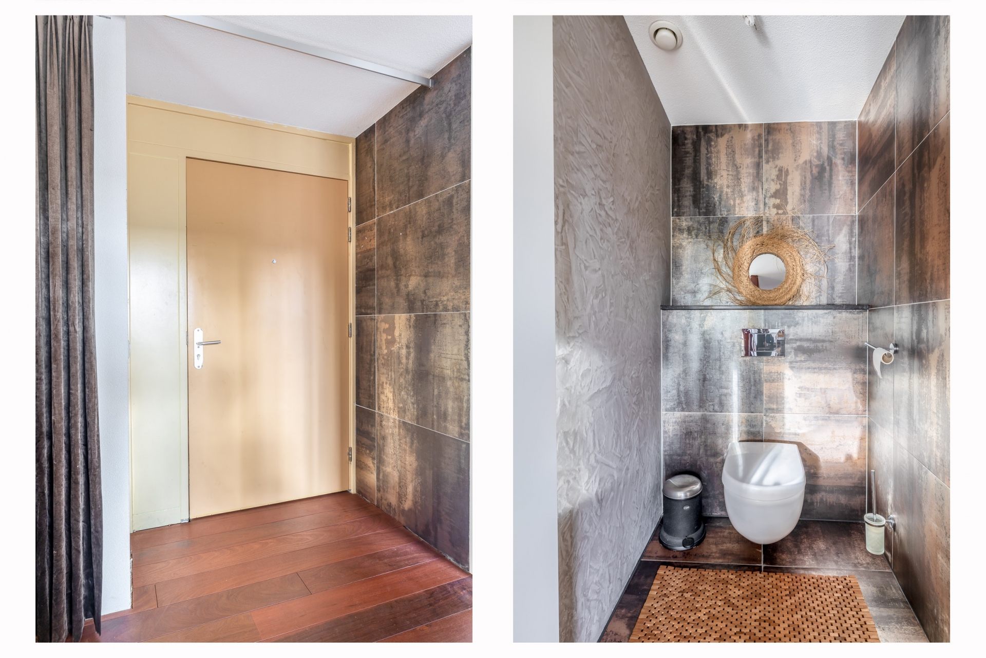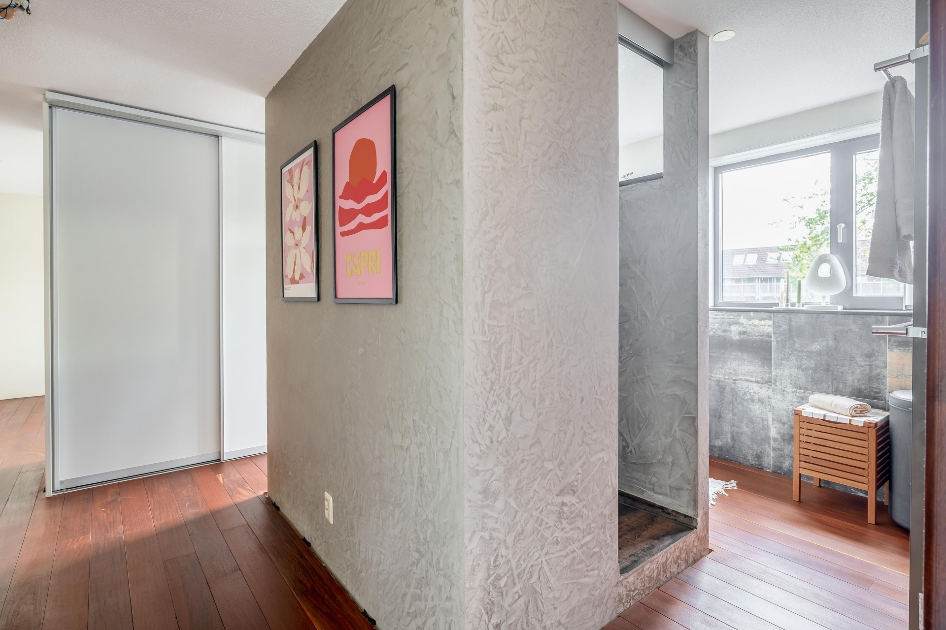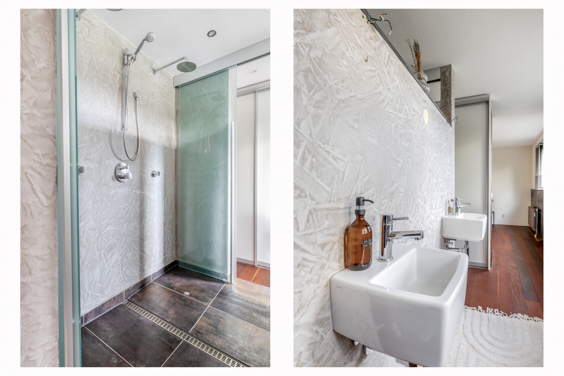 Ook in de badkamer zie je dat er is gekozen voor kwaliteit en sfeer. De dubbele douche is praktisch én luxe, en de wanden zijn strak afgewerkt met betonciré: stoer, onderhoudsvriendelijk en helemaal van nu. De ruimte voelt aan als een persoonlijke spa: minimalistisch, functioneel en stijlvol ingericht. Alles is tot in de puntjes verzorgd.