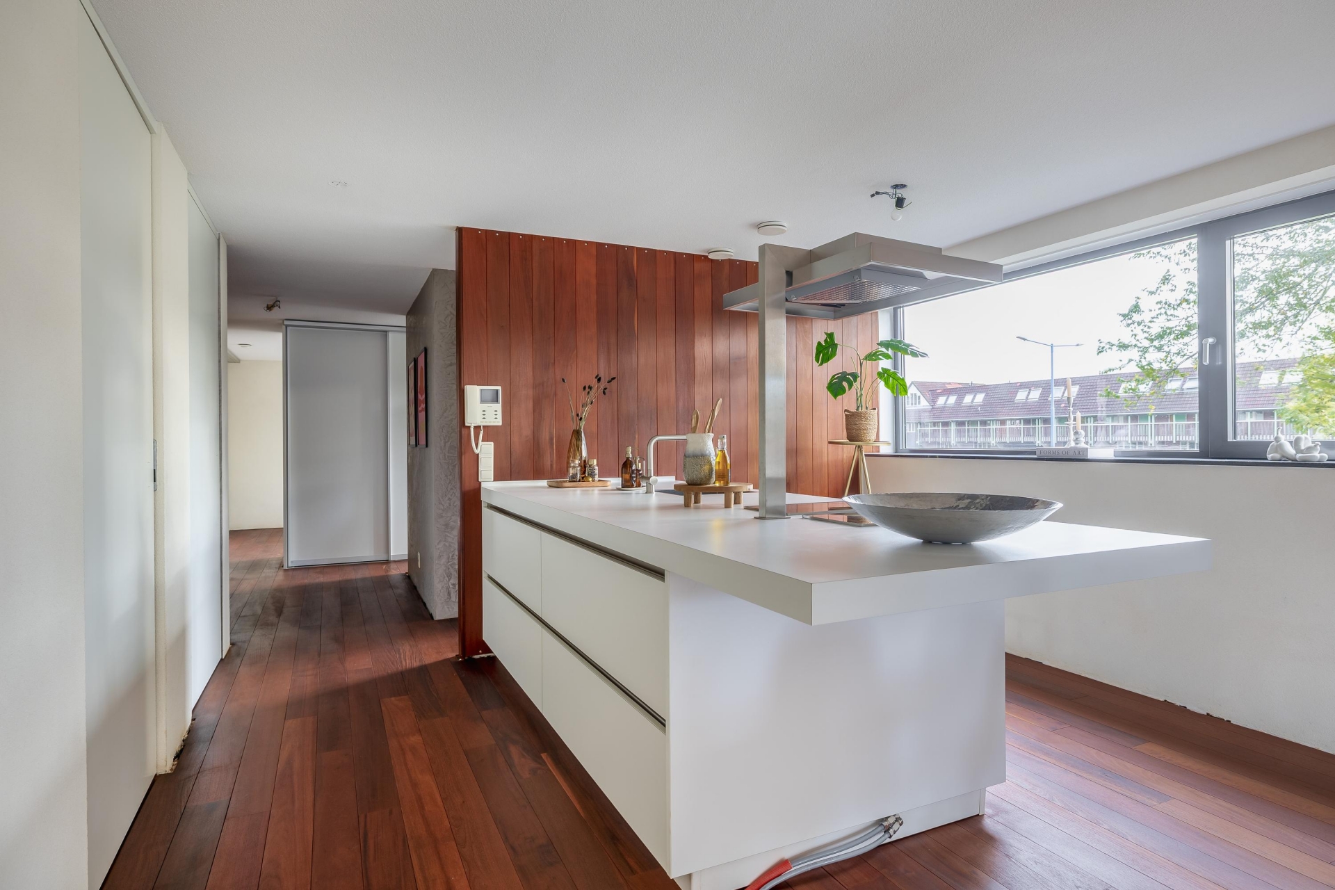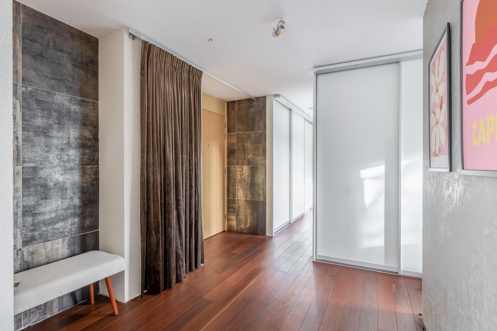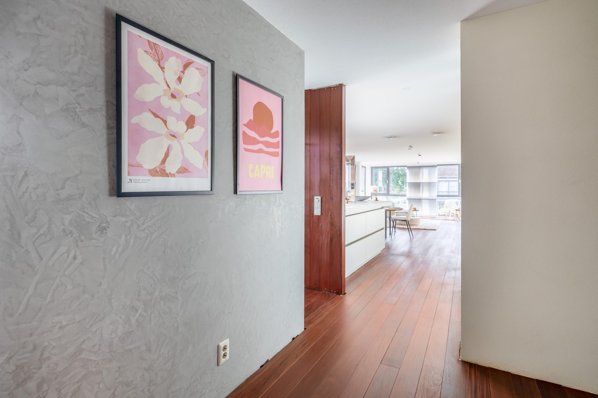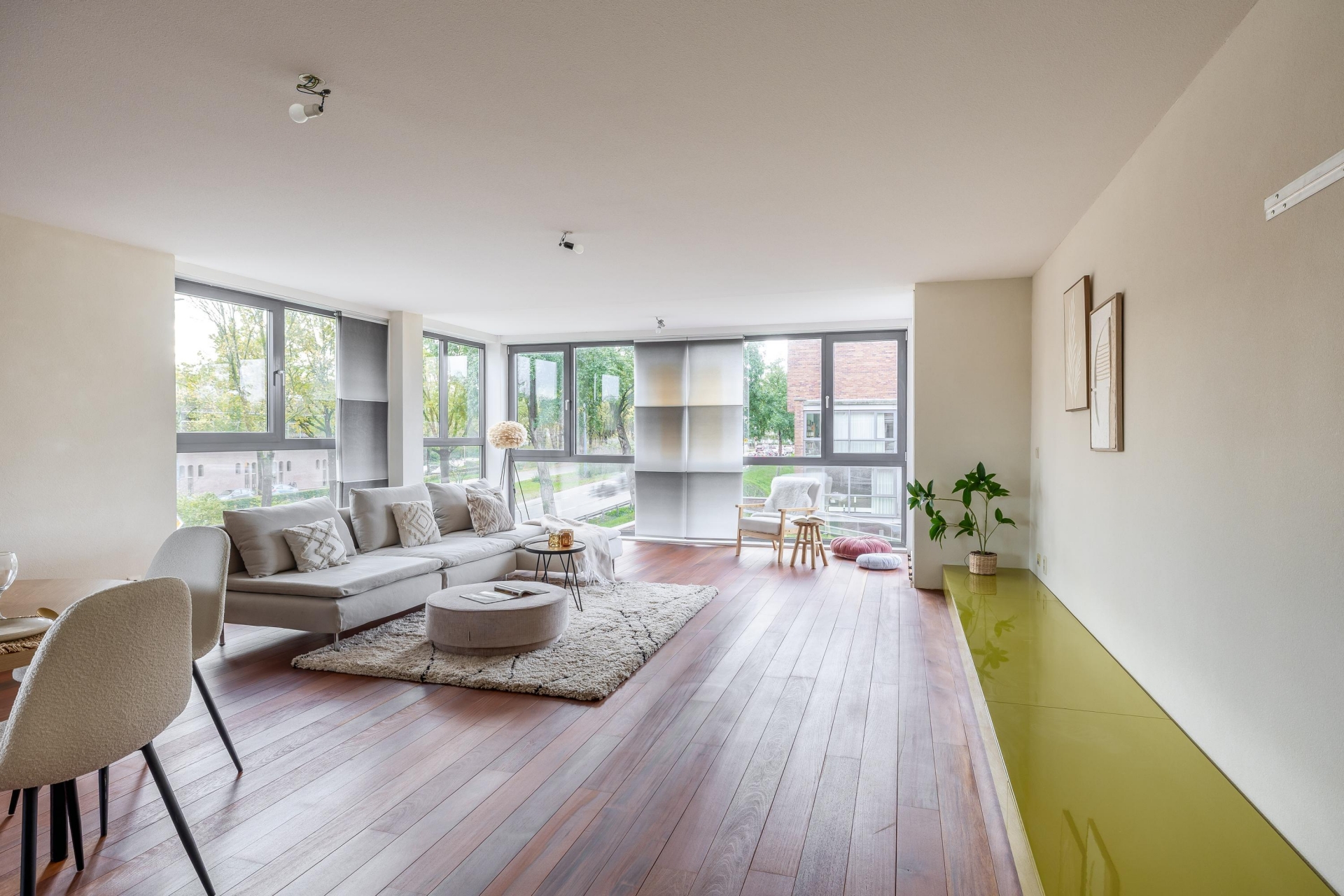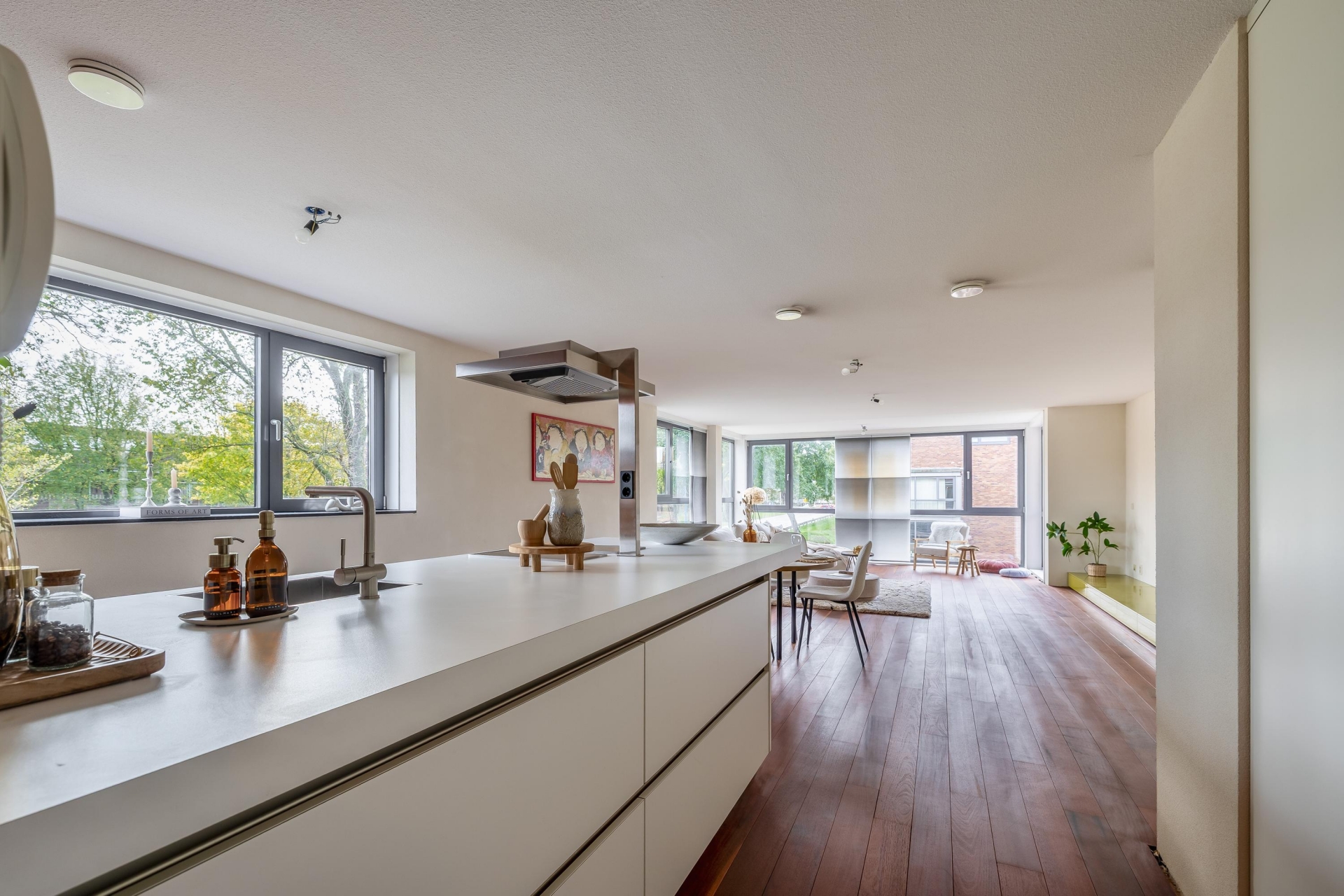 Zodra je binnenkomt, valt de hoogwaardige afwerking direct op. De hardhouten vloer loopt als een warme basis door het gehele appartement. De binnendeuren (slechts 2) zijn taats gescharnierd en voorzien van verzonken grepen, een stijlvol detail dat zorgt voor een strakke en luxe uitstraling. De ruime living biedt volop mogelijkheden voor een gezellige zit- en eethoek en wordt van nature royaal verlicht door de vele ramen aan meerdere zijden. Hier ervaar je echt het loftgevoel: open, licht en ruim.