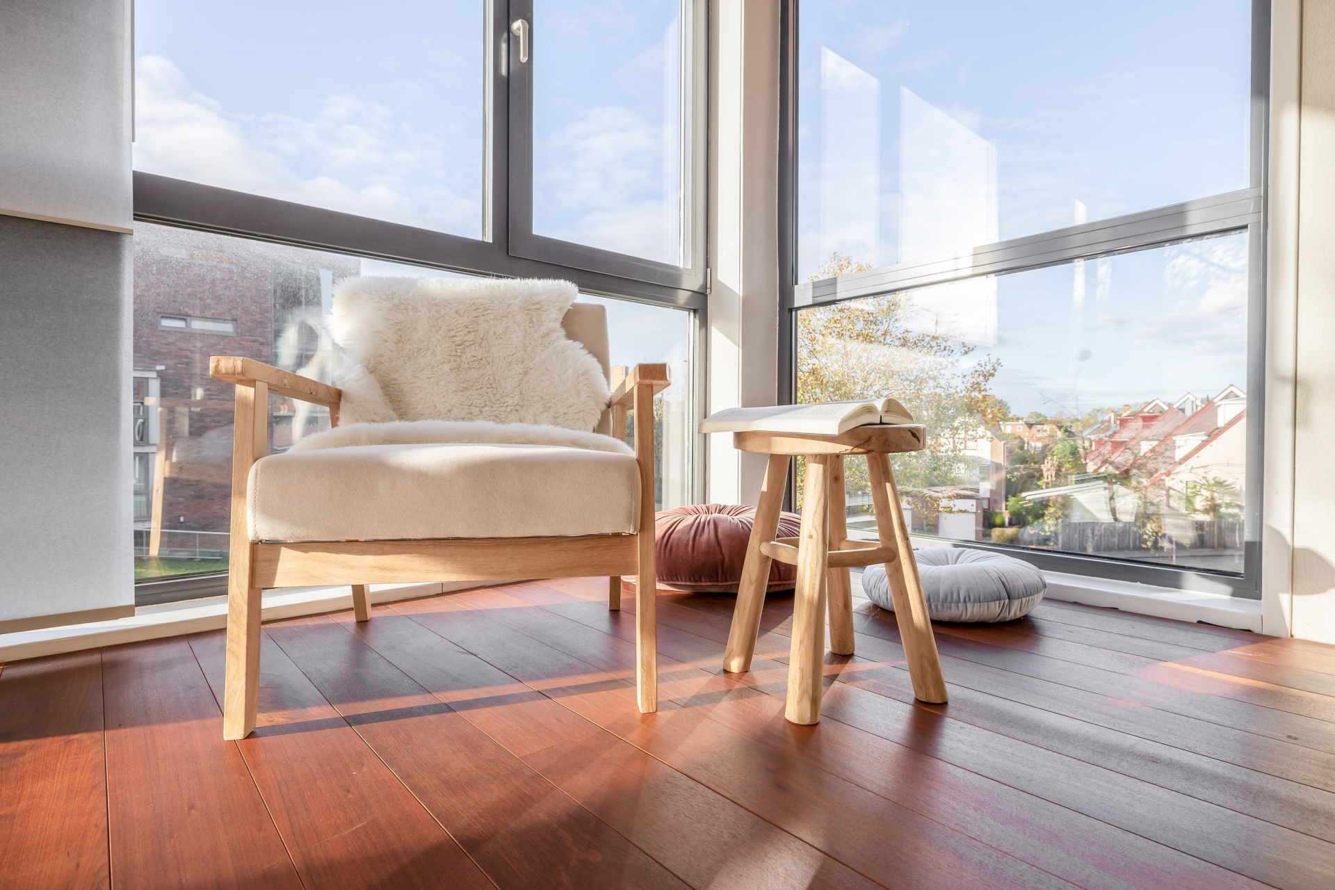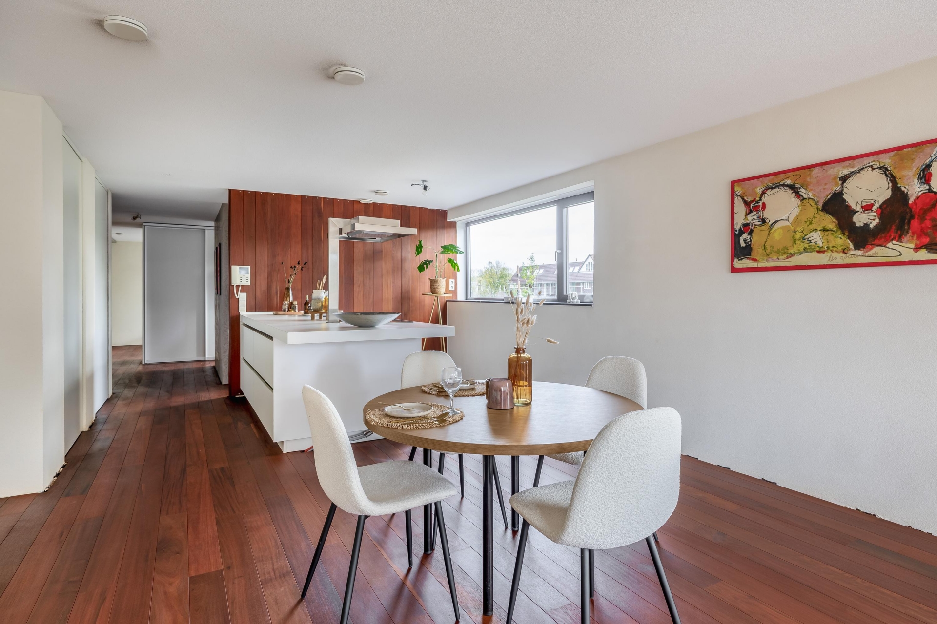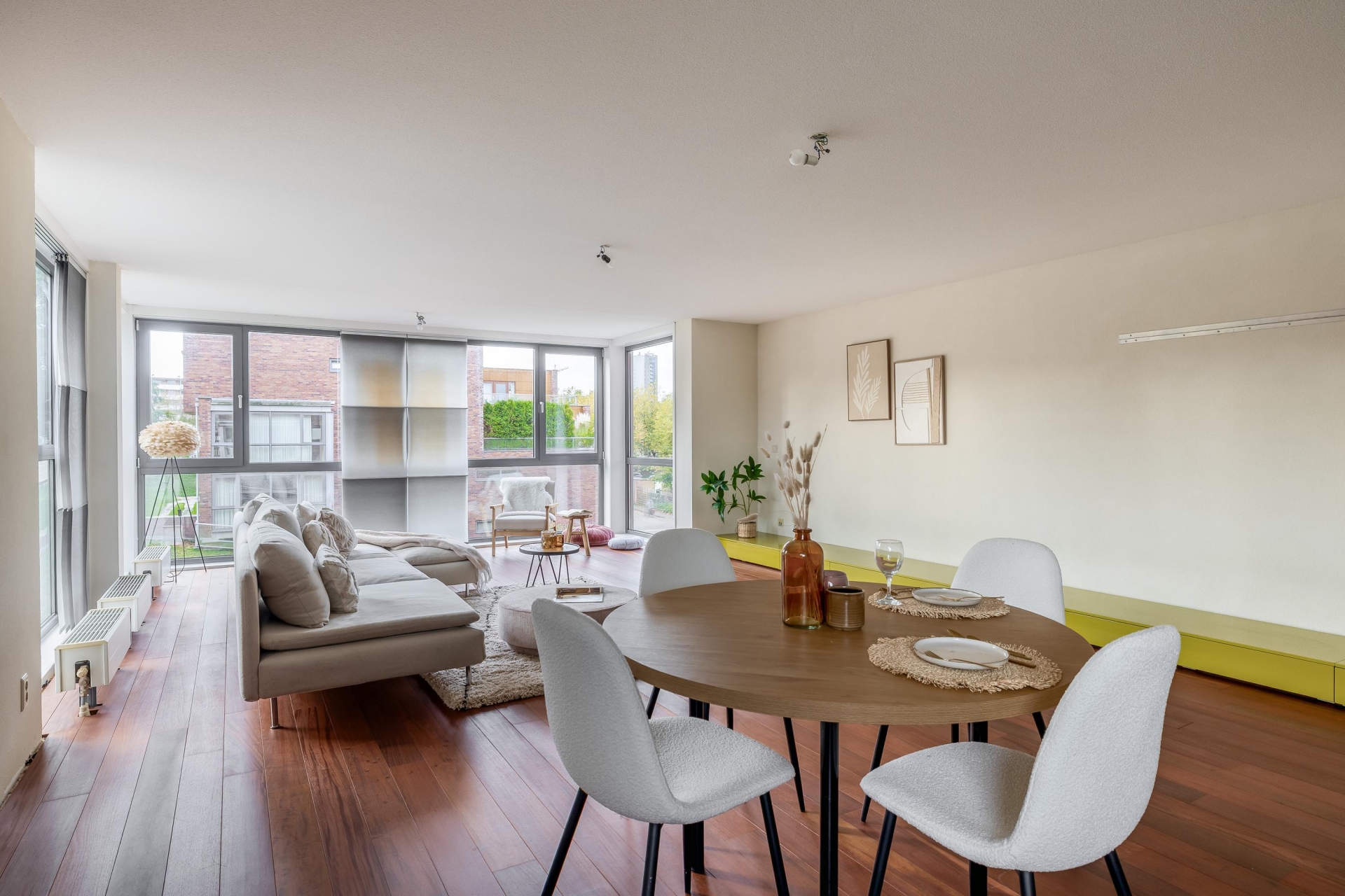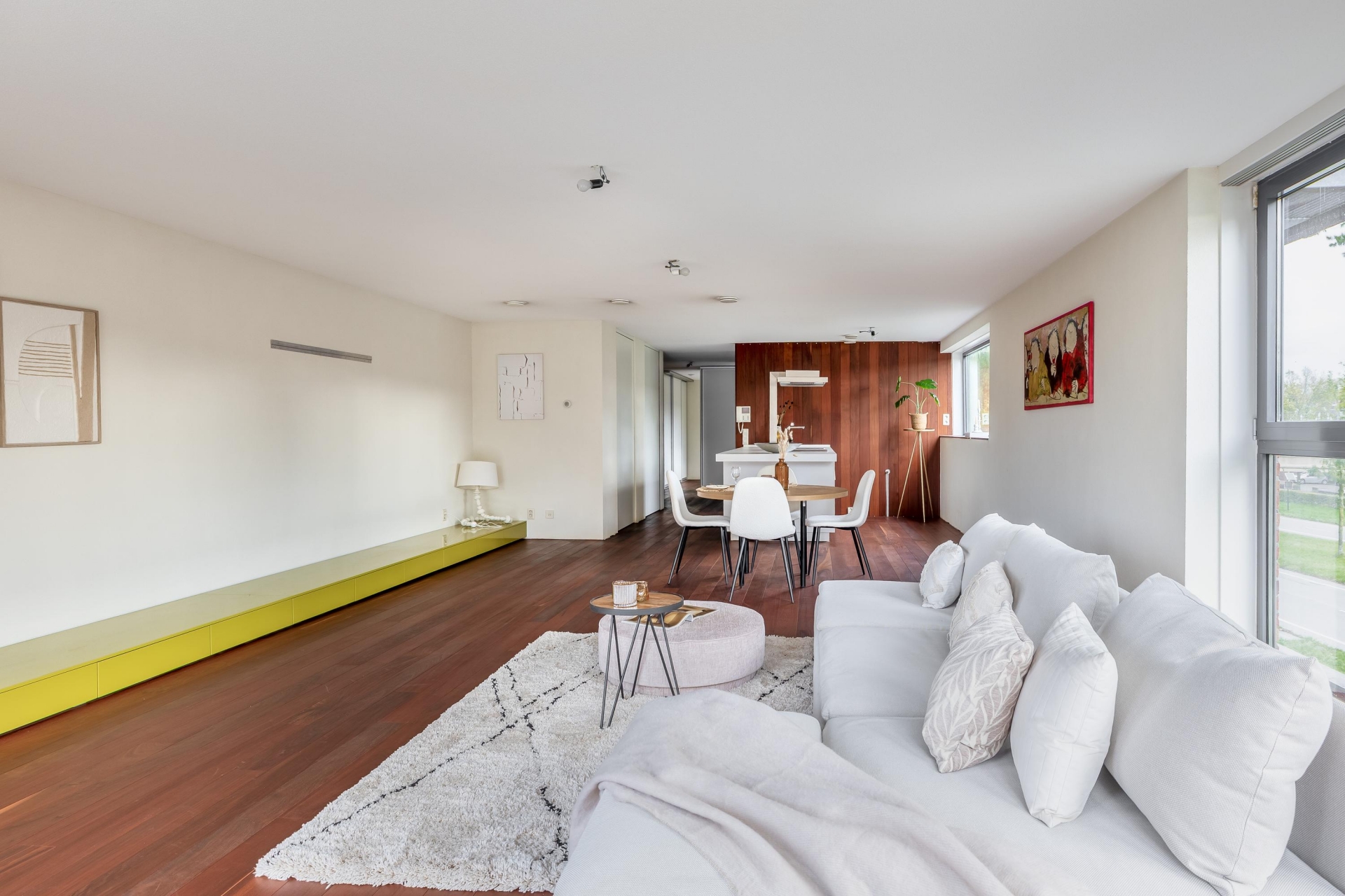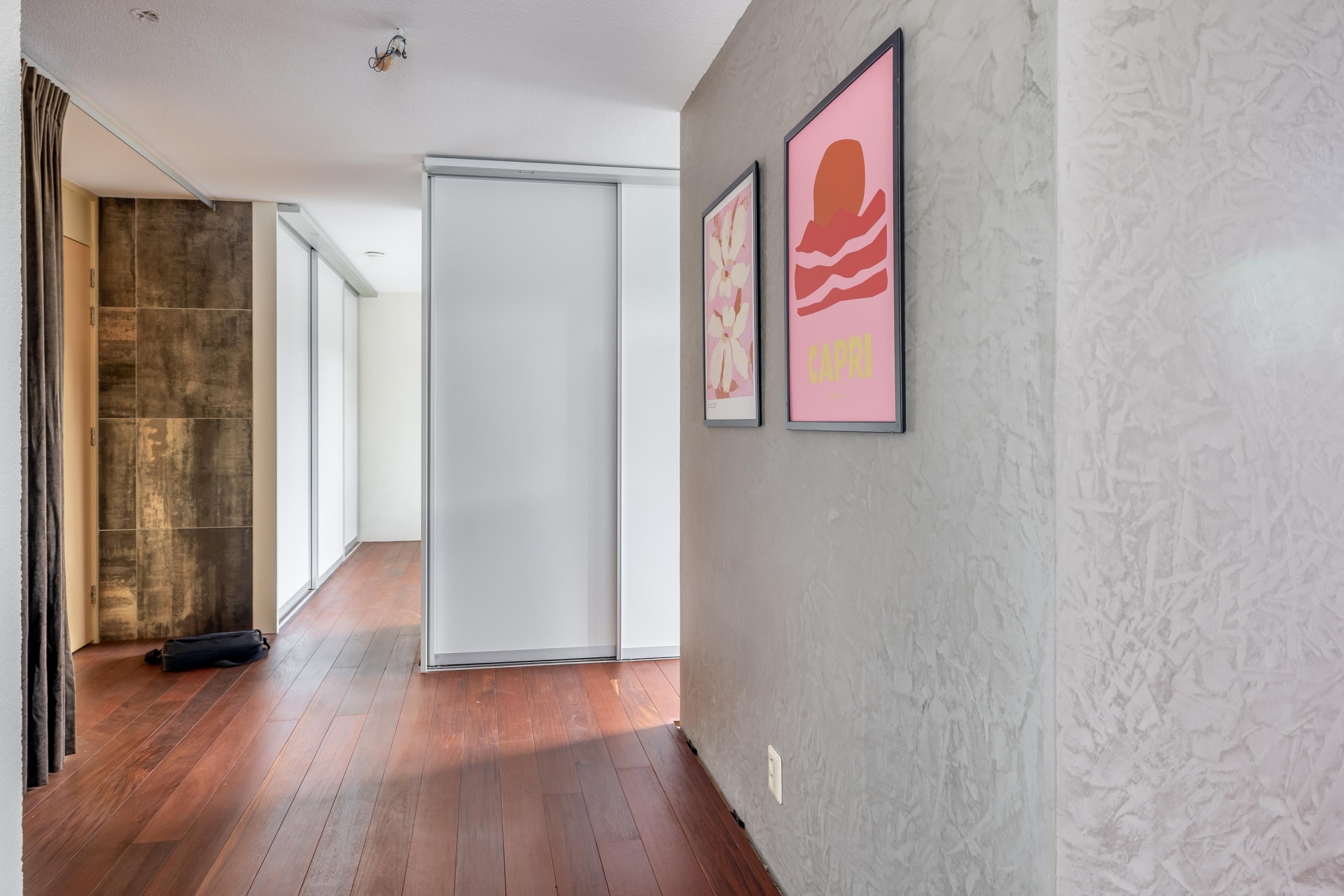 Zodra je binnenkomt, valt de hoogwaardige afwerking direct op. De hardhouten vloer loopt als een warme basis door het gehele appartement. De binnendeuren (slechts 2) zijn taats gescharnierd en voorzien van verzonken grepen, een stijlvol detail dat zorgt voor een strakke en luxe uitstraling. De ruime living biedt volop mogelijkheden voor een gezellige zit- en eethoek en wordt van nature royaal verlicht door de vele ramen aan meerdere zijden. Hier ervaar je echt het loftgevoel: open, licht en ruim.
