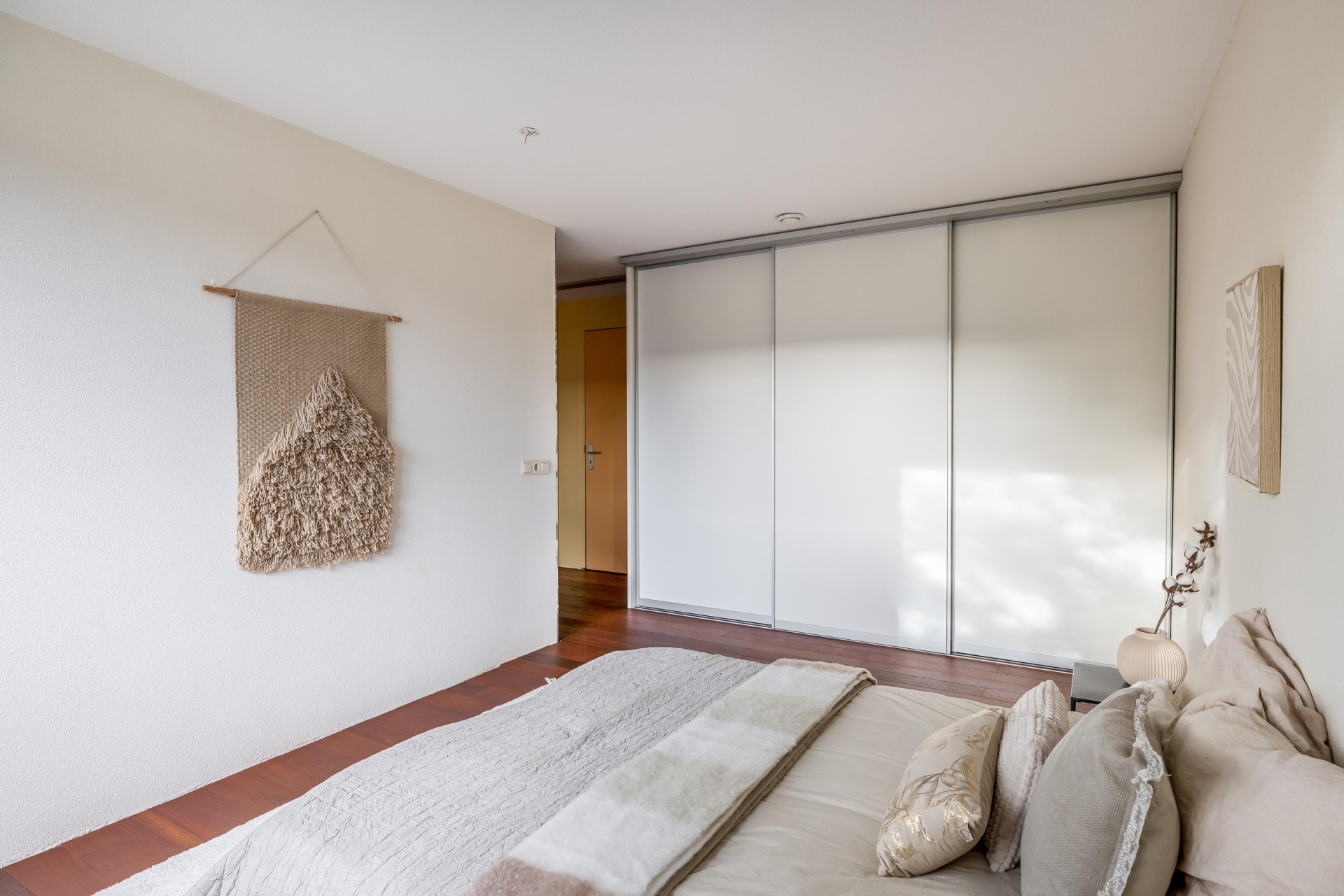 Met een woonoppervlakte van 102 m² heb je hier alle ruimte om comfortabel te wonen. Het appartement beschikt over één ruime slaapkamer, die zich uitstekend leent als master bedroom met een rustige uitstraling. De kamer is voorzien van luxe inbouwmaatkasten met geïntegreerde verlichting, perfect afgestemd op de strakke afwerking van de rest van het huis. Je kleding, schoenen en accessoires berg je hier stijlvol én overzichtelijk op.