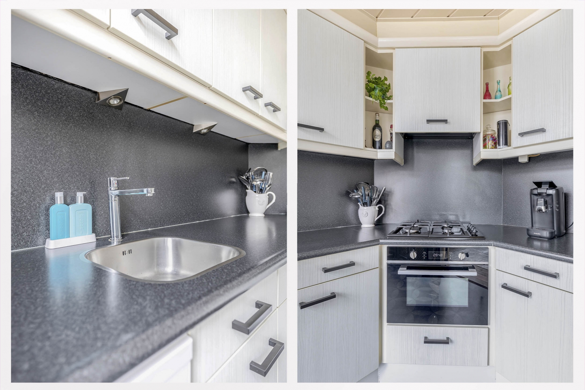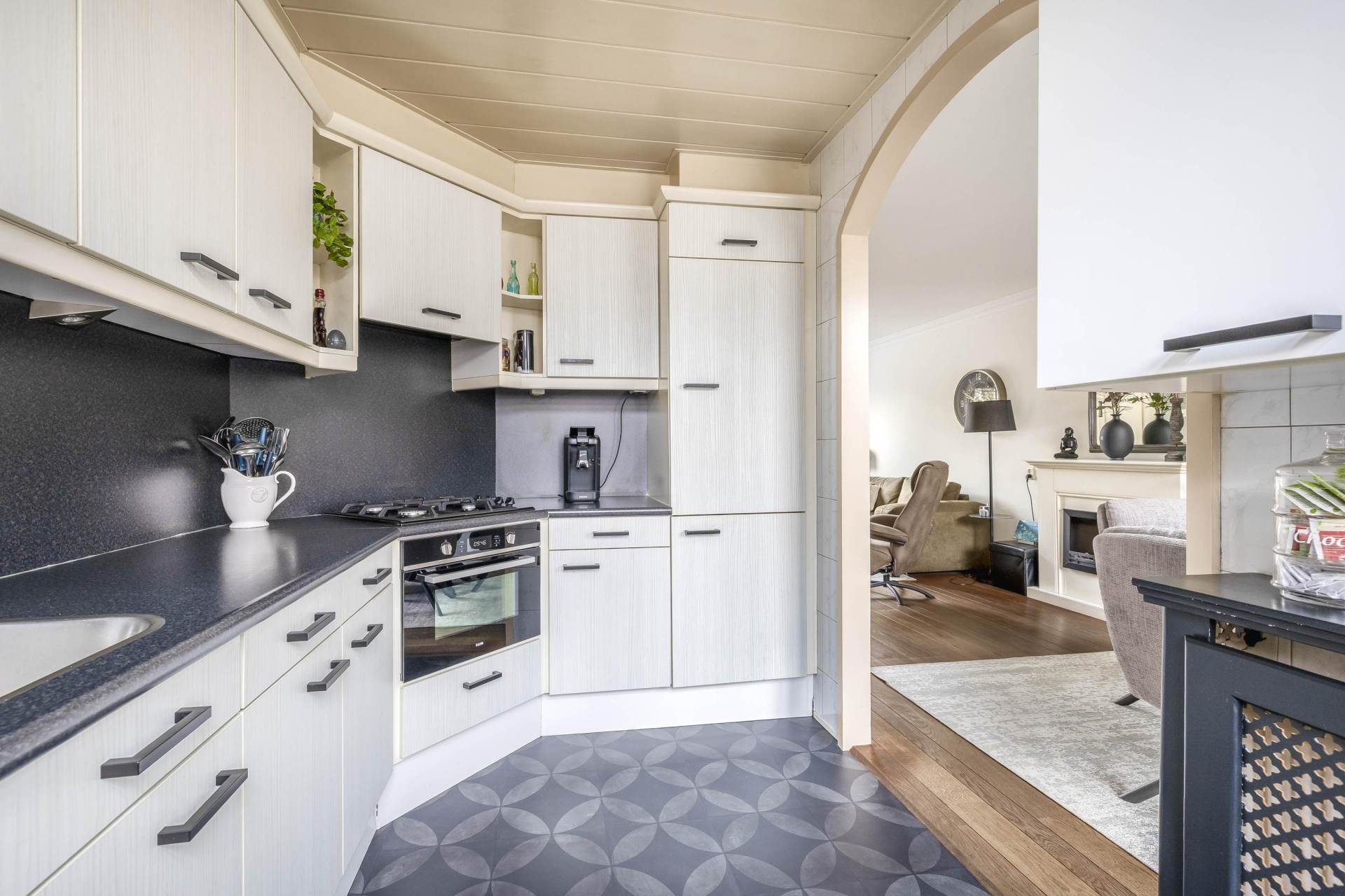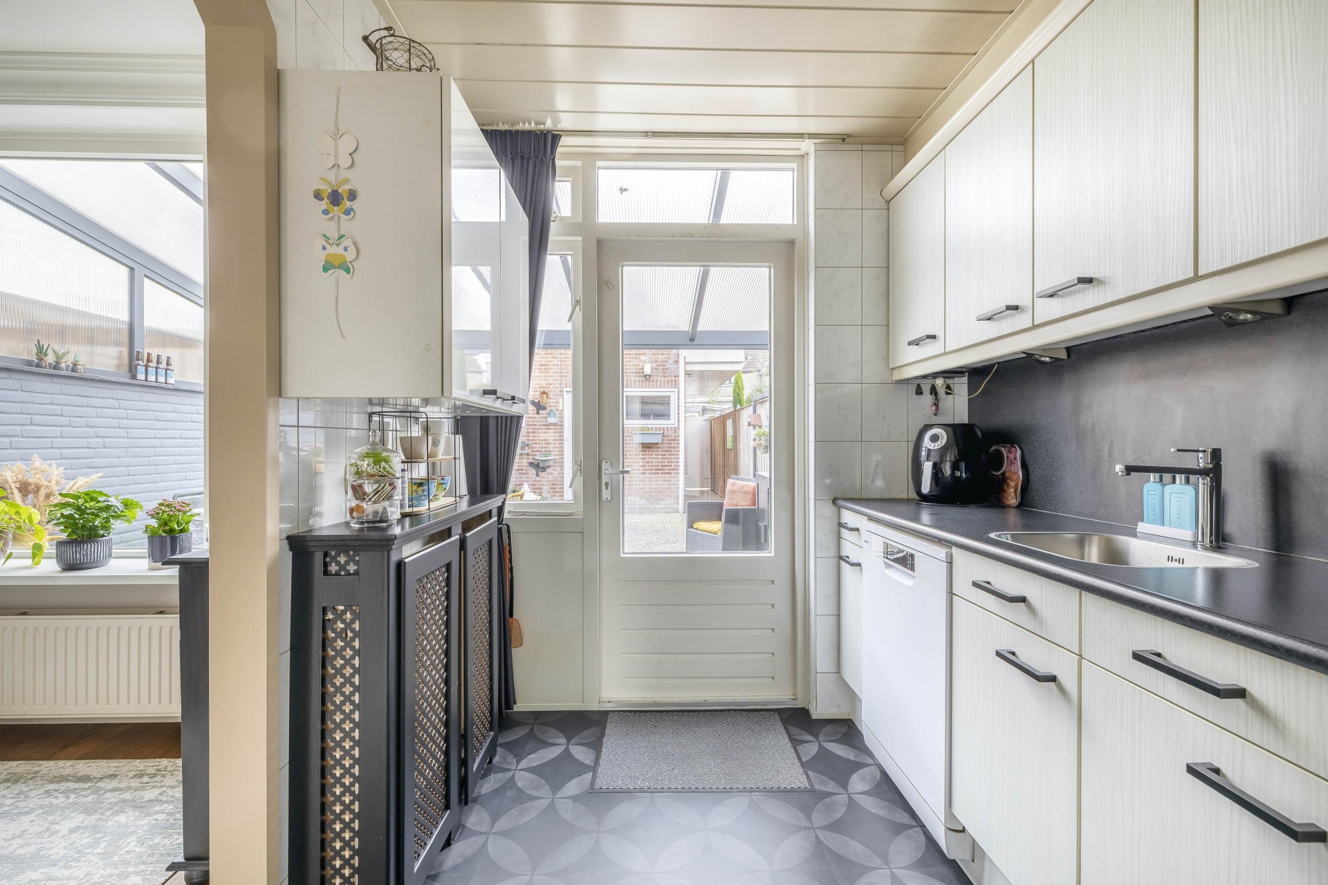 De keuken ligt aan de achterzijde van het huis en is praktisch ingericht met voldoende werk- en opbergruimte. Alles wat je nodig hebt is aanwezig en functioneel opgesteld, waardoor je hier prettig kunt koken.
