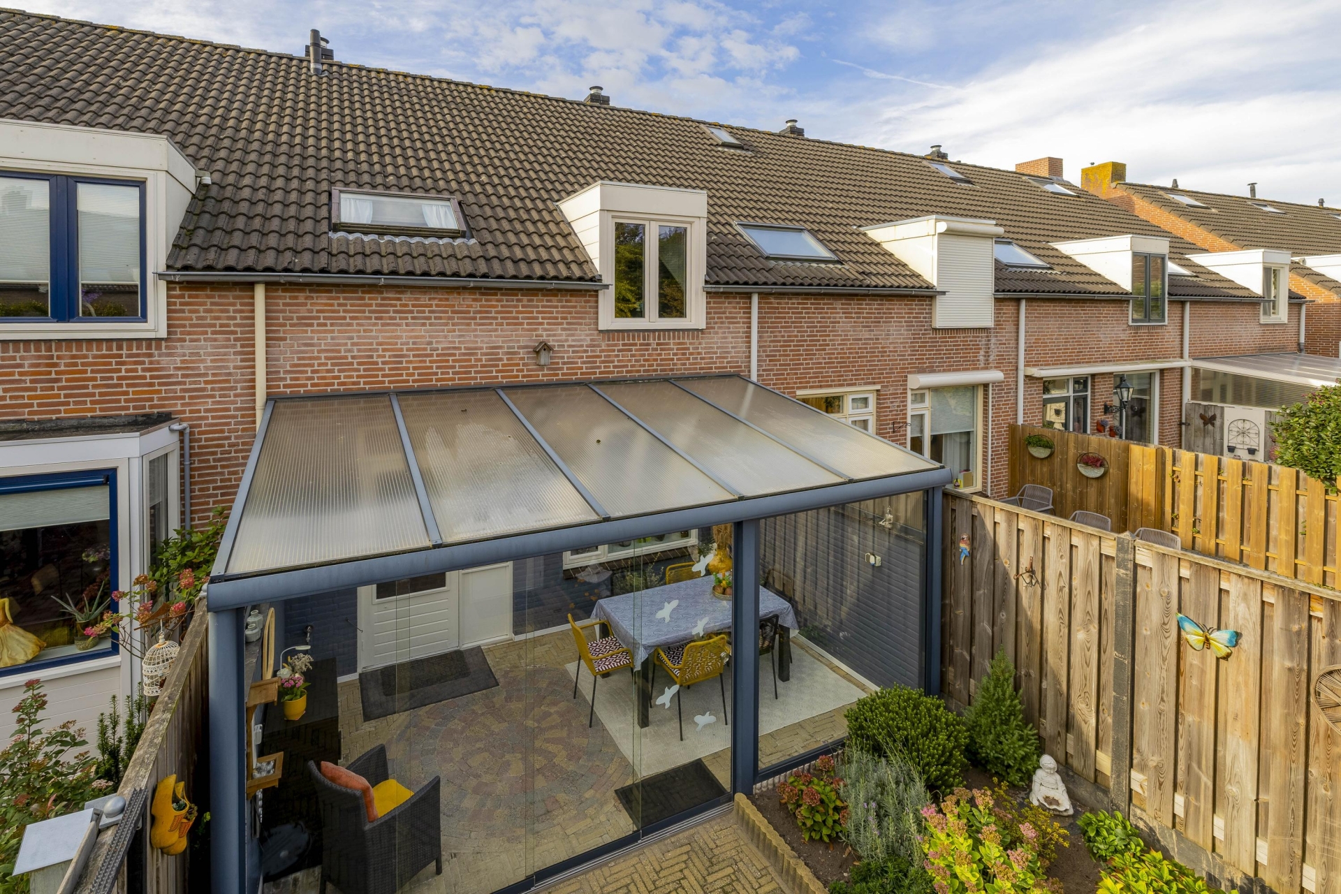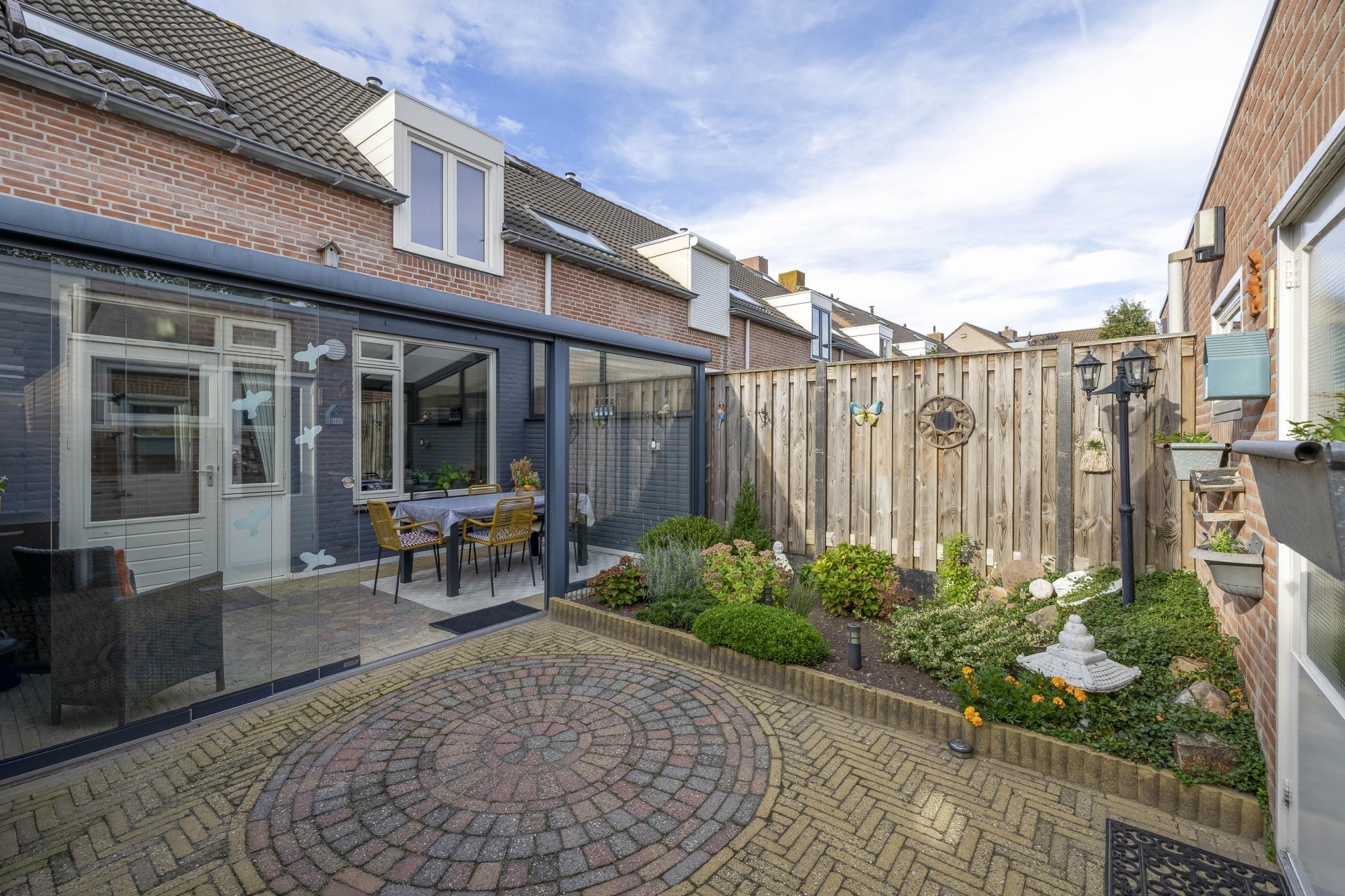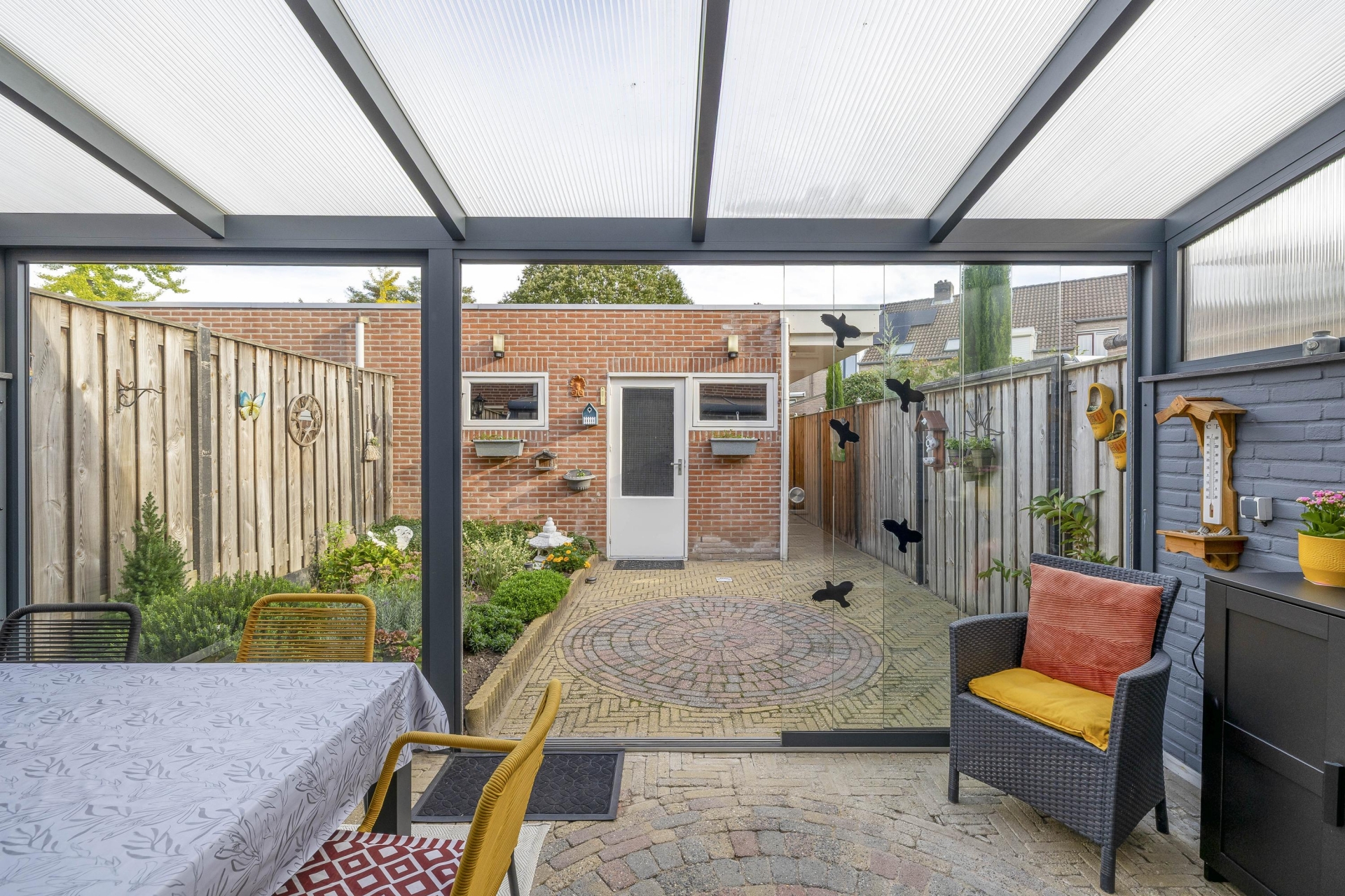 Vanuit de serre loop je zo de achtertuin in. De tuin is verzorgd aangelegd en biedt voldoende ruimte om buiten te zitten. Achterin vind je de vrijstaande garage, voorzien van een elektrische deur. Ideaal voor het stallen van een auto, fietsen of als extra bergruimte.