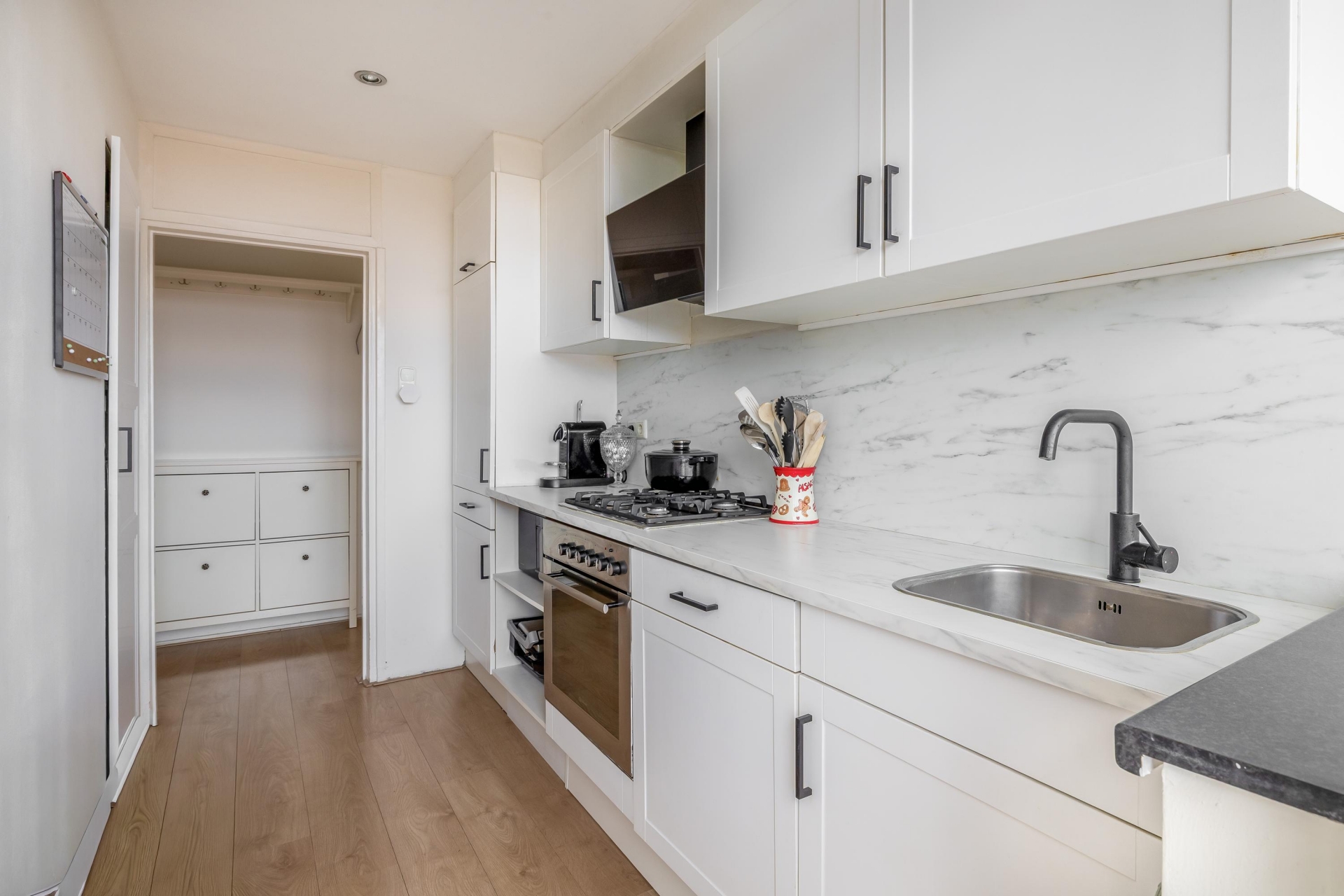 Allereerst is daar de keuken (6m²): Een dichte keuken met daarin een recht keukenblok, voorzien van diverse inbouw apparatuur (fornuis, afzuigkap, koel- vries combinatie, vaatwasser en oven).