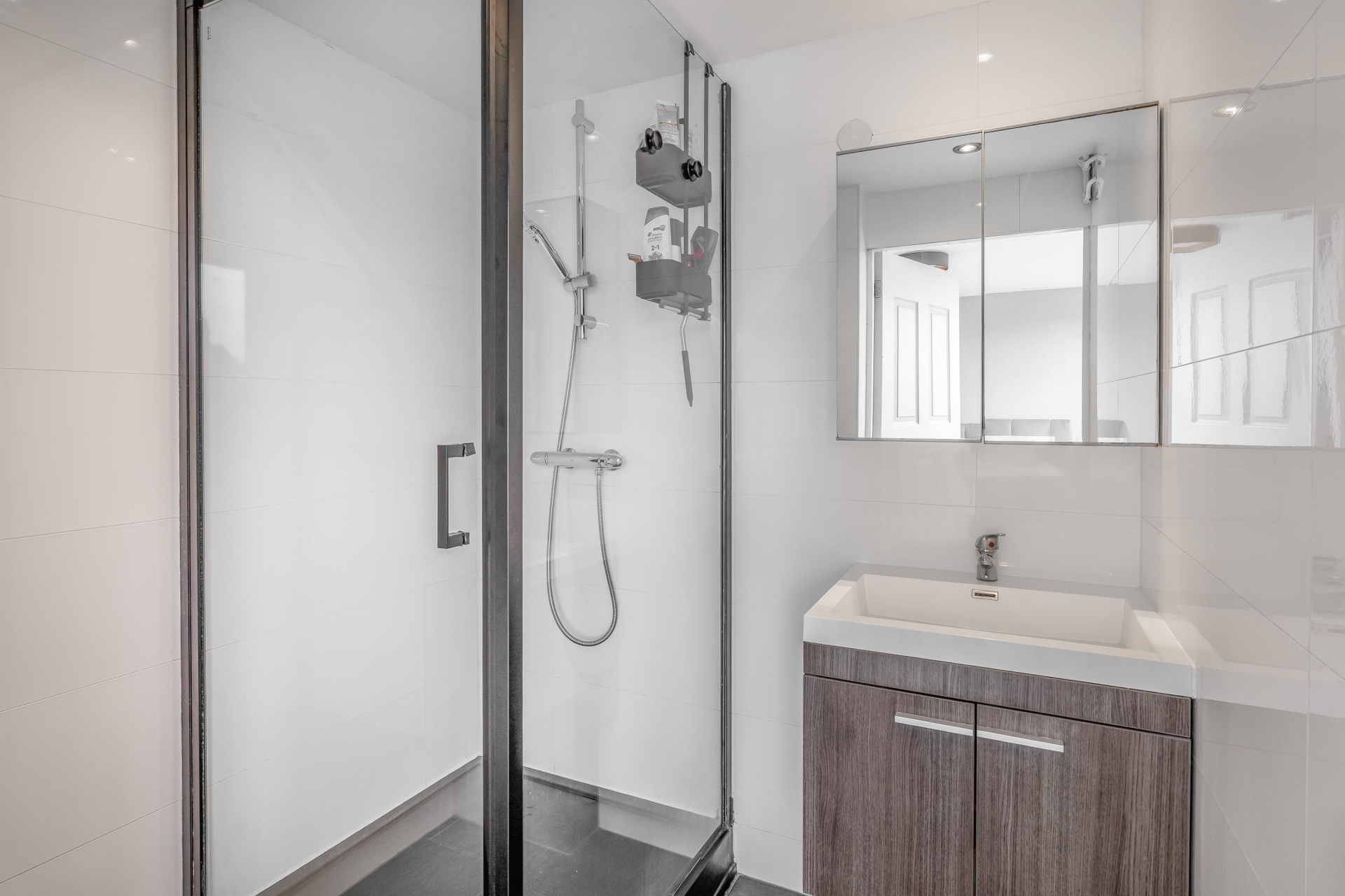 Deze badkamer meet ca. 3m² en is voorzien van een wastafelmeubel en een douche cabine (vernieuwd in 2022).