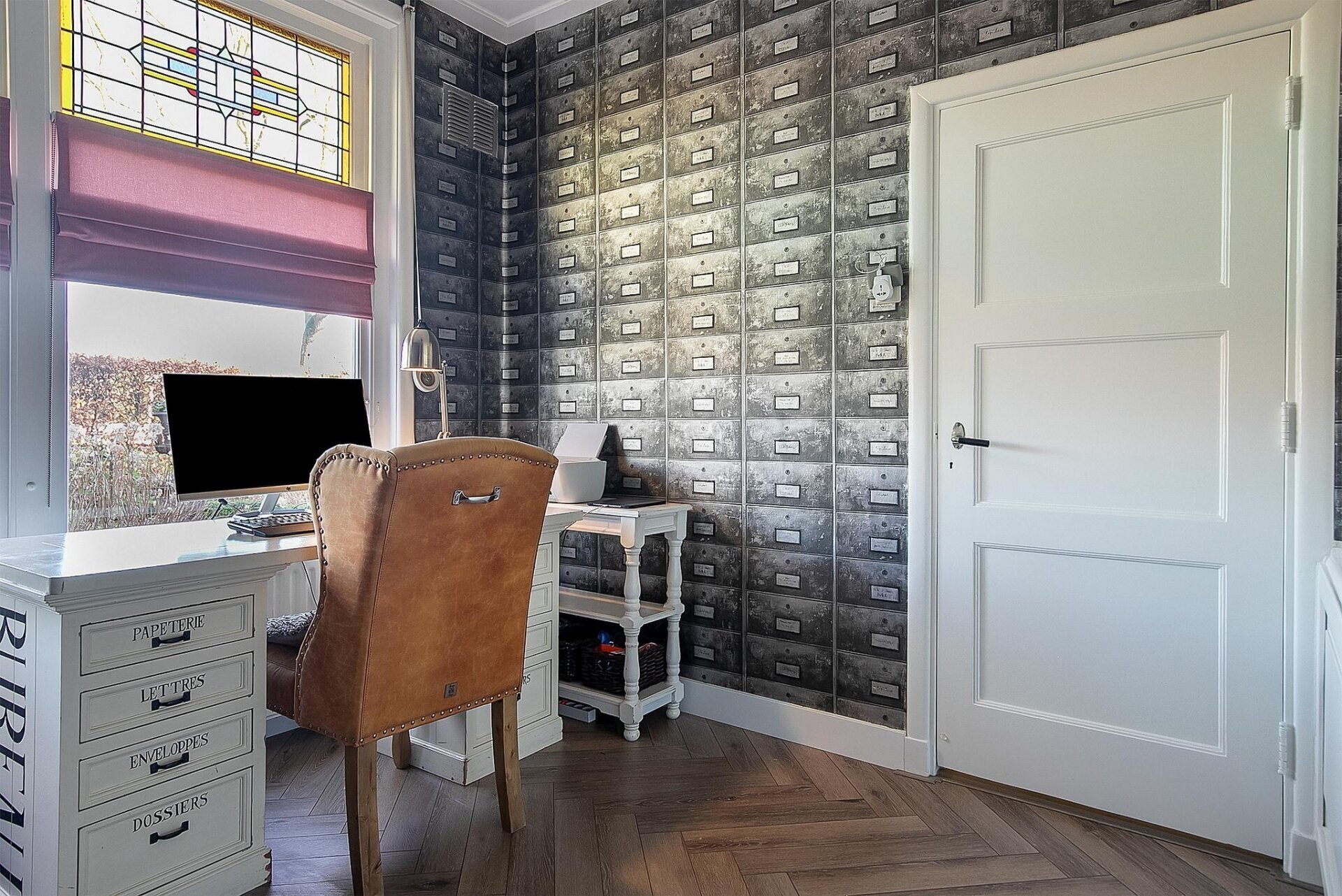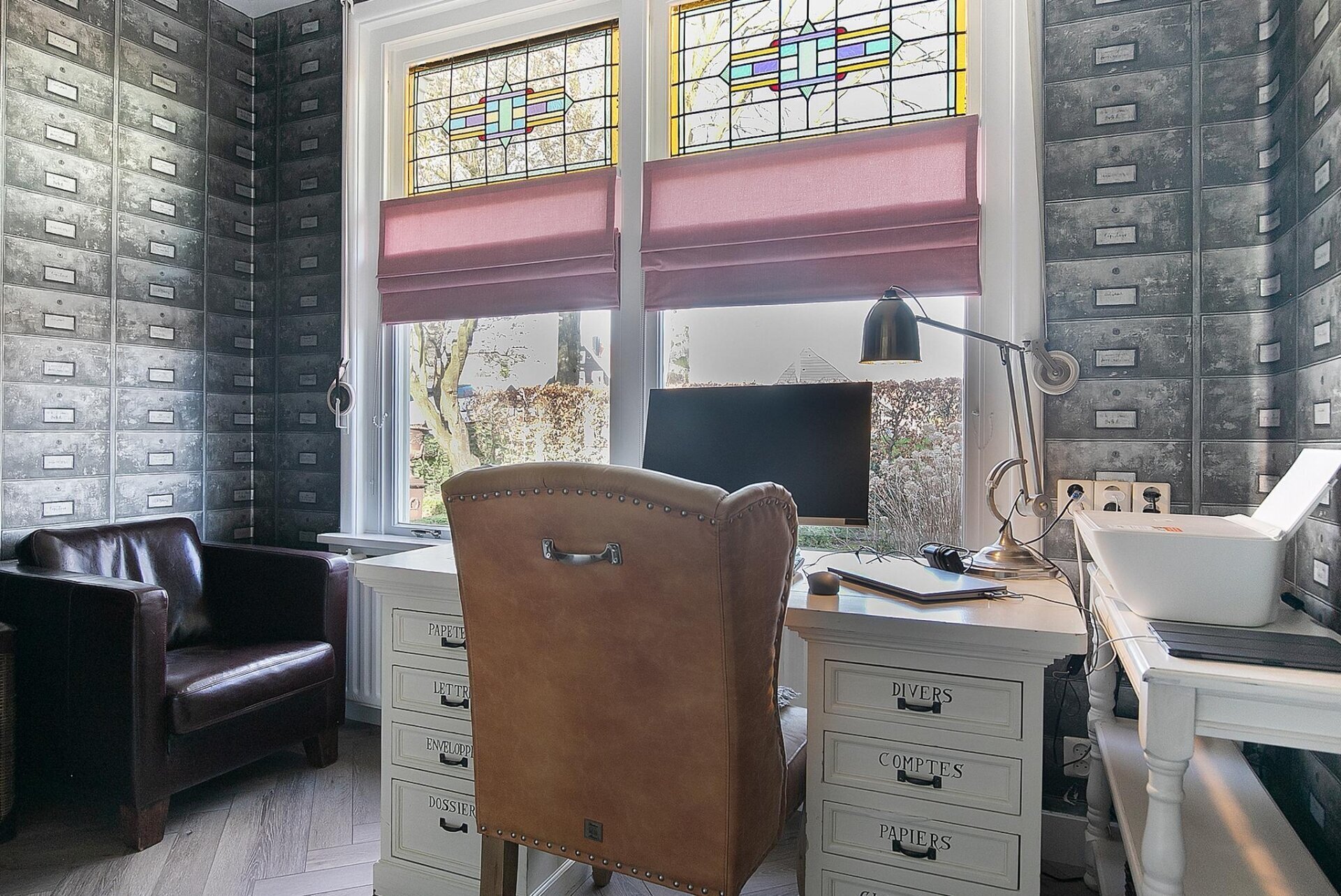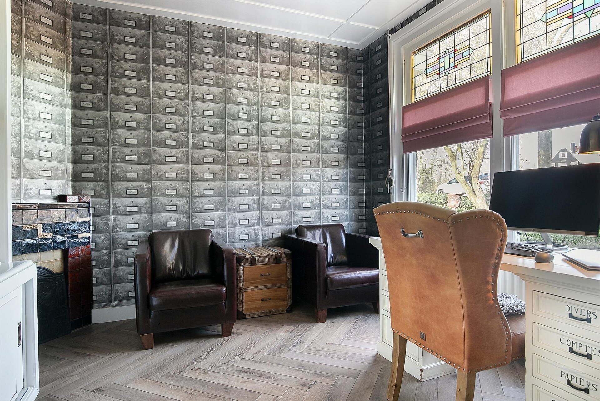 Op de begane grond tref je een riante woonkamer met sfeervolle haardpartij en prachtig zicht op de straat. De fraaie visgraat pvc-vloer, het originele houtwerk en de lichtinval via glas-in-lood geven deze ruimte een warme uitstraling. De werkkamer aan de voorzijde biedt een rustige thuiswerkplek met een knipoog naar het verleden.