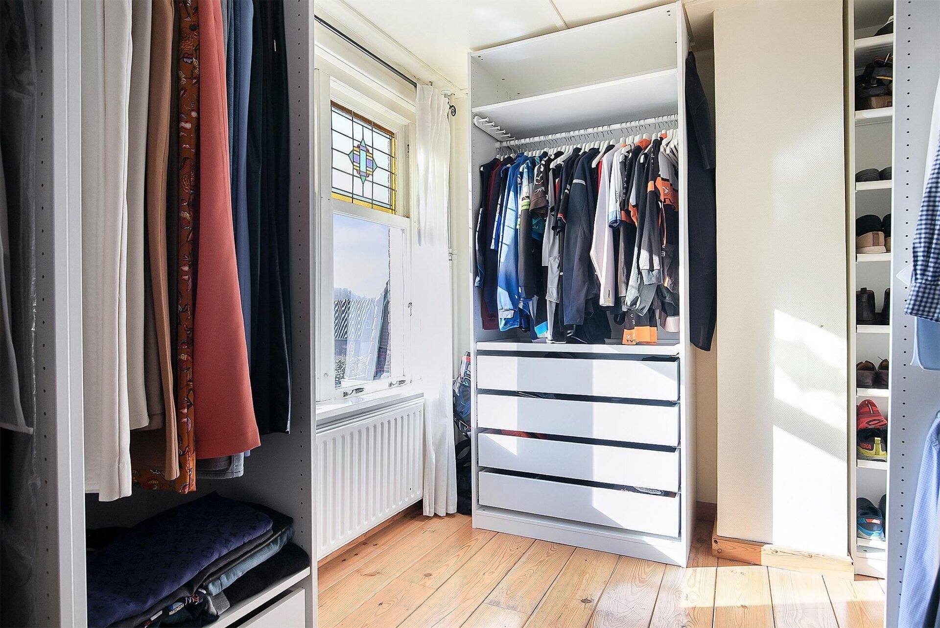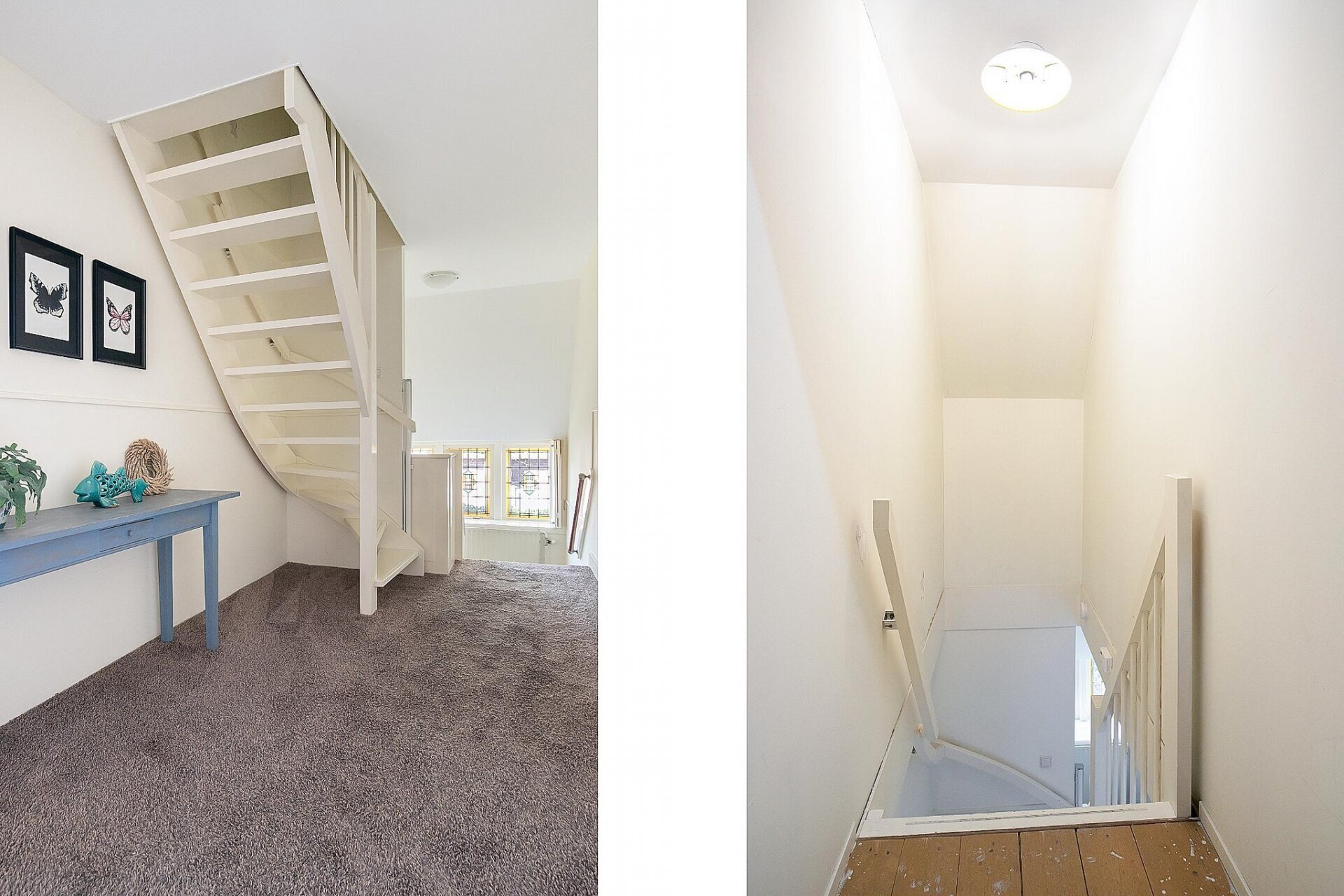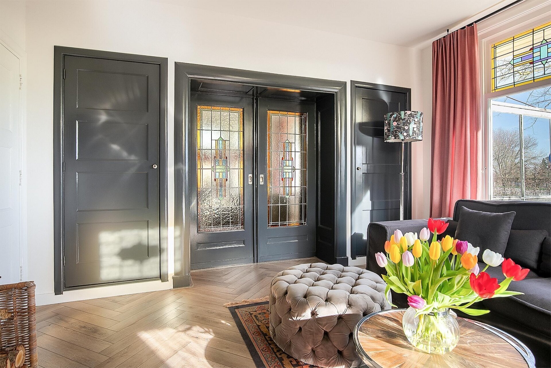 Op de begane grond tref je een riante woonkamer met sfeervolle haardpartij en prachtig zicht op de straat. De fraaie visgraat pvc-vloer, het originele houtwerk en de lichtinval via glas-in-lood geven deze ruimte een warme uitstraling. De werkkamer aan de voorzijde biedt een rustige thuiswerkplek met een knipoog naar het verleden.