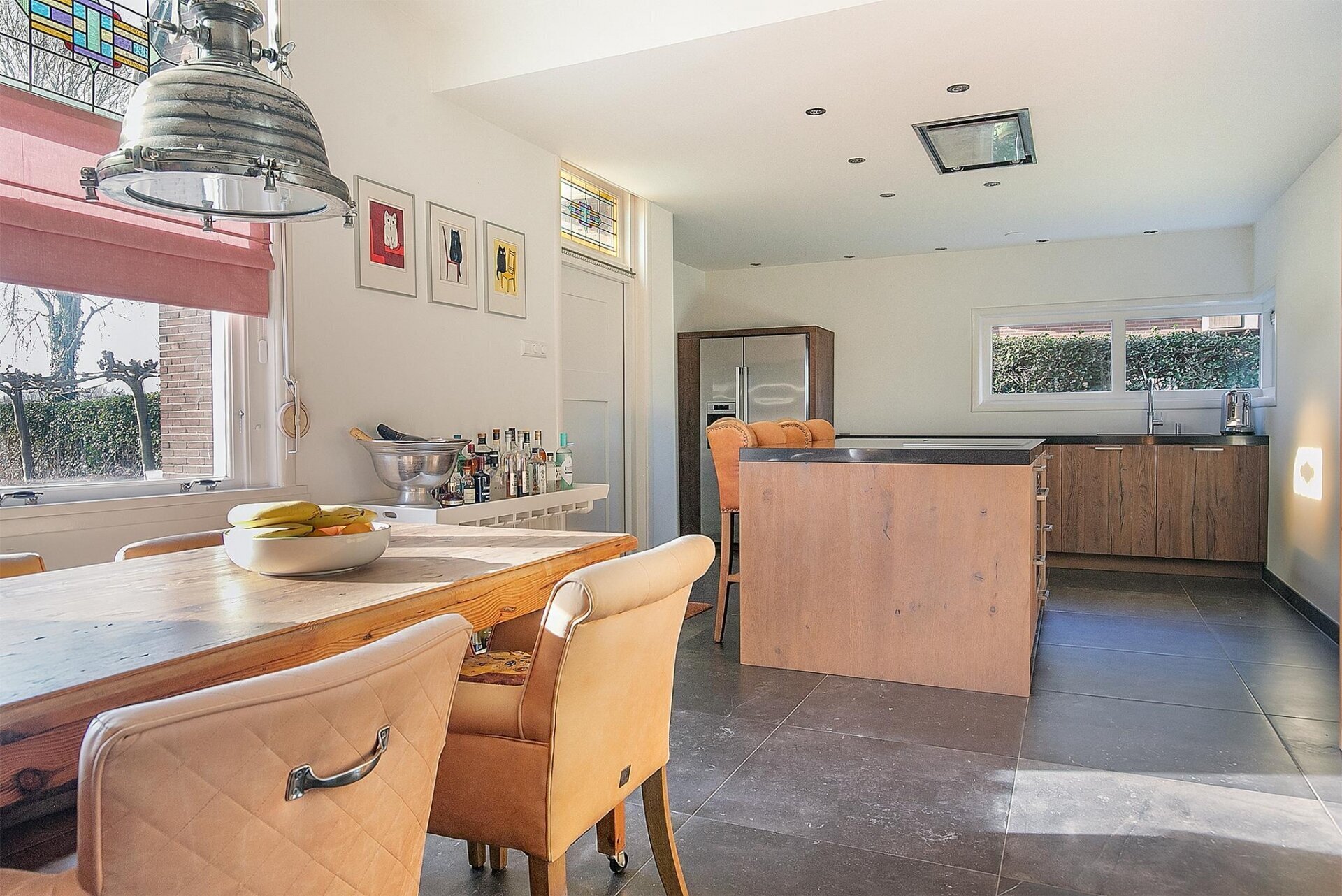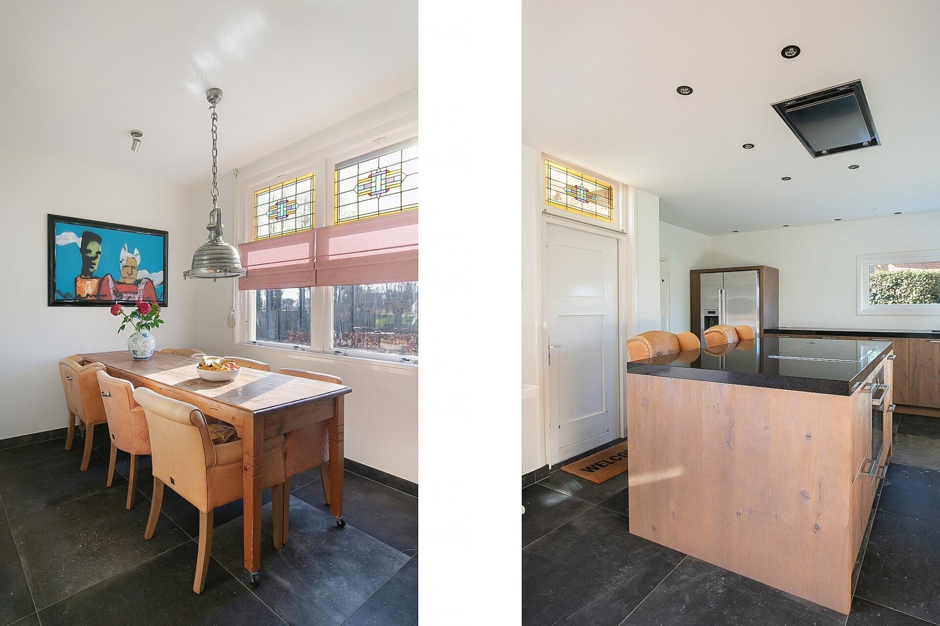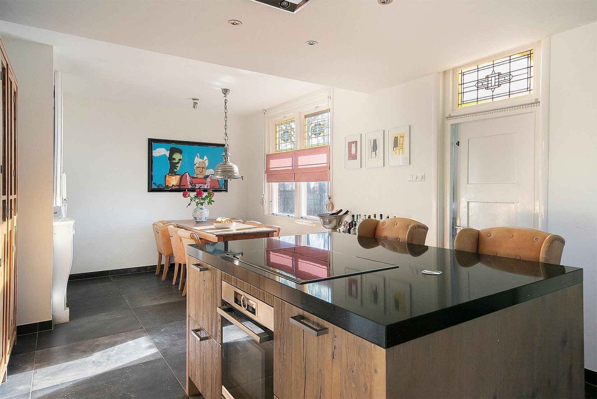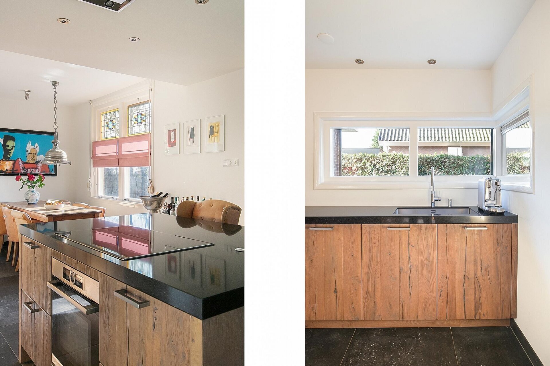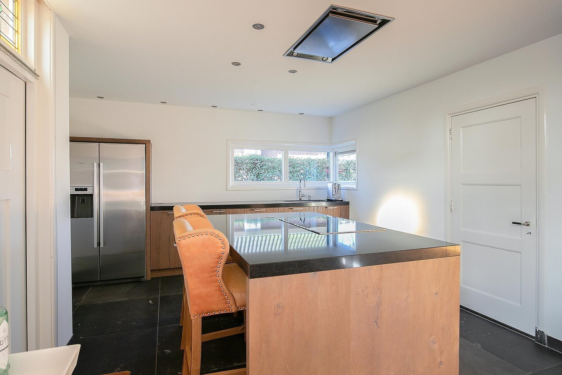 De leefkeuken vormt het hart van dit huis. In 2017 is deze ruimte volledig vernieuwd, met behoud van karakteristieke elementen. Denk aan een strakke plavuizen vloer met vloerverwarming, glas-in-lood bovenlichten en een royaal kookeiland als blikvanger. Uiteraard is de keuken voorzien van alle moderne inbouwapparatuur zoals een inductiekookplaat, combi-oven, Amerikaanse koel-vriescombinatie, Quooker en vaatwasser. Vanuit de keuken heb je toegang tot de kelder, bijkeuken én de inpandige garage met zolderberging – ideaal voor hobbyruimte of opslag.