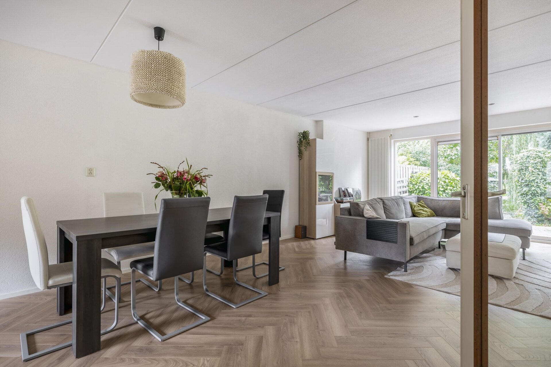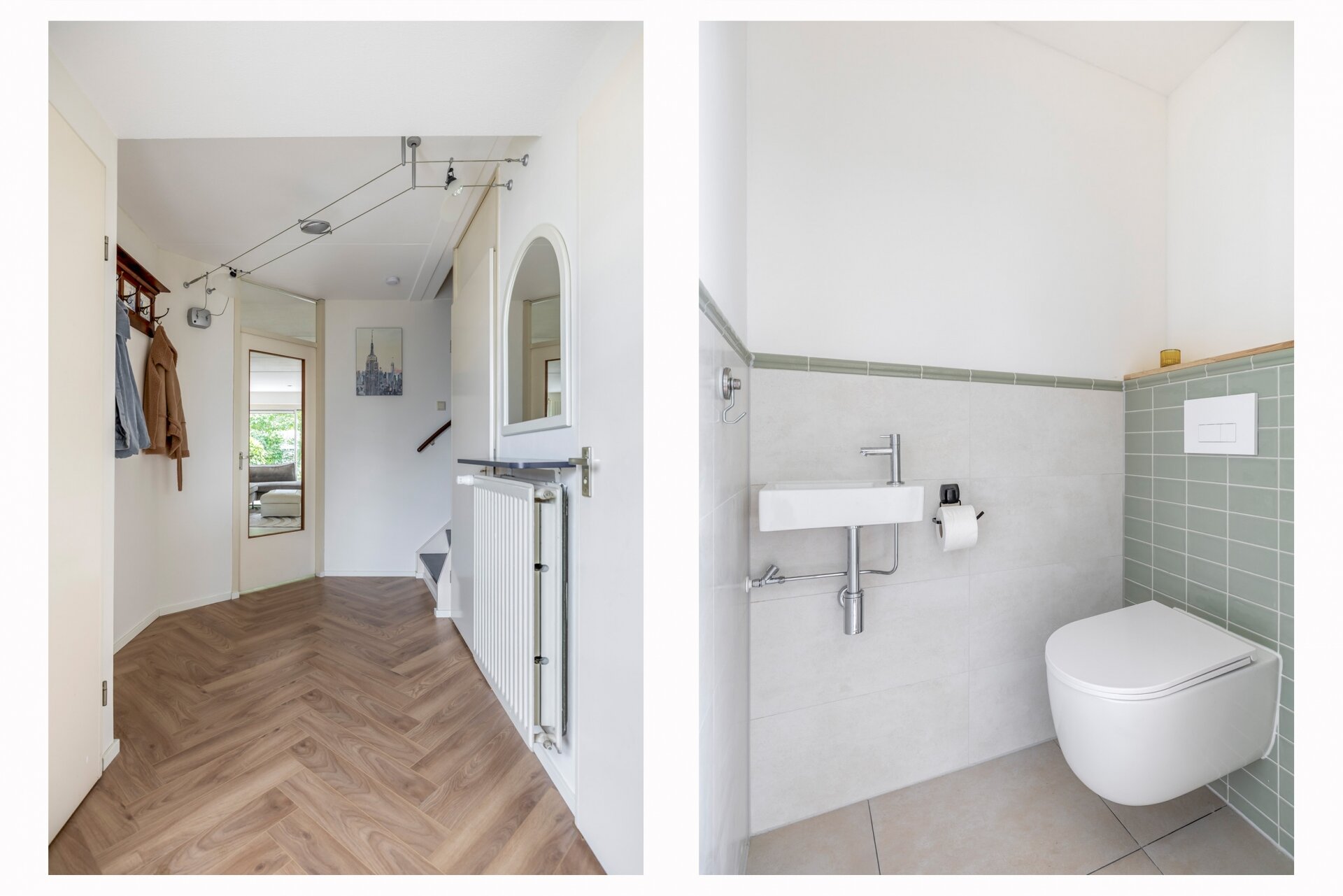 Met uitzondering van de berging en de natte ruimtes, is er op de begane grond en eerste etage een fraaie laminaat vloer in visgraat motief gelegd.
