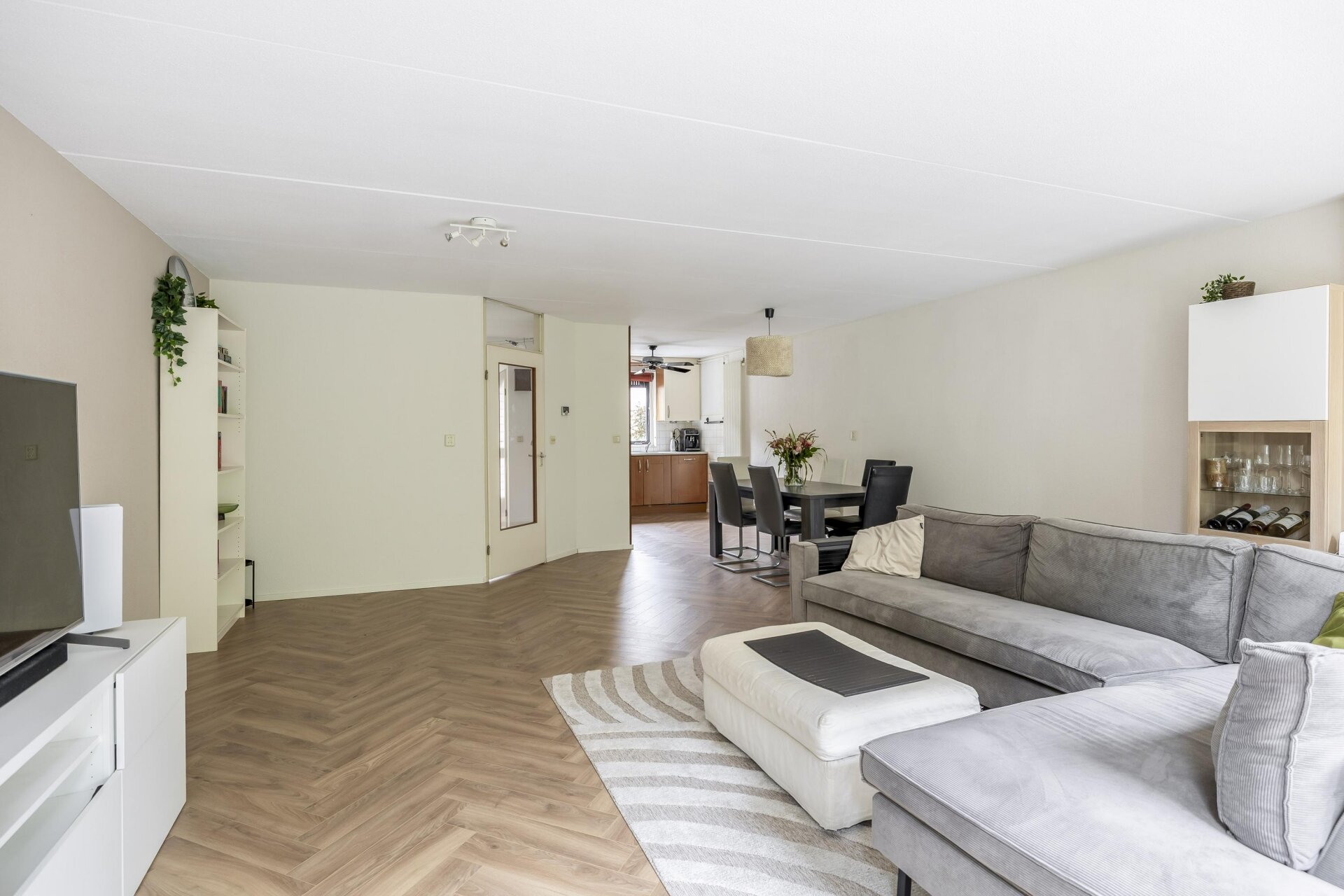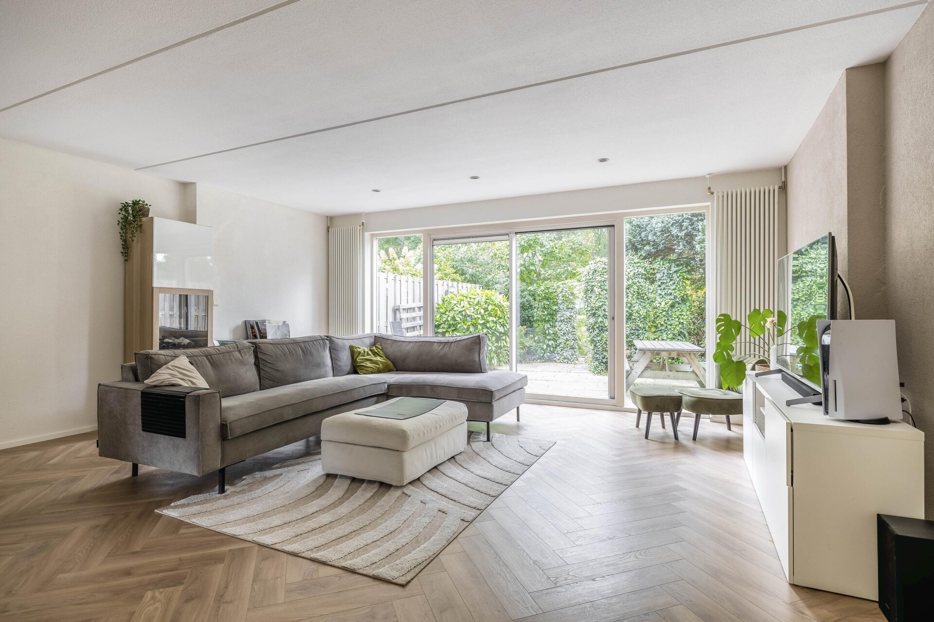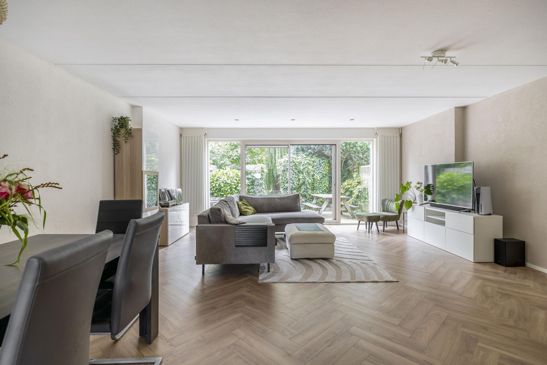 De living is opgedeeld in een ruime, uitgebouwde woonkamer (40m²) met schuifpui naar de achtertuin en een keuken (8m²).