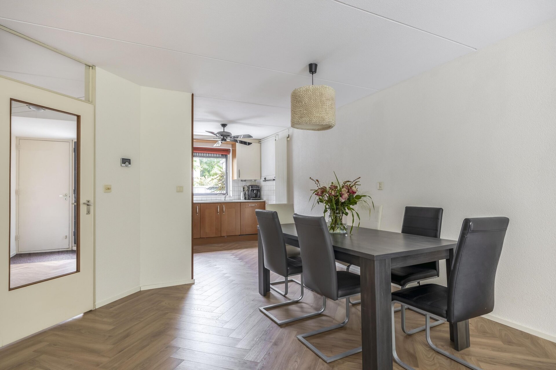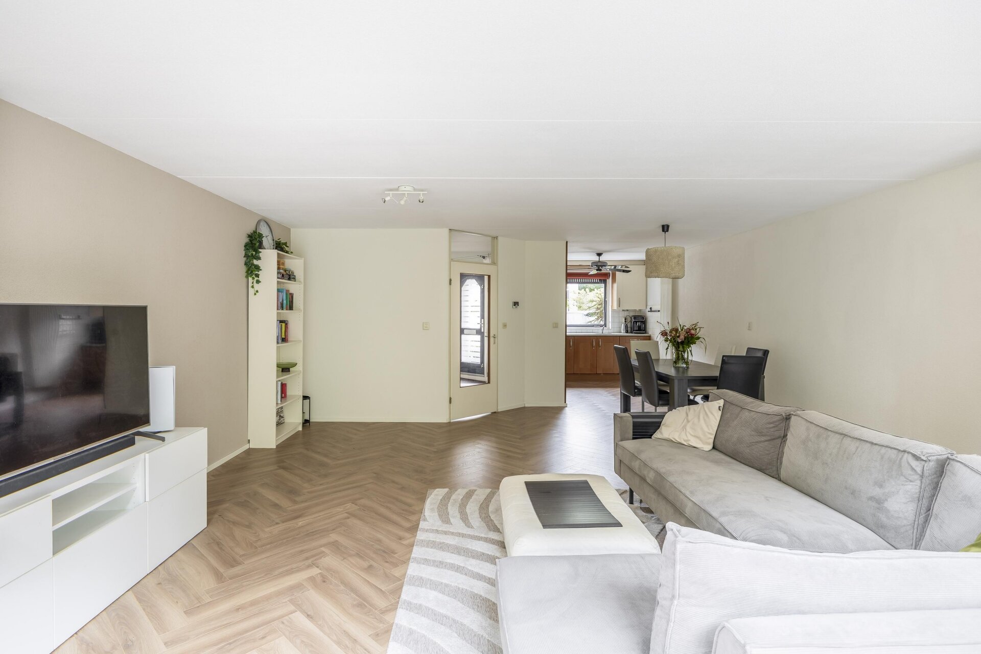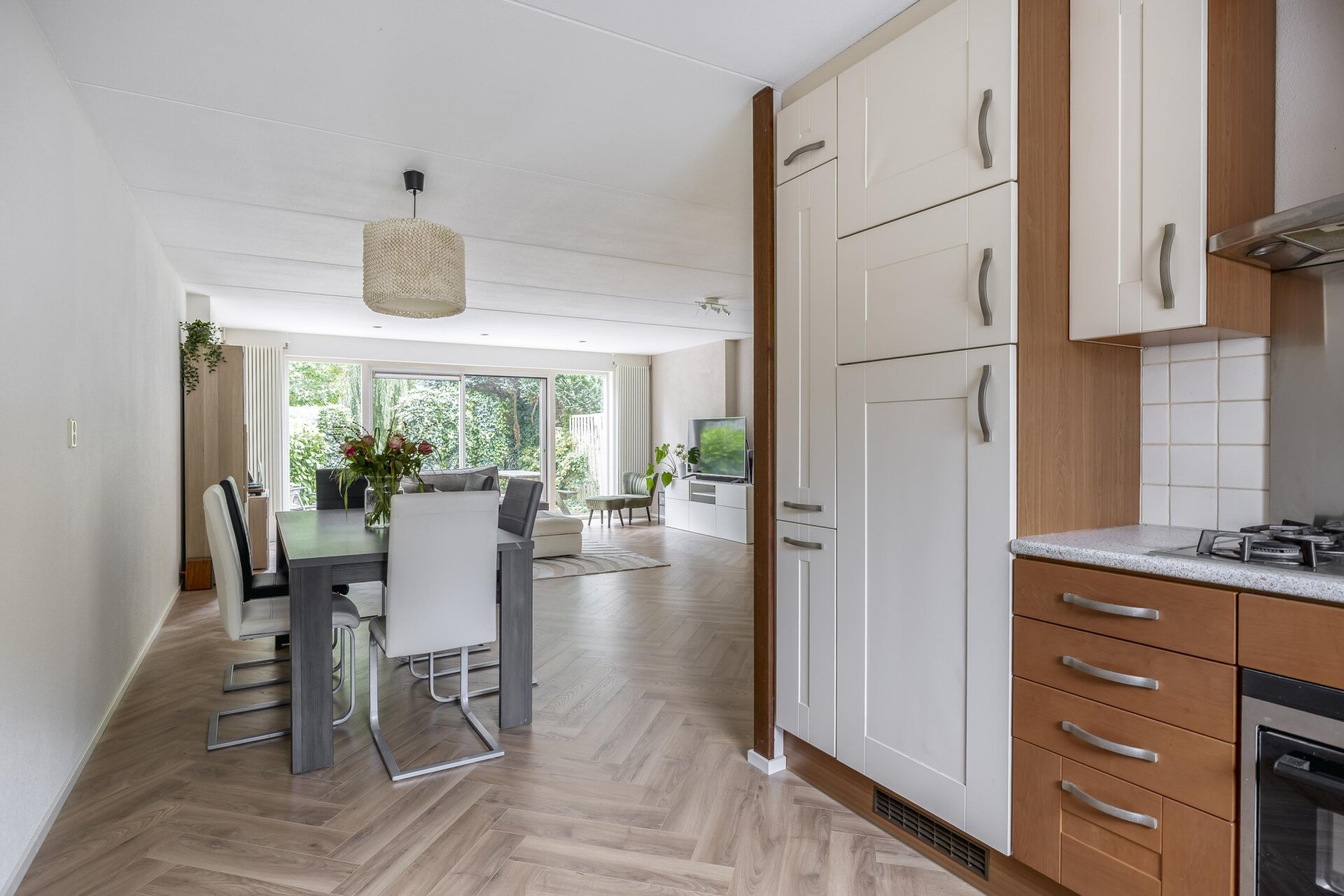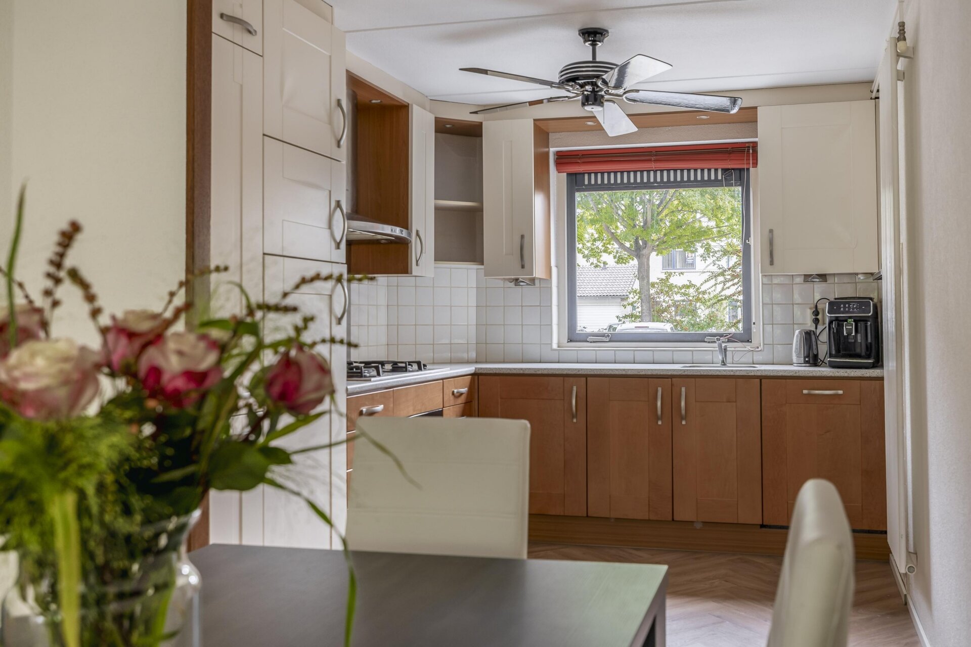 De living is opgedeeld in een ruime, uitgebouwde woonkamer (40m²) met schuifpui naar de achtertuin en een keuken (8m²).