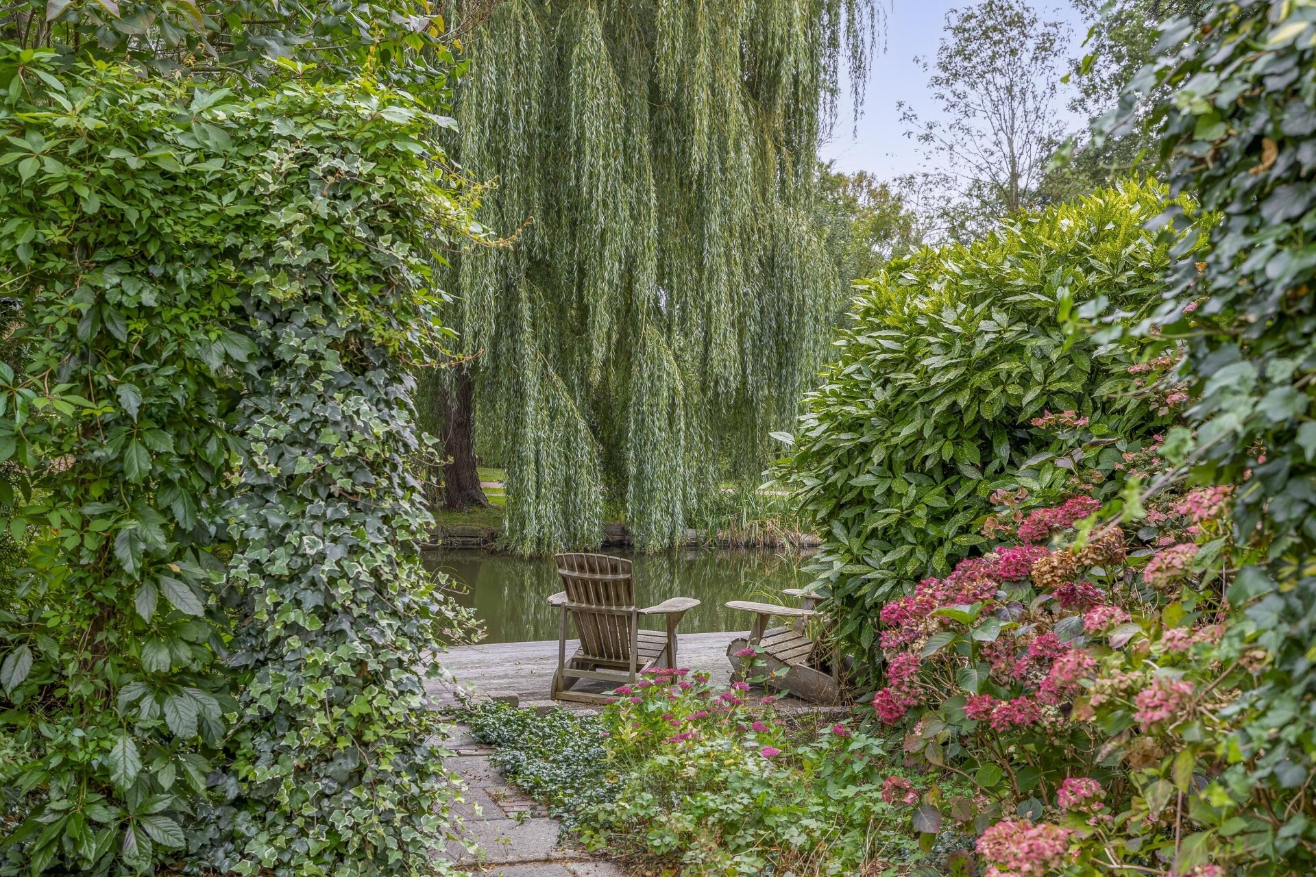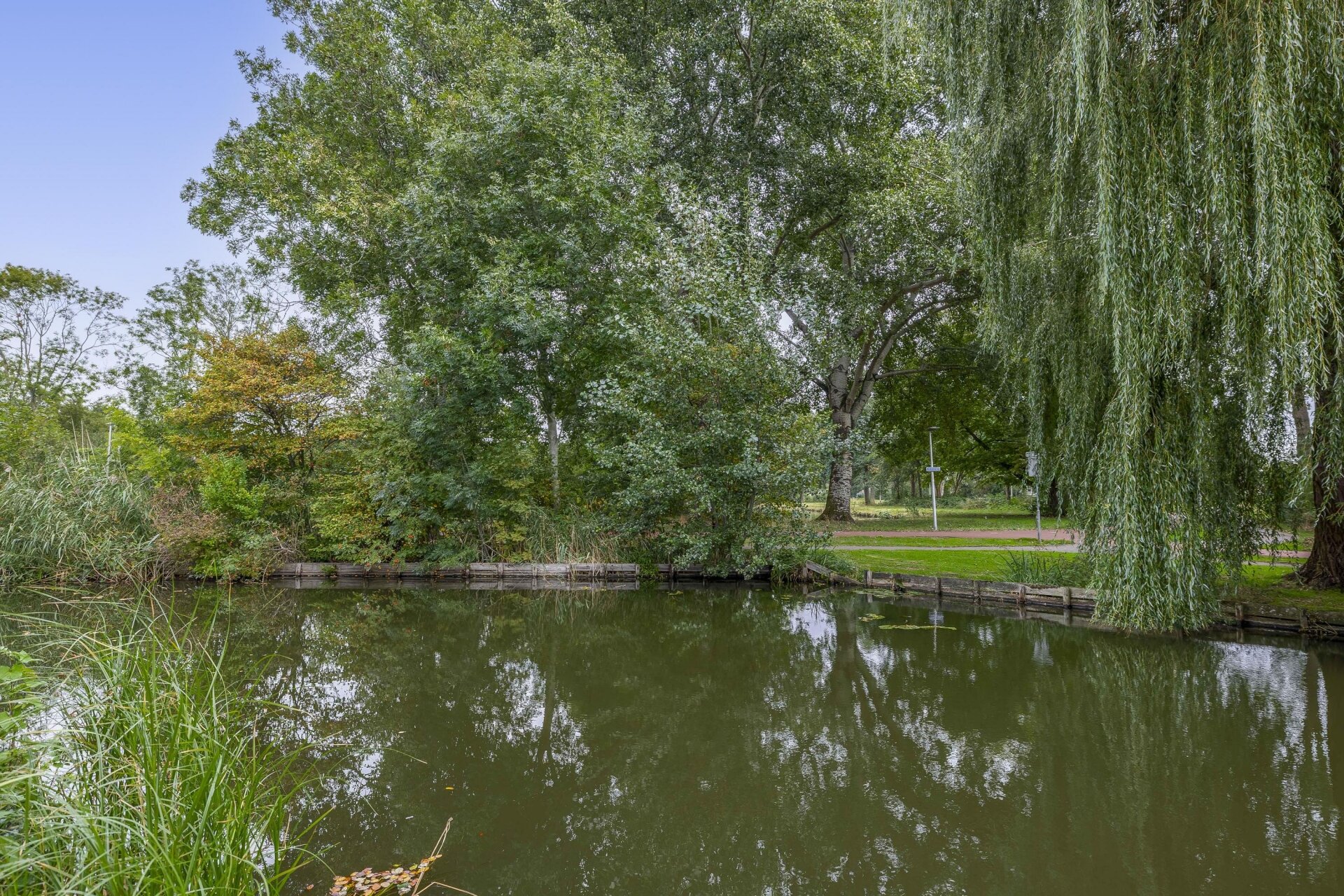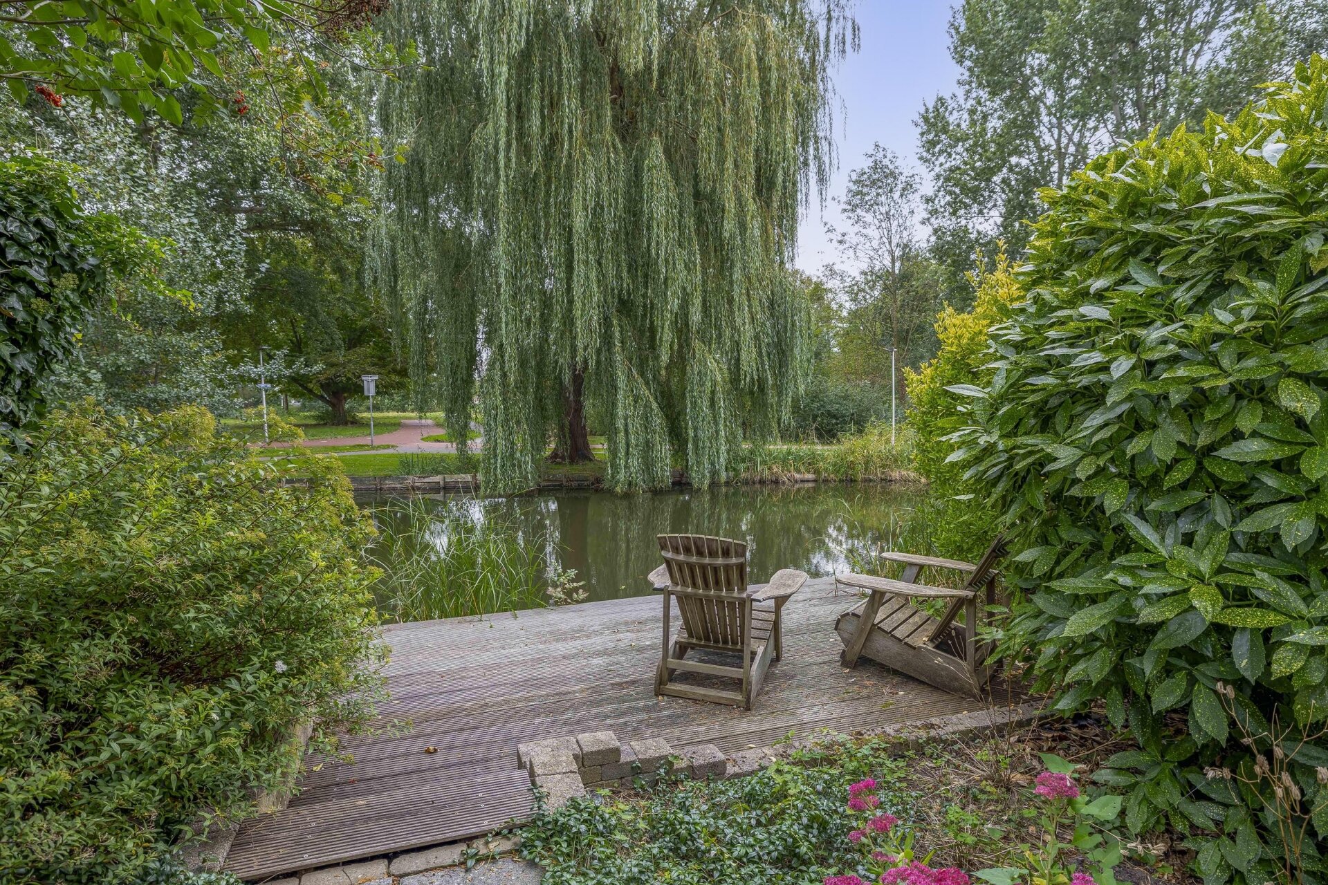 Deze groene oase van rust, grenst met een breed vlonder terras aan het water en biedt vrij uitzicht op het park aan de overzijde.