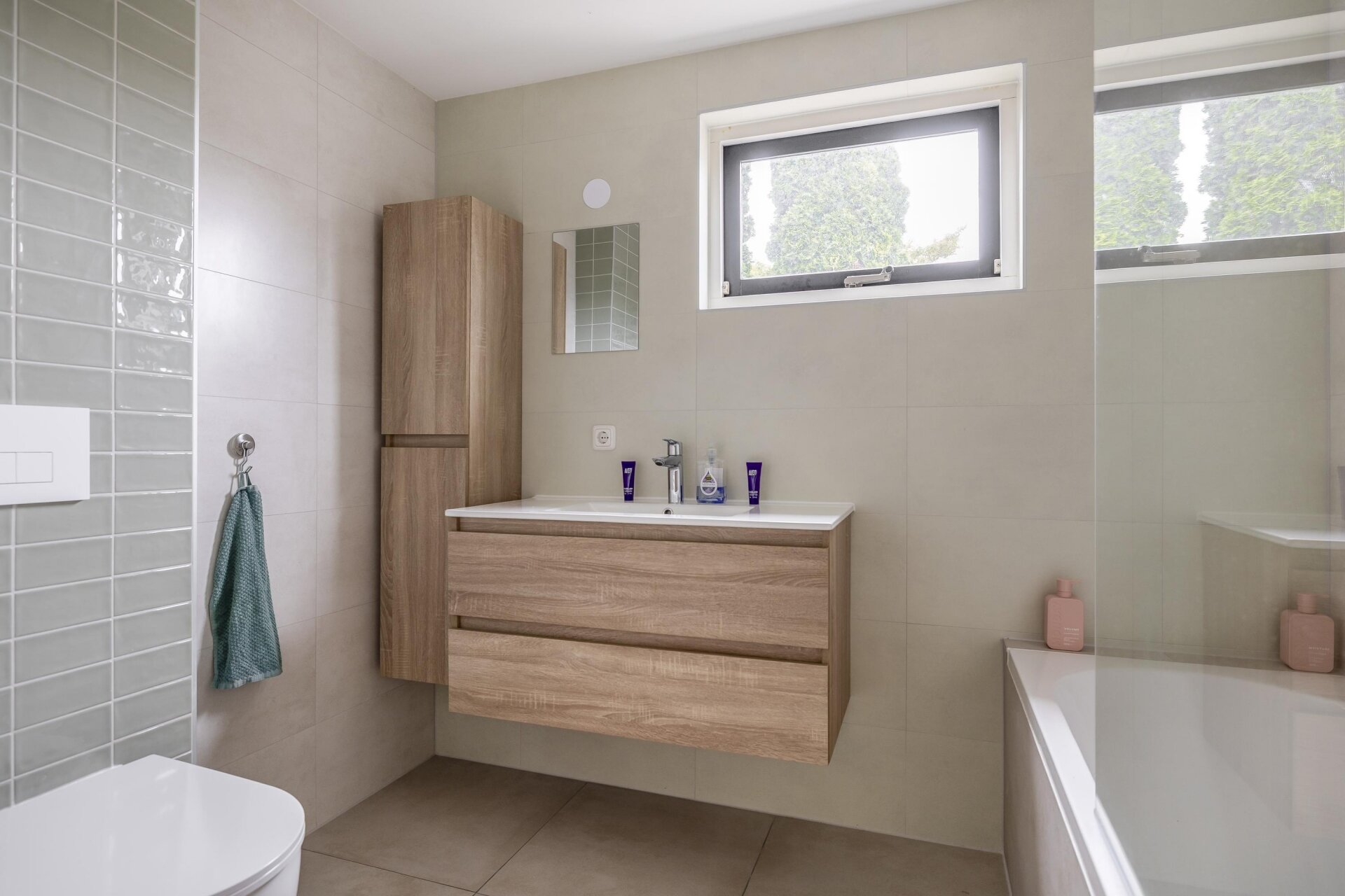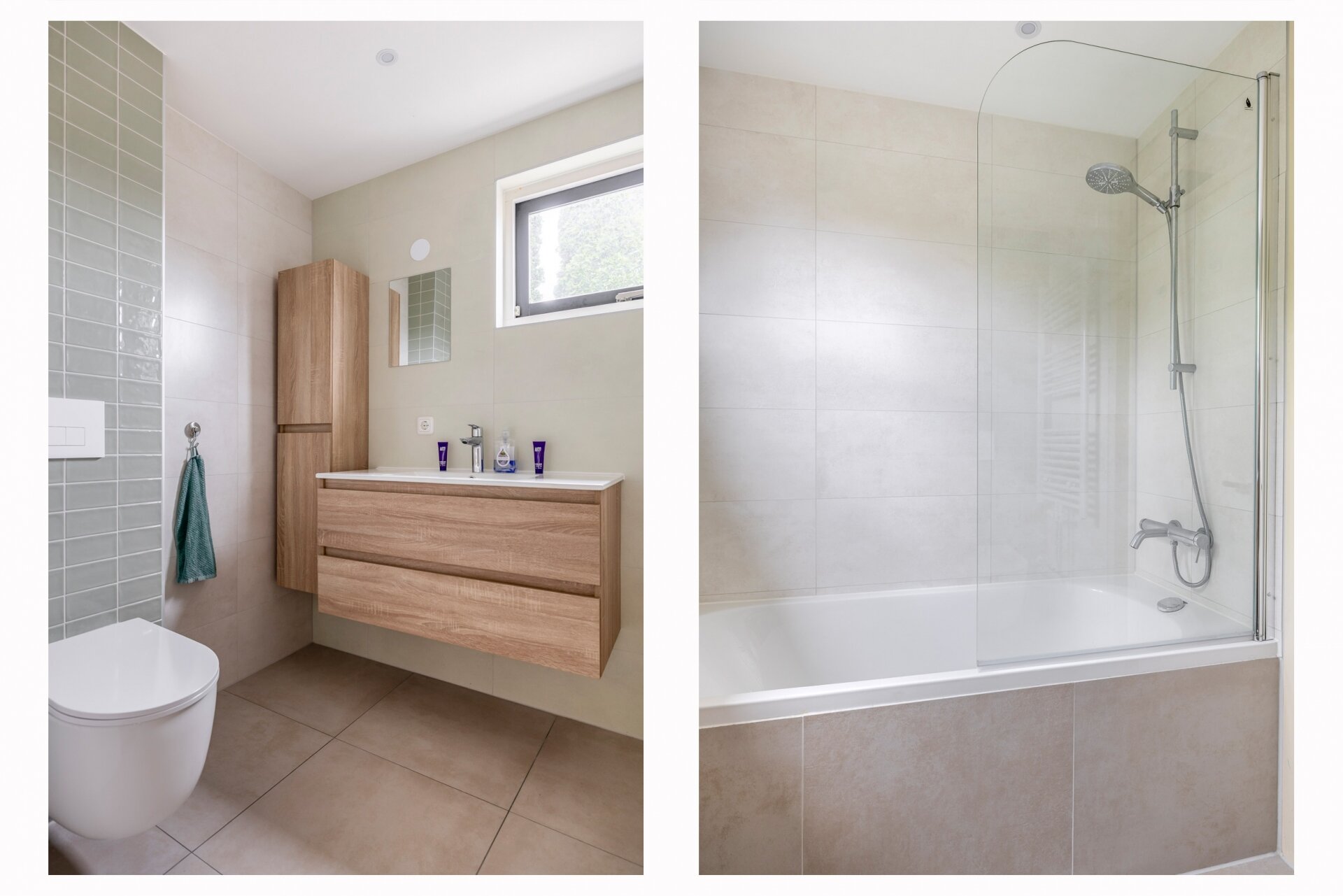 De luxe, nieuwe badkamer (februari 2025) meet ca. 4.4m² en is voorzien van een dubbel wastafelmeubel, een wandcloset en een heerlijk ligbad