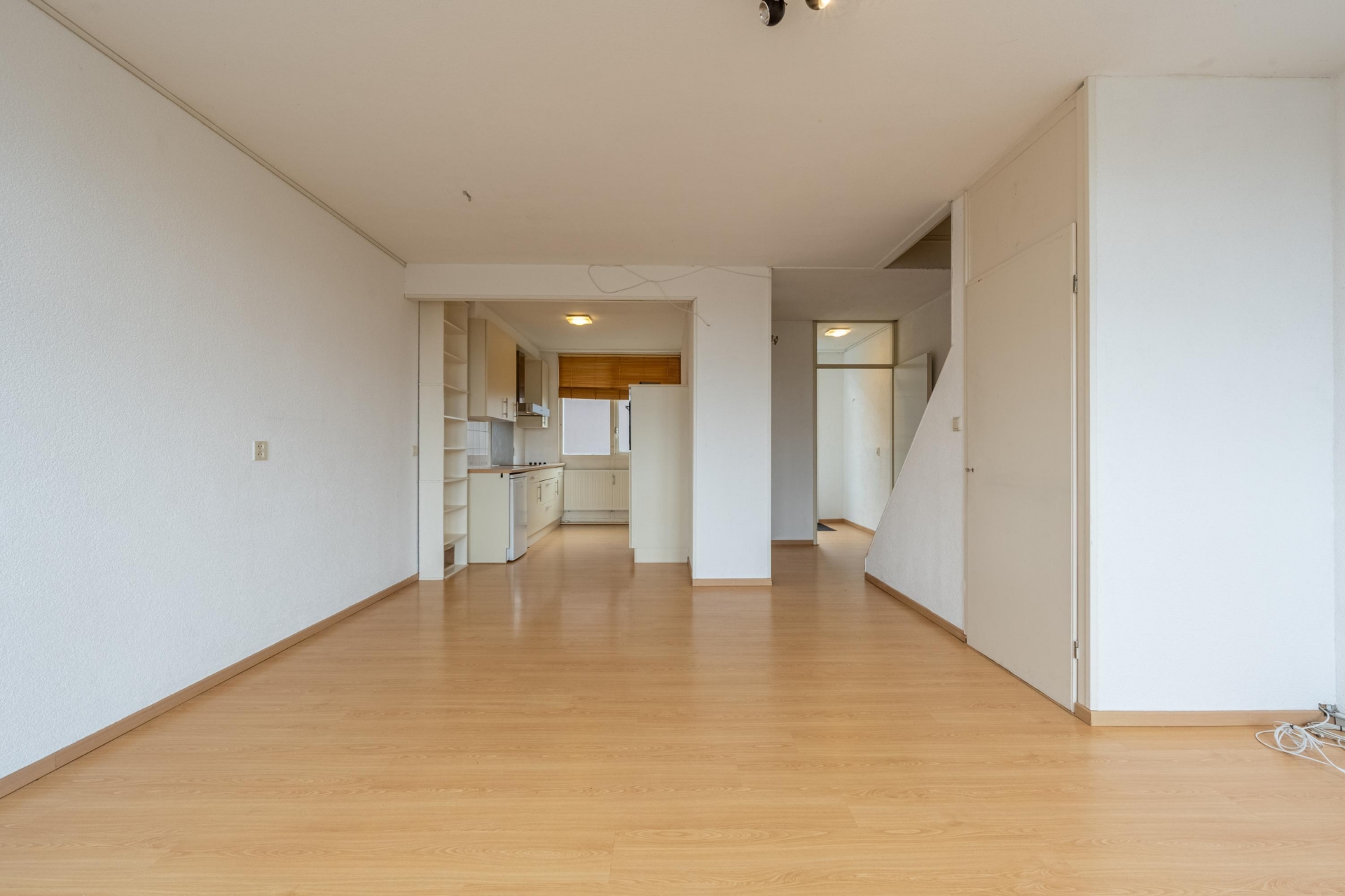 De open keuken aan de voorzijde heeft een efficiënte opstelling en is voorzien van diverse inbouwapparatuur: onder meer een keramische kookplaat, vaatwasser, koelkast en oven. Dankzij de ruime indeling kun je hier prima koken én tegelijk onderdeel blijven van het gezelschap in de woonkamer. Onder de trap is een handige bergkast voor je voorraad of stofzuiger.