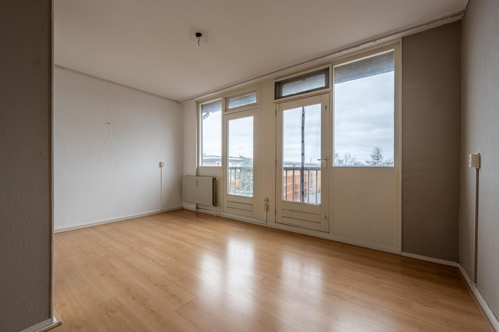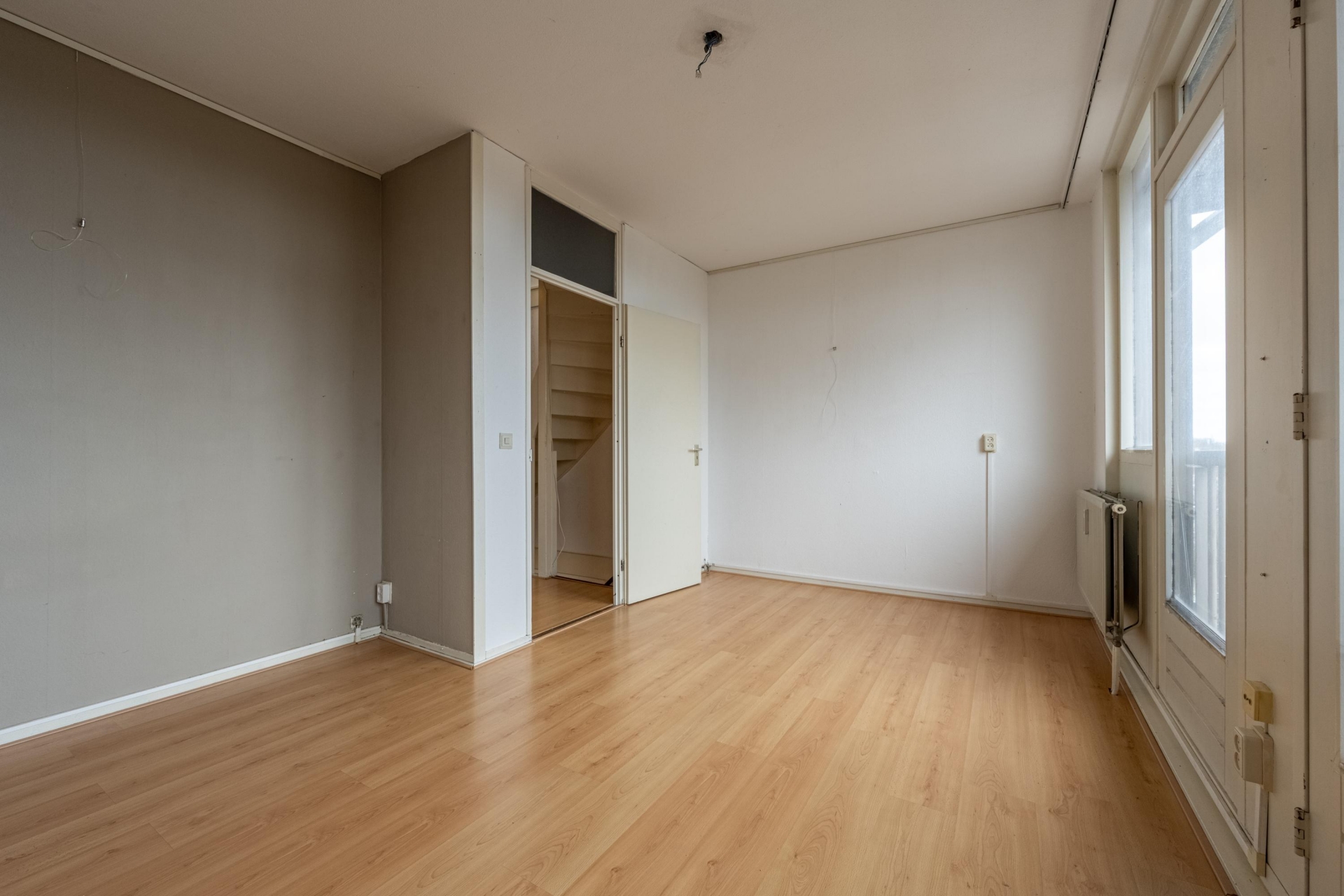 De begane grond begint met een nette entree en een modern toilet. Vanuit hier stap je de lichte en ruime woonkamer binnen, waar je meteen de ruimte en het daglicht opmerkt. Dankzij de brede raampartijen en de dubbele deuren naar het balkon voelt deze verdieping extra ruim aan. Op het balkon kun je lekker buiten zitten met een kop koffie of een goed boek.