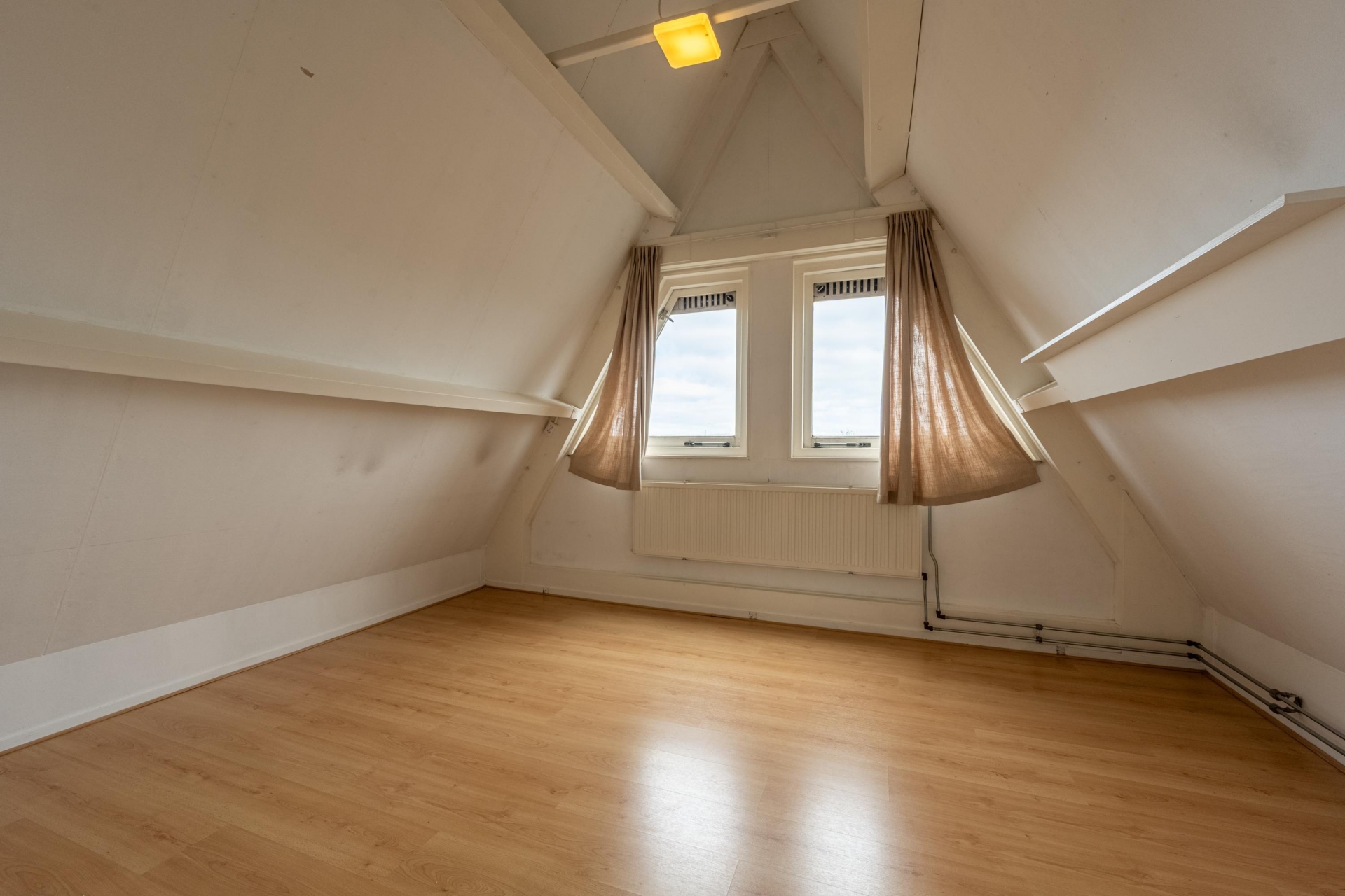 De tweede verdieping verrast met nog twee slaapkamers. De slaapkamer aan de voorzijde heeft een indrukwekkend hoge nok, wat zorgt voor een uniek ruimtelijk gevoel. De andere slaapkamer aan de achterzijde heeft toegang tot een vliering – ideaal voor koffers, kerstspullen of extra opbergruimte.