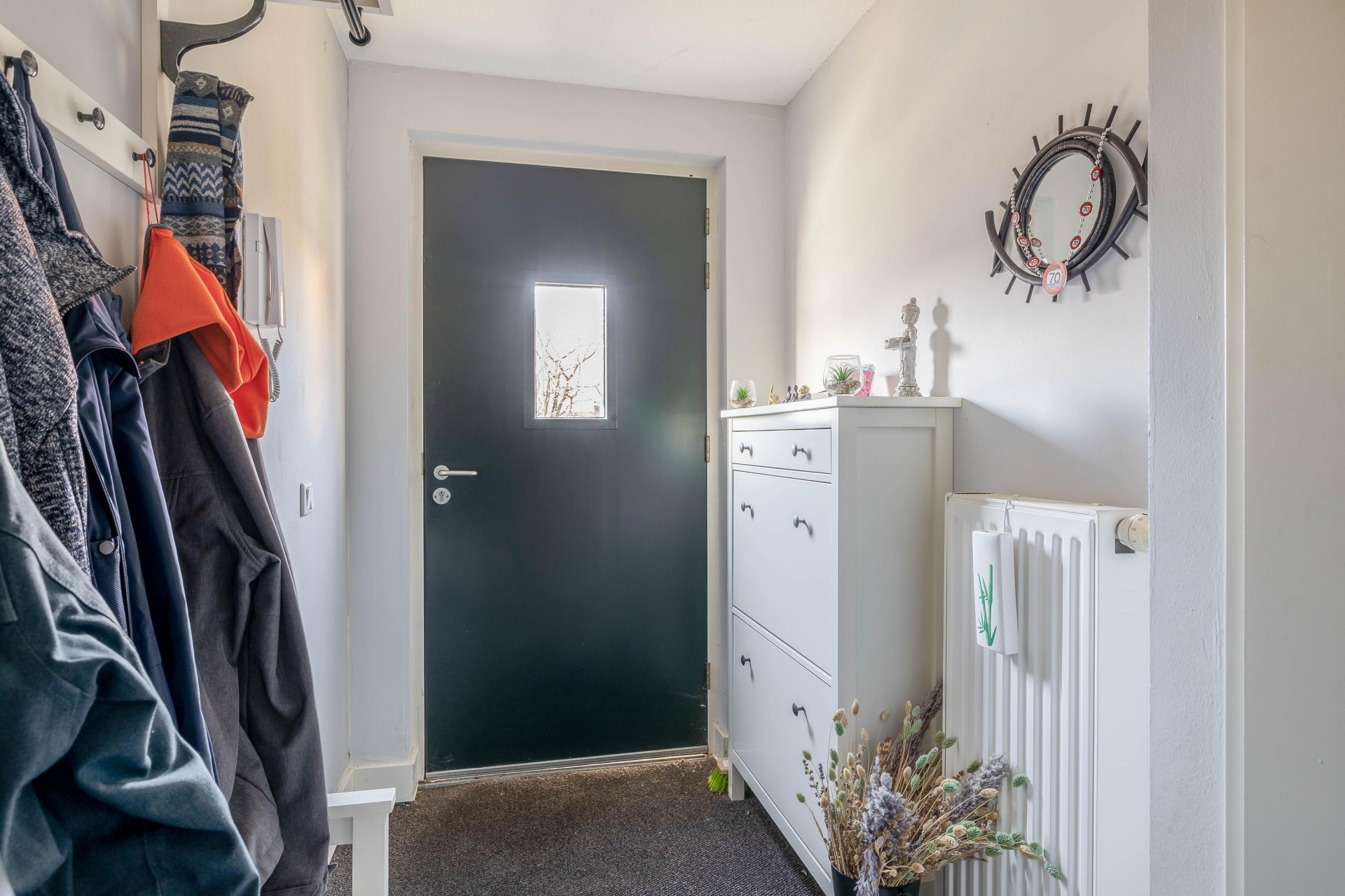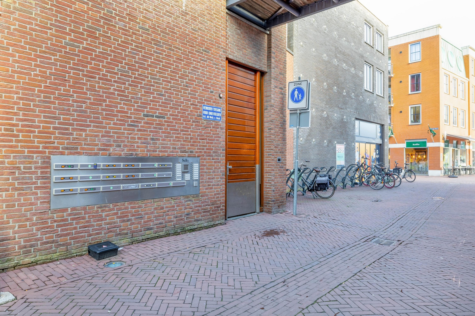 Entree via een afgesloten portiek met bellentableau en brievenbussen. Vanuit de centrale hal bereik je via lift of trap de woning.