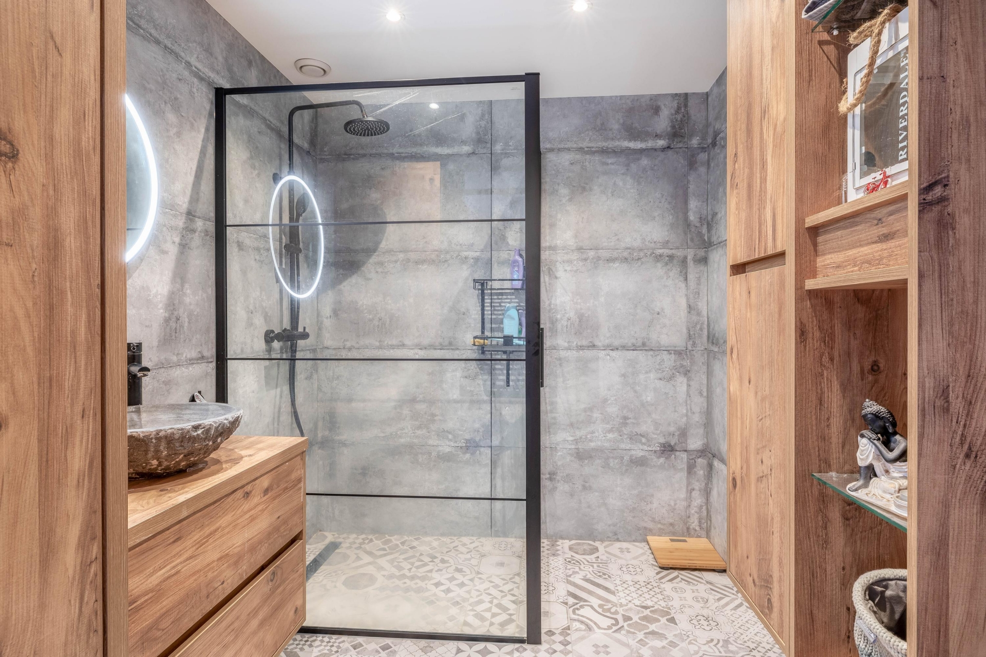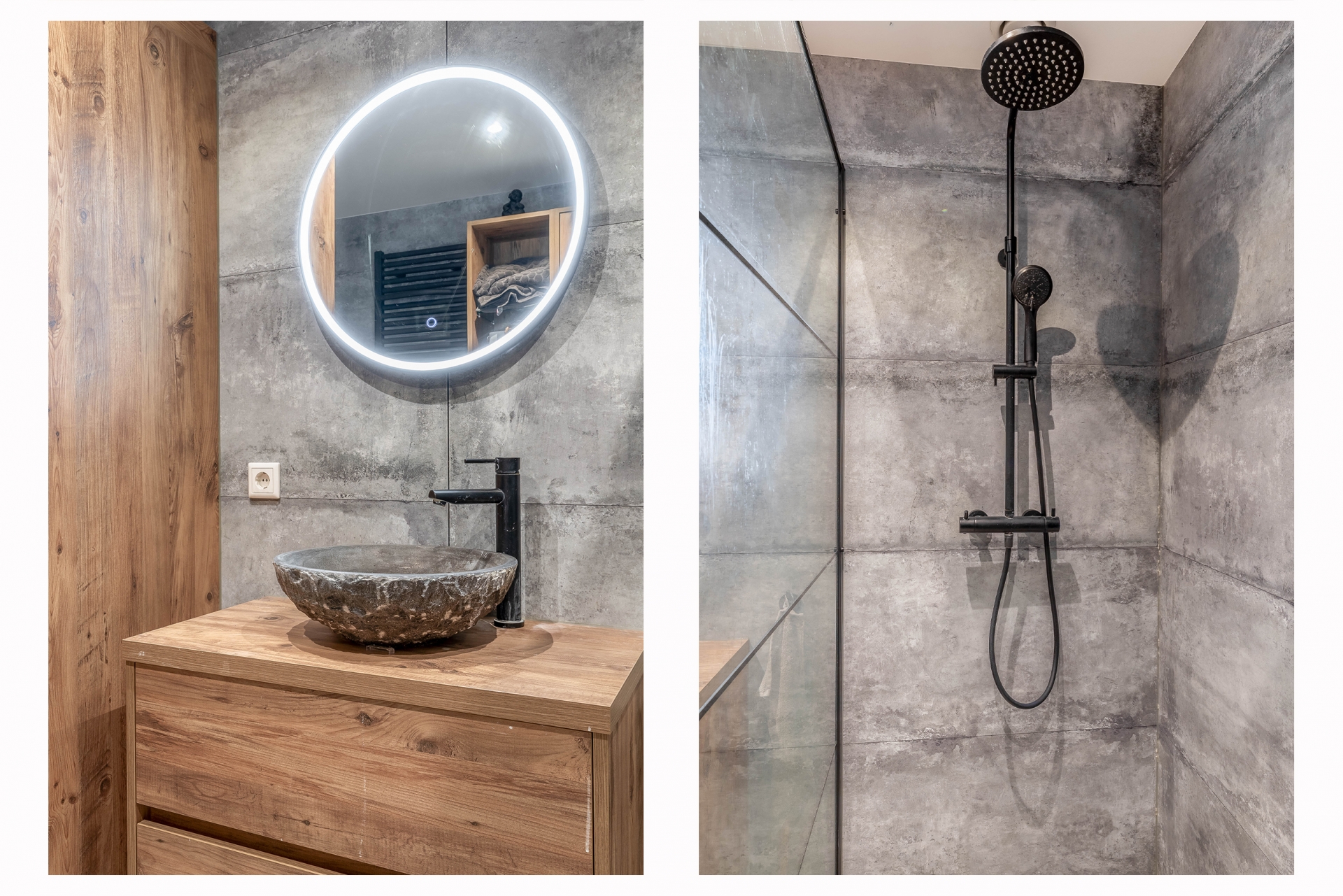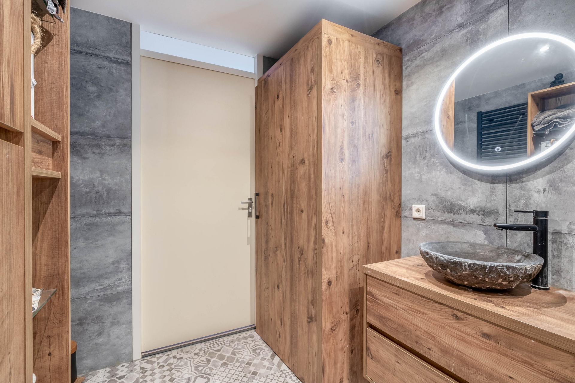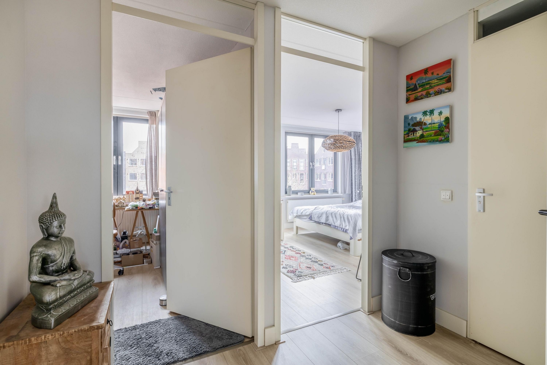 Via de hal bereik je het moderne toilet (hangend closet met fonteintje), de stijlvolle badkamer en de twee ruime slaapkamers aan de achterzijde. De badkamer is voorzien van een ruime inloopdouche, wastafelmeubel, veel bergruimte en een op maat gemaakte kast voor wasmachine en droger.