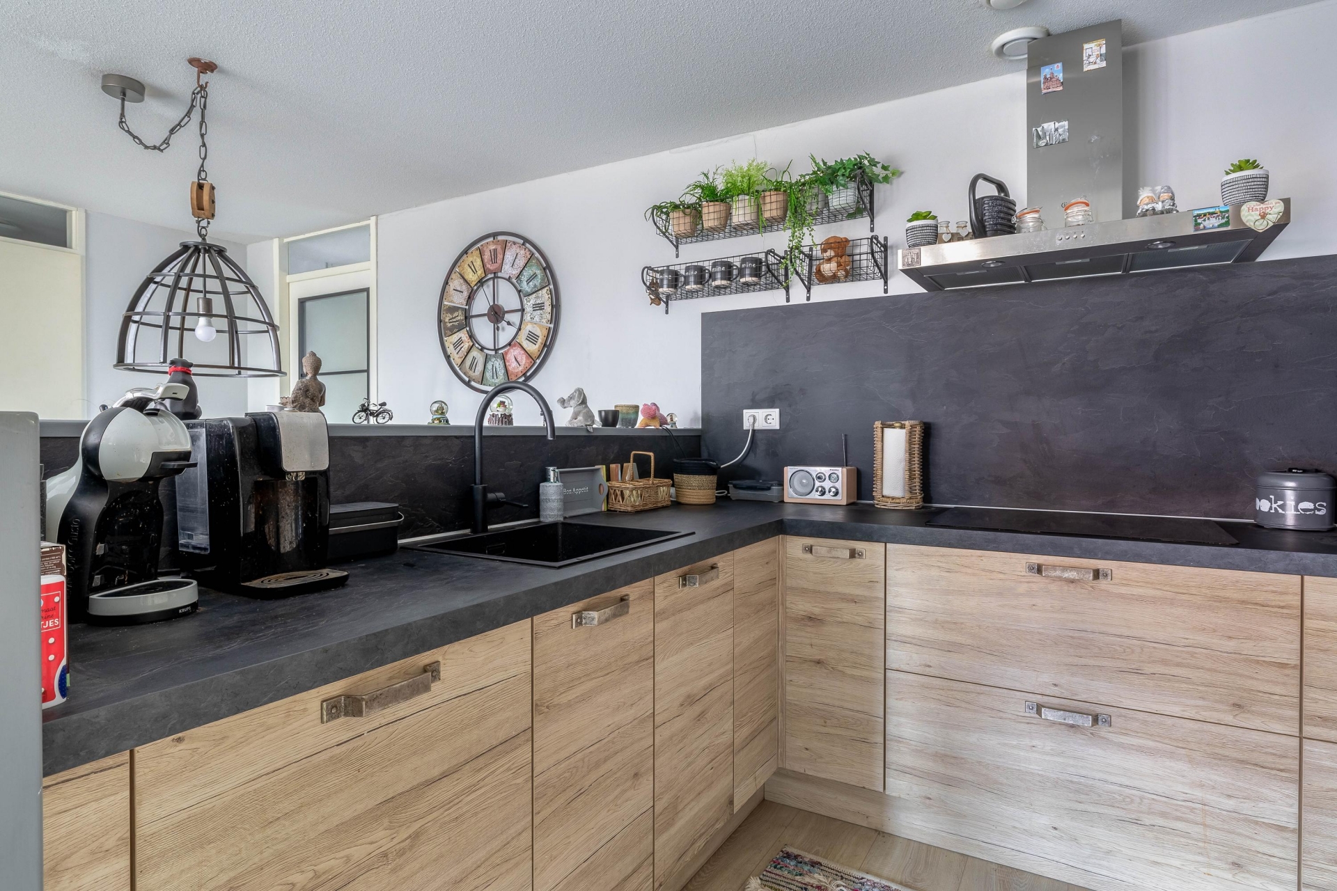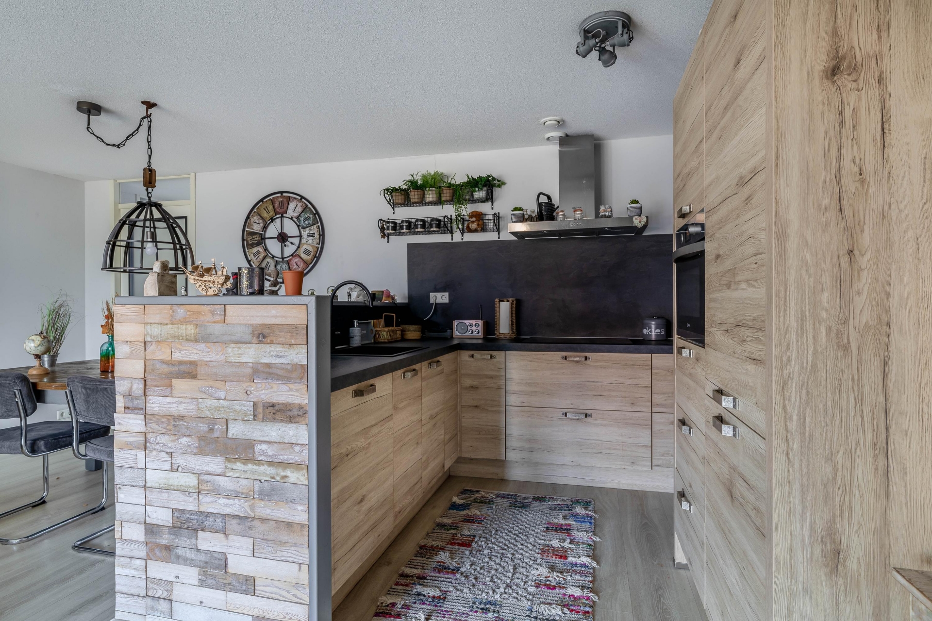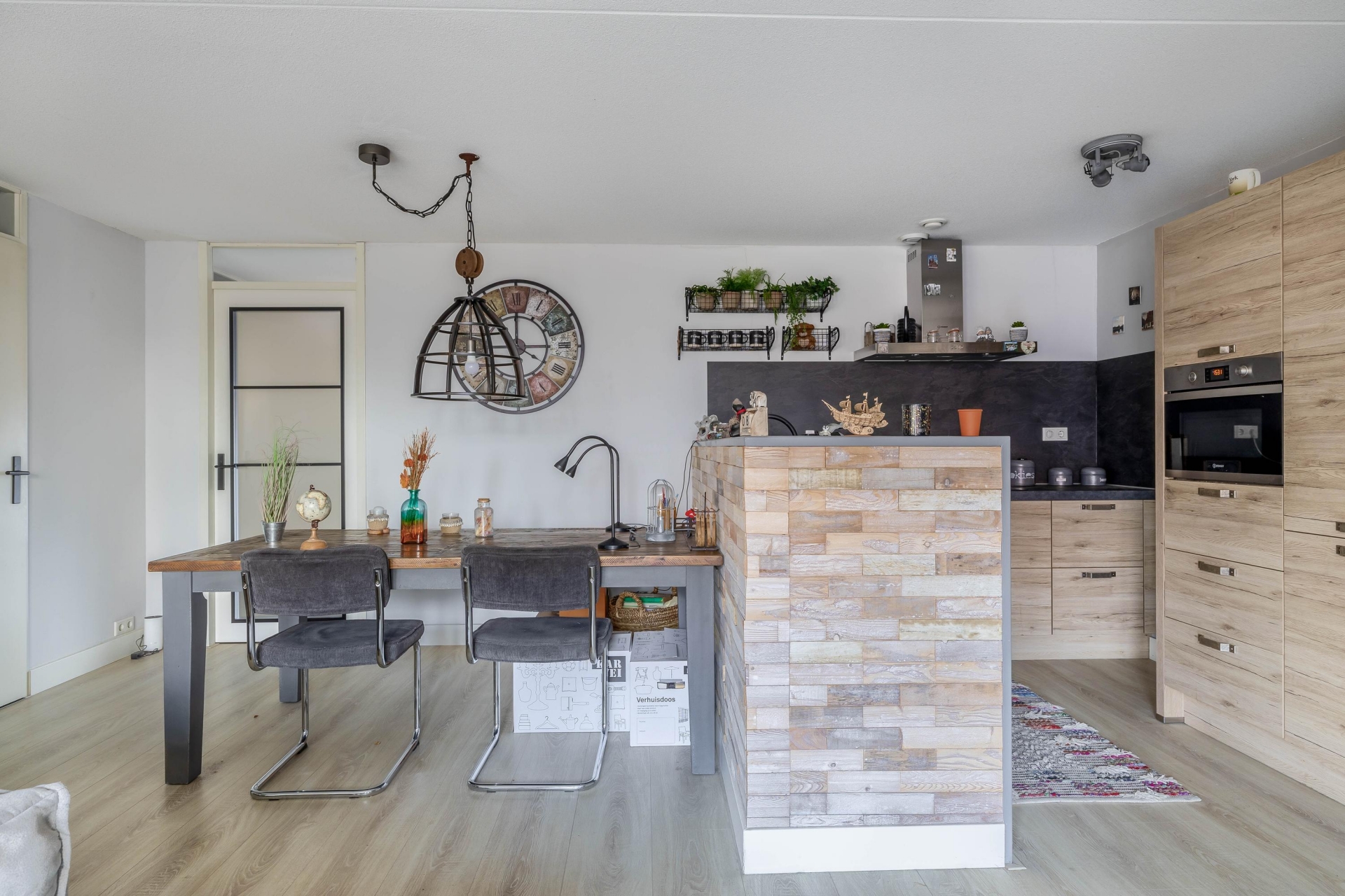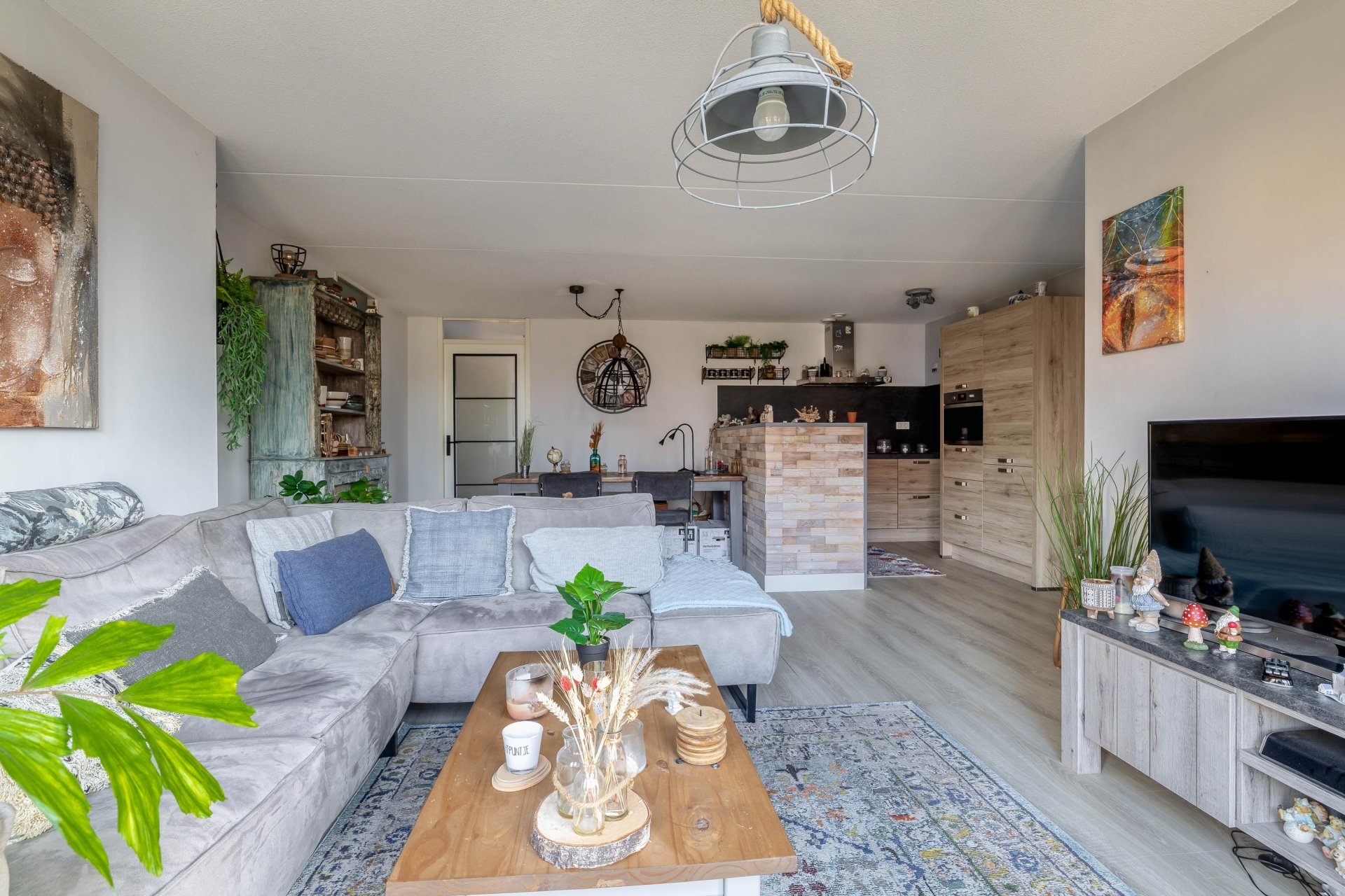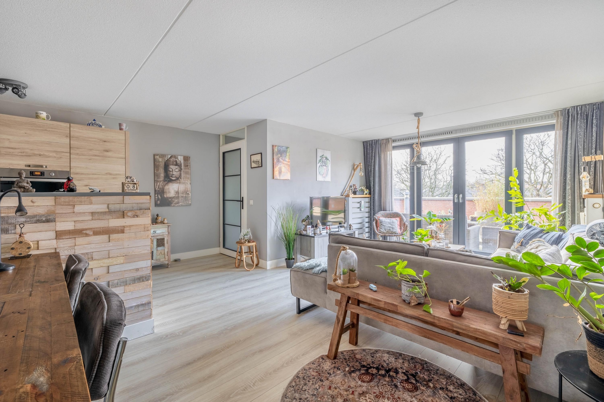 Entree/hal met meterkast en garderoberuimte. De ruime en lichte woonkamer beschikt over een moderne open keuken met diverse inbouwapparatuur, waaronder een combi-oven, koel-/vriescombinatie, vaatwasser en inductiekookplaat.