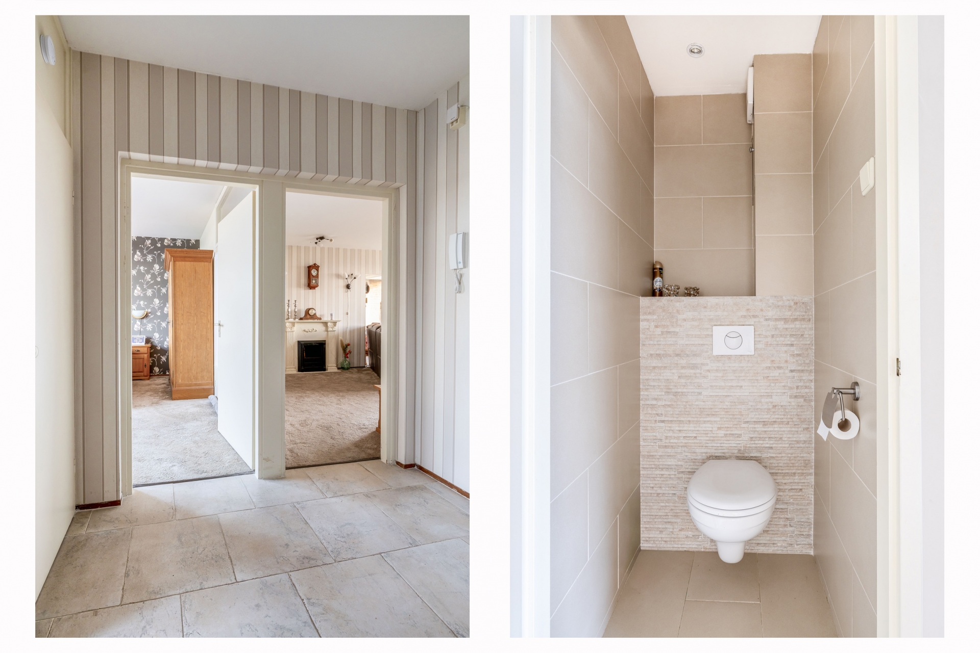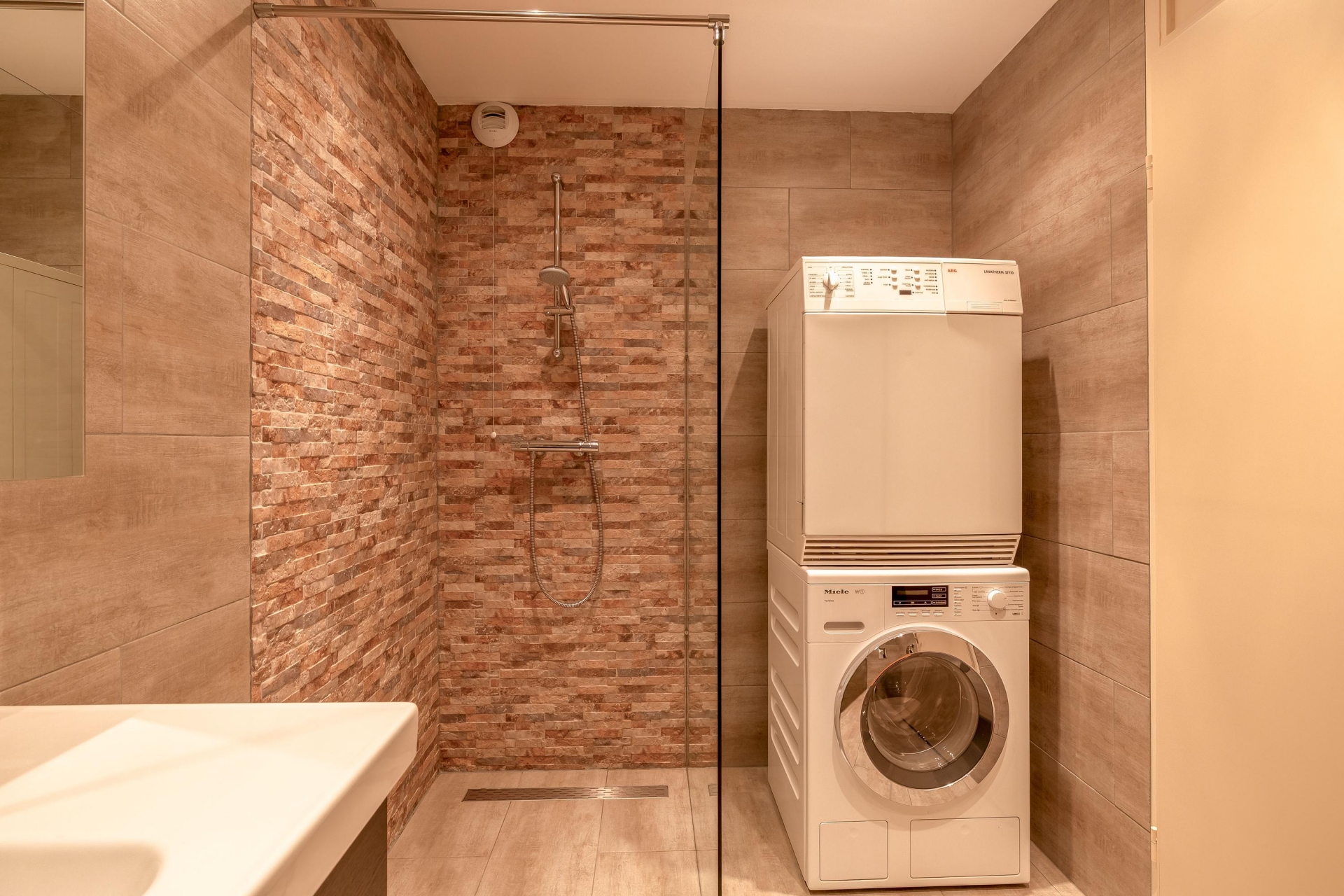 De badkamer is modern afgewerkt, voorzien van een ruime inloopdouche met glazen wand, strak wastafelmeubel met spiegelkasten en een toilet. De wasmachine en droger passen keurig in de hoek, netjes weggewerkt. Alles is hier tot in de puntjes verzorgd instapklaar dus.