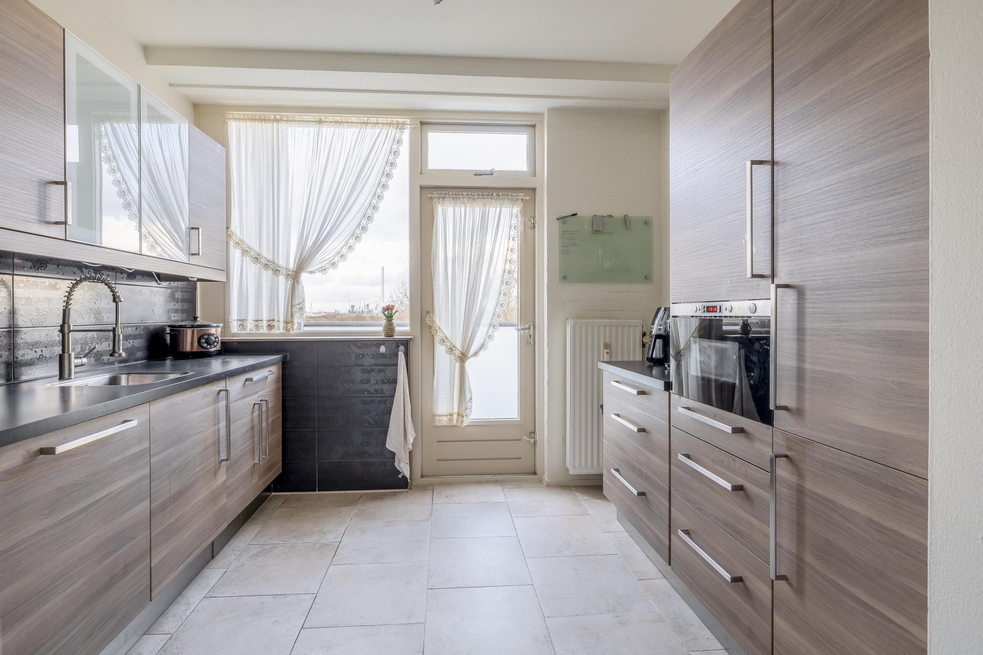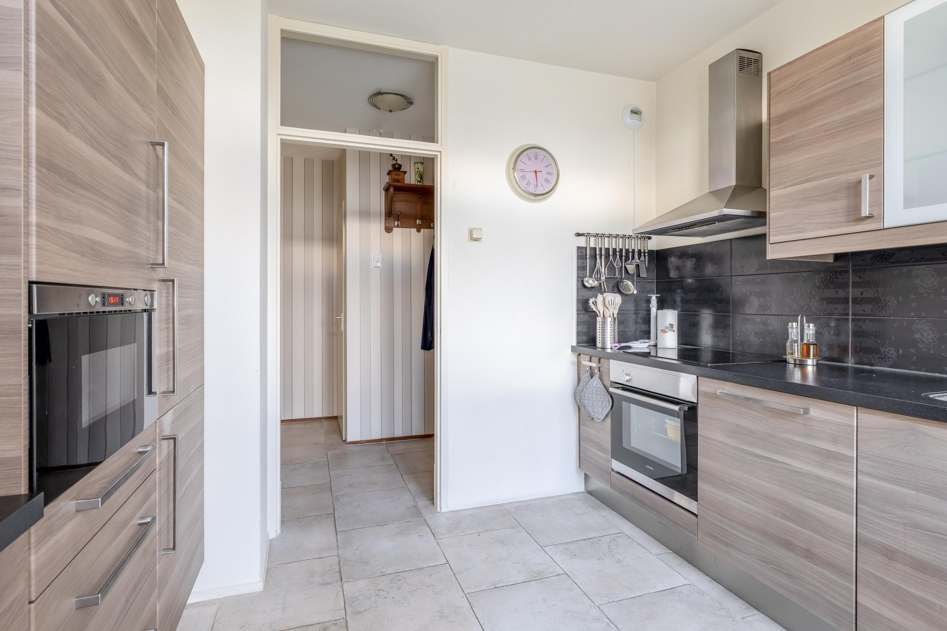 Aansluitend bevindt zich de nette, moderne keuken. Deze is slim ingedeeld met voldoende opbergruimte, een strak werkblad, stijlvolle achterwand en alle benodigde apparatuur. Dankzij het raam in de keuken kook je hier met natuurlijk licht en ventilatie.