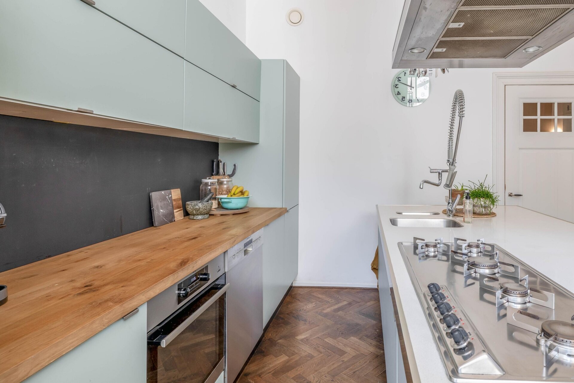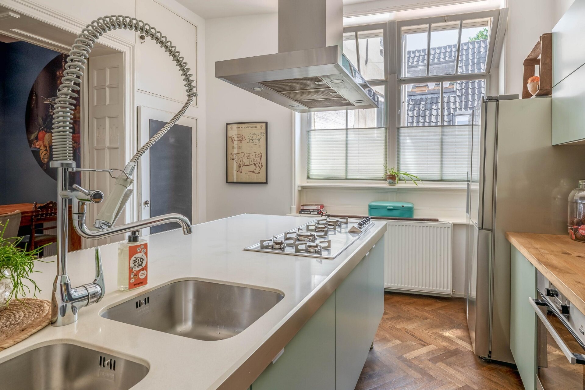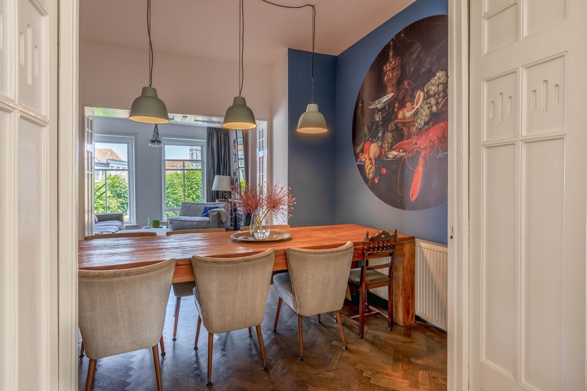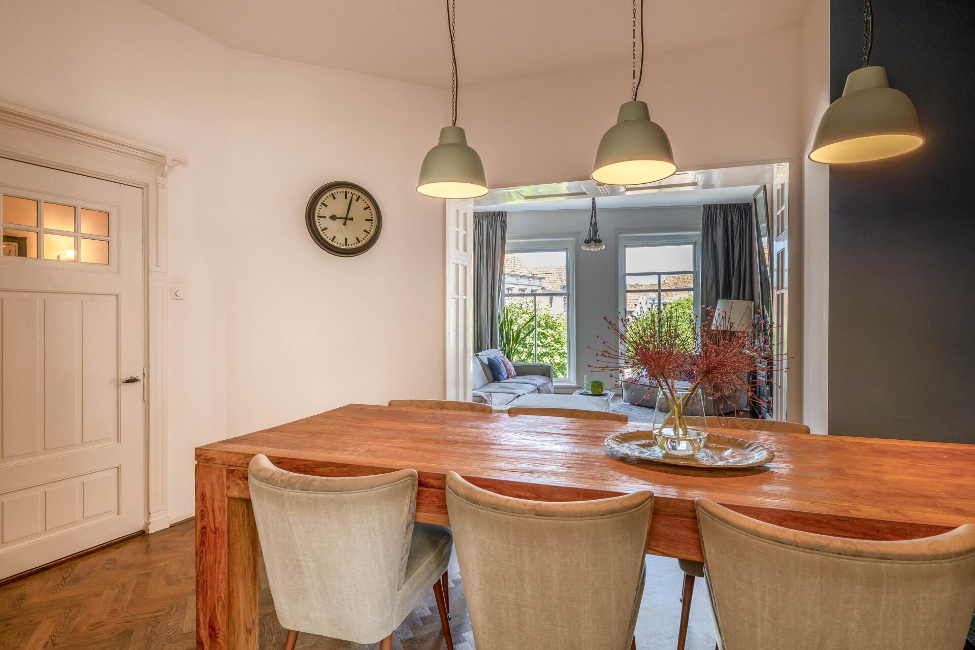 Zodra je binnenkomt, valt het hoge plafond en de natuurlijke lichtinval meteen op. De ruime woonkamer aan de voorzijde kijkt prachtig uit over de Haven en de monumentale gevels. Door de grote ramen en het vrije uitzicht voelt deze leefruimte extra royaal en licht. De houten visgraat vloer, neutrale tinten en zachte stoffering maken van deze kamer een sfeervolle plek waar je je direct thuis voelt.