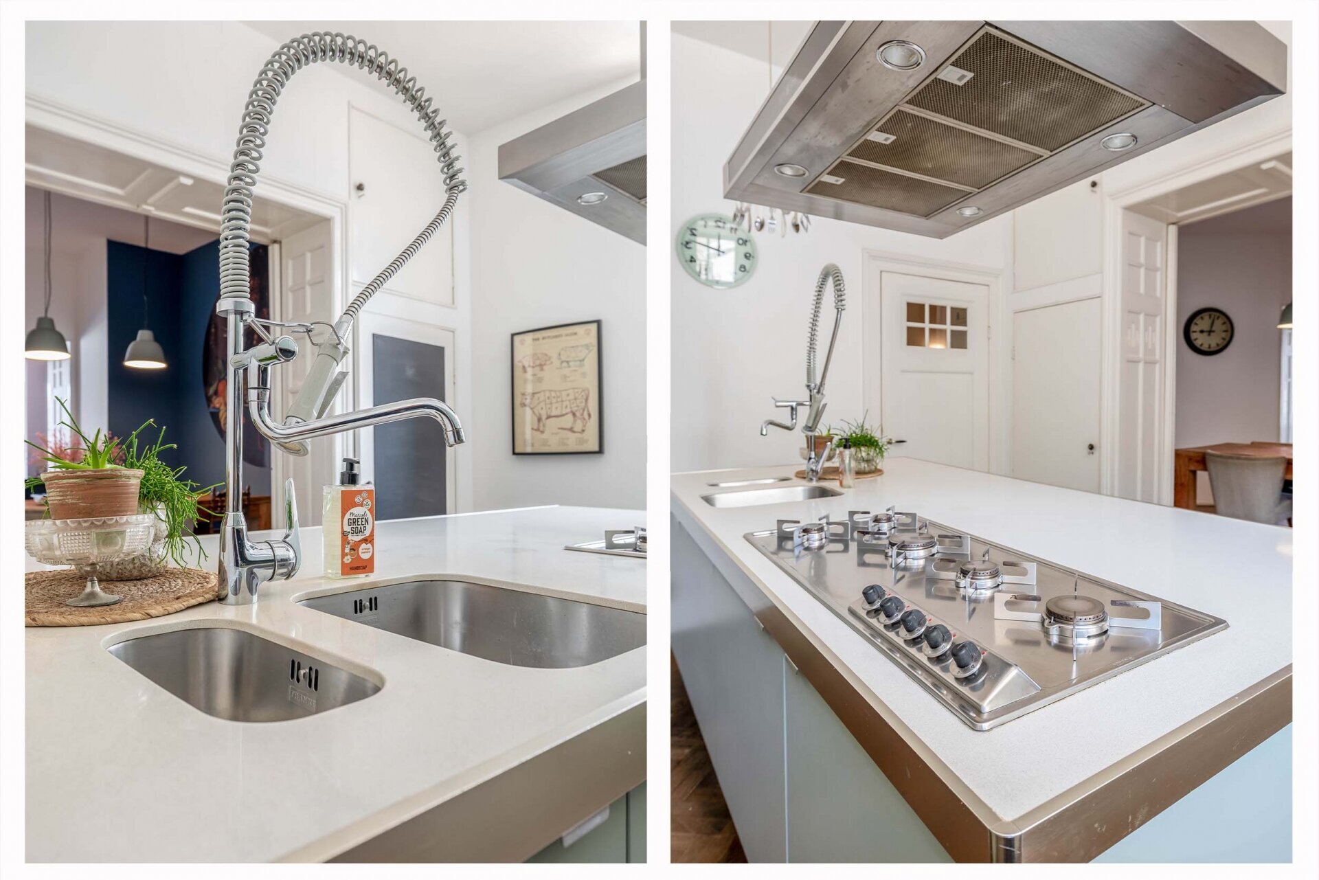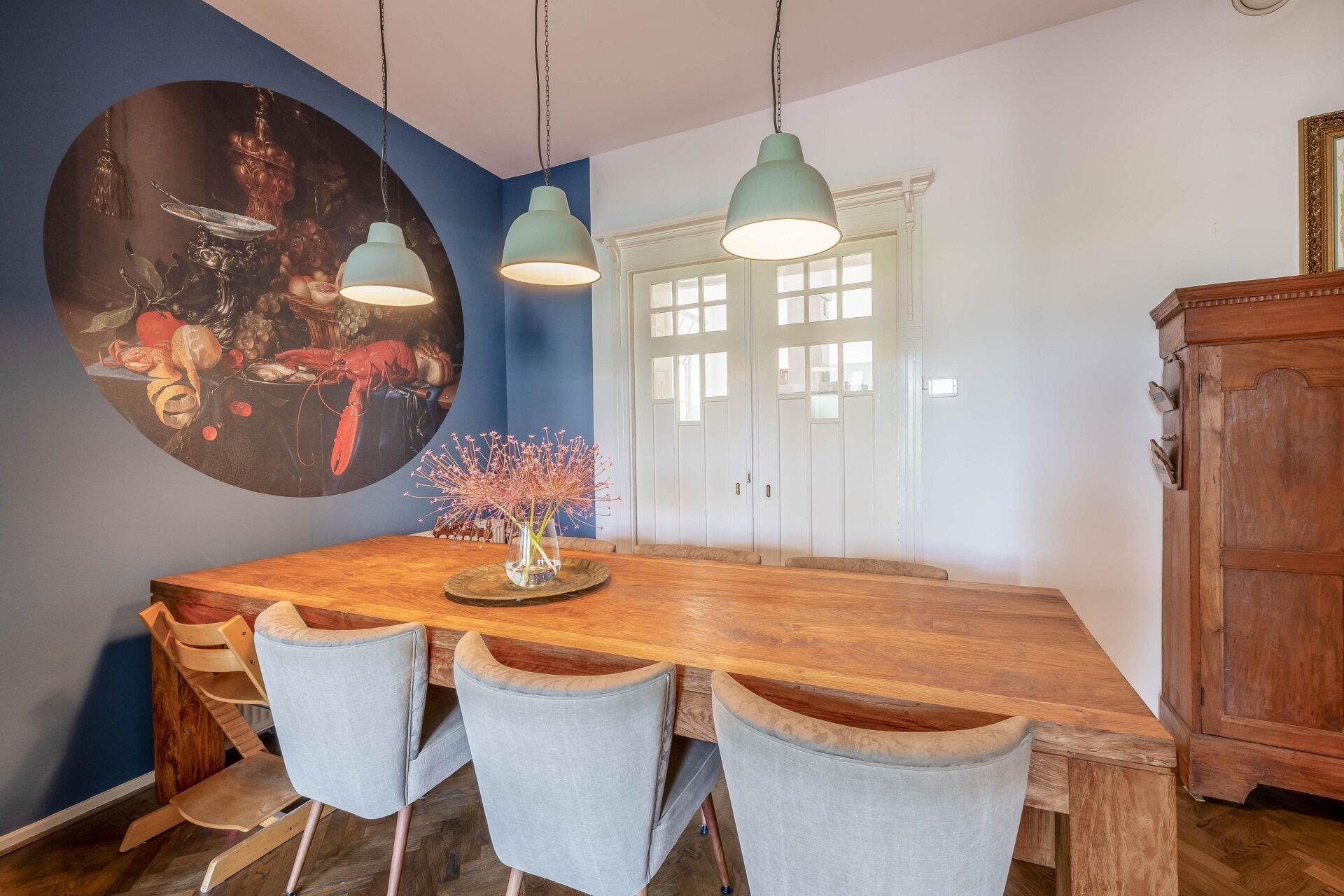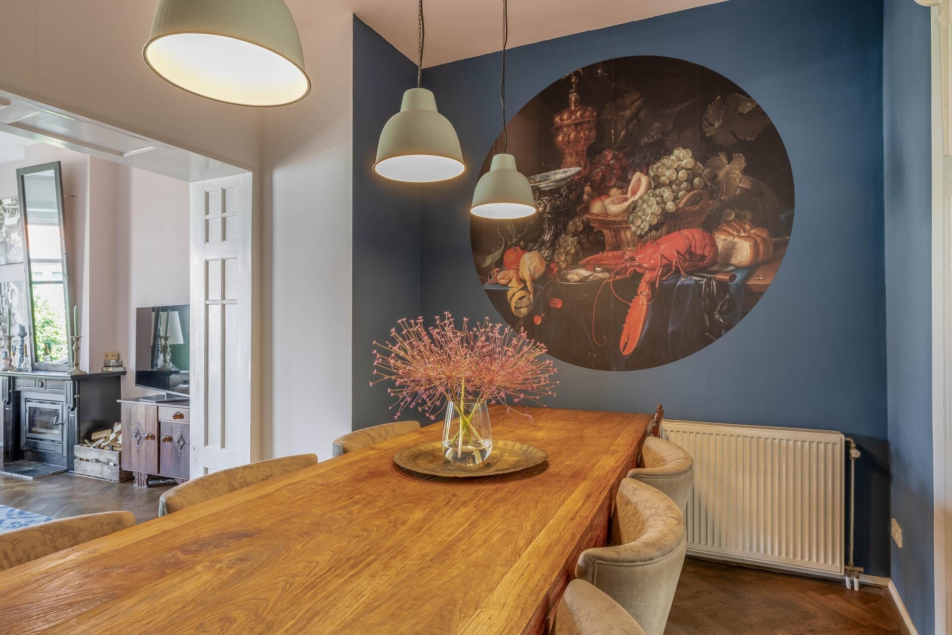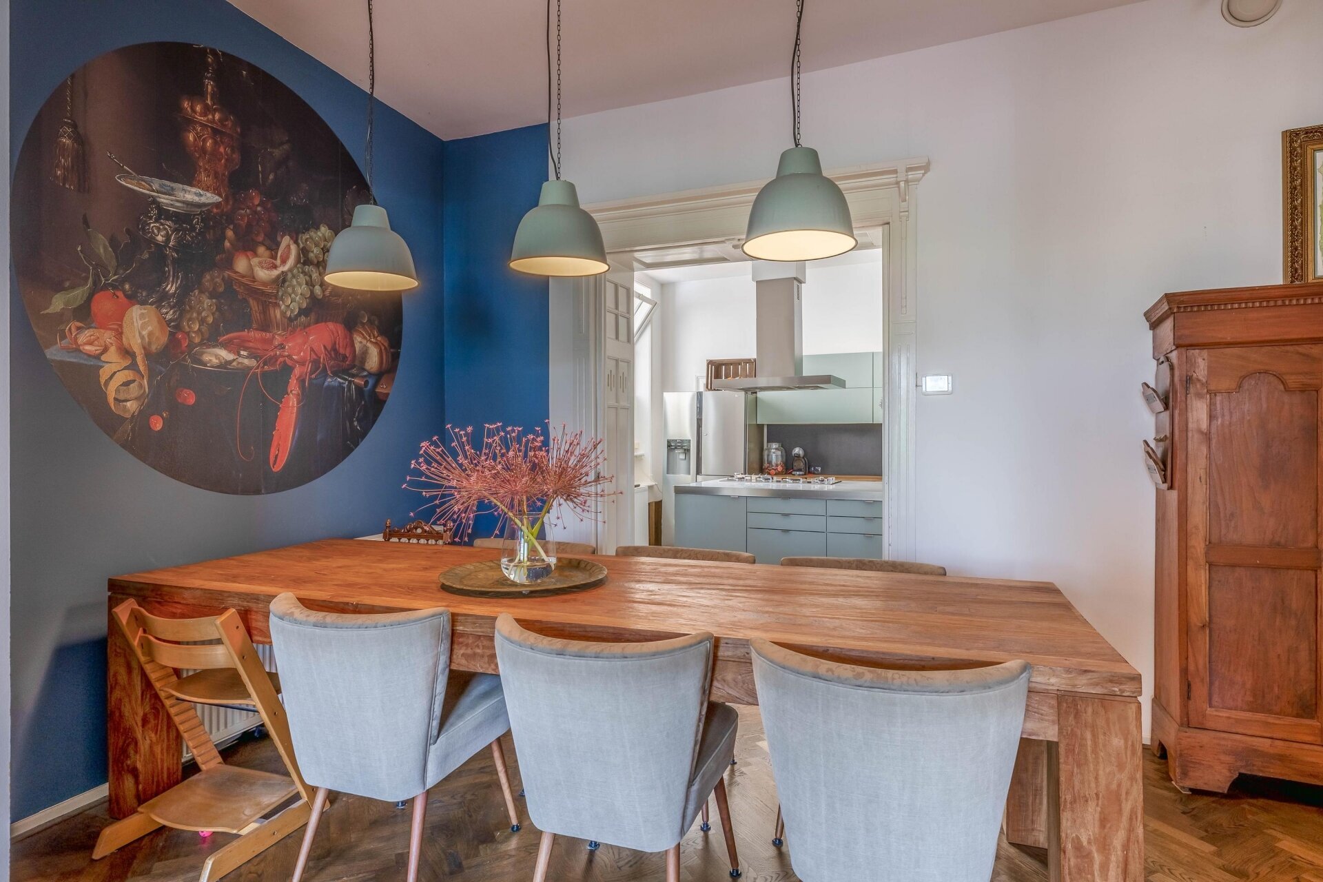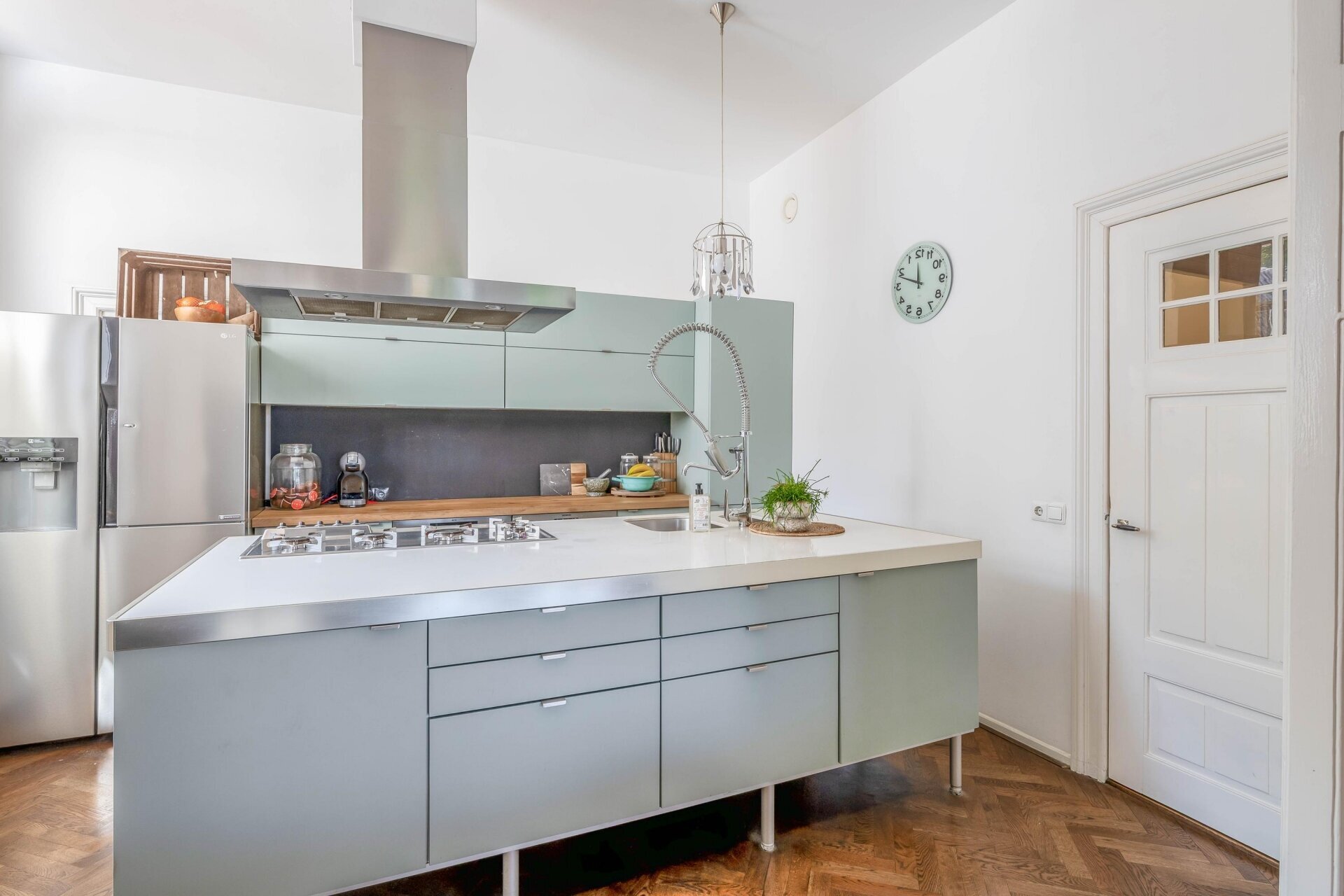 Zodra je binnenkomt, valt het hoge plafond en de natuurlijke lichtinval meteen op. De ruime woonkamer aan de voorzijde kijkt prachtig uit over de Haven en de monumentale gevels. Door de grote ramen en het vrije uitzicht voelt deze leefruimte extra royaal en licht. De houten visgraat vloer, neutrale tinten en zachte stoffering maken van deze kamer een sfeervolle plek waar je je direct thuis voelt.