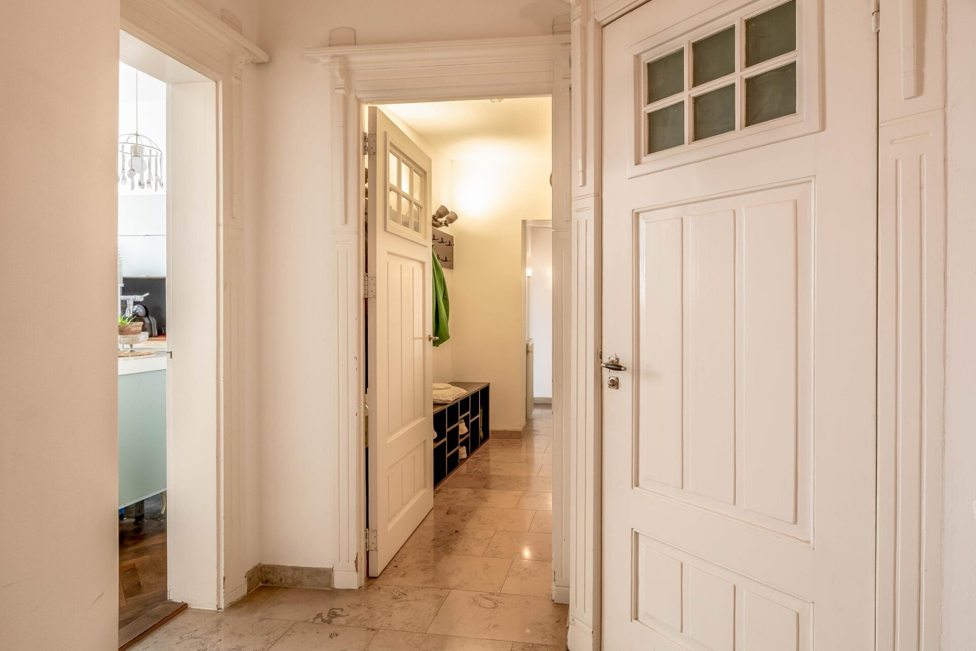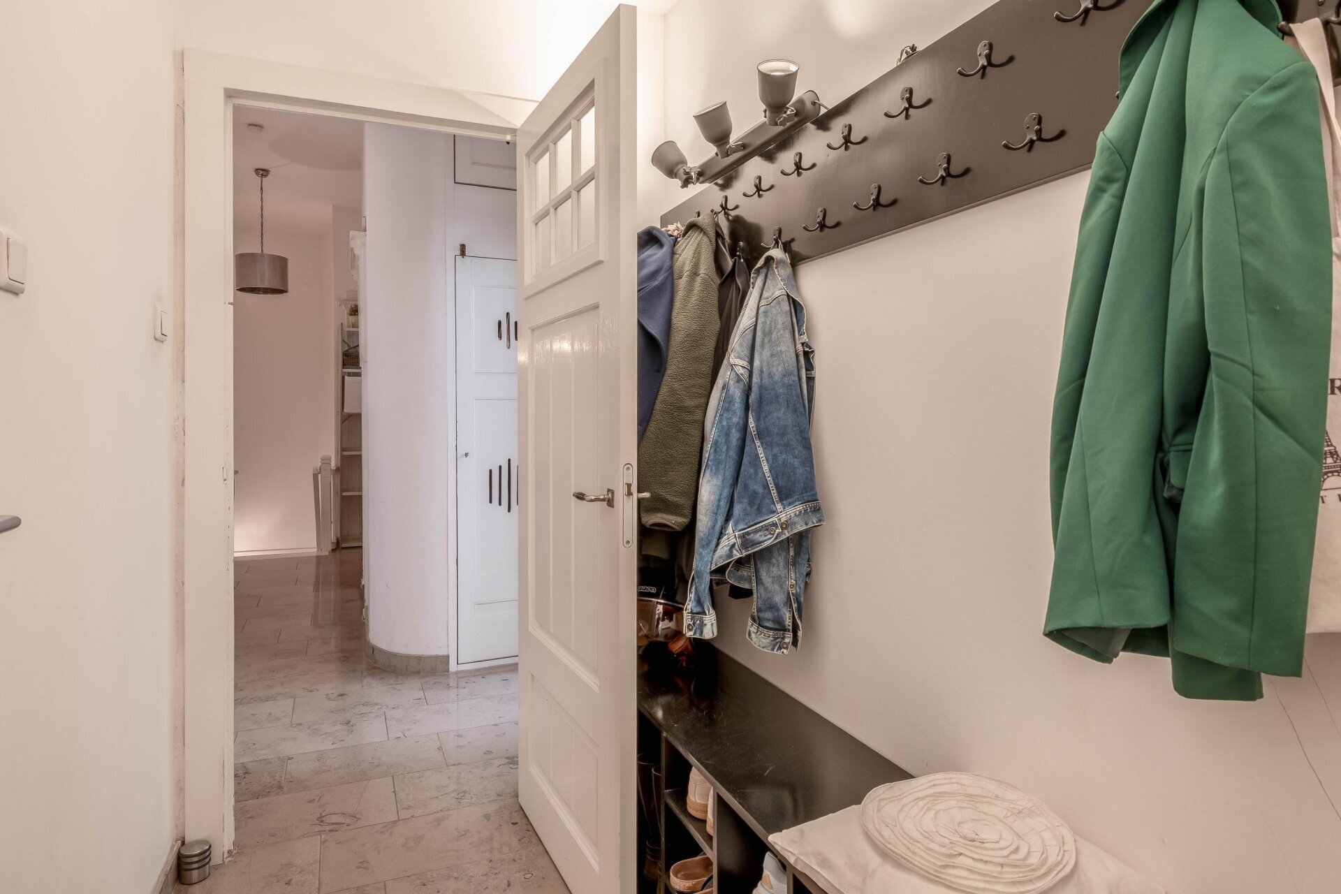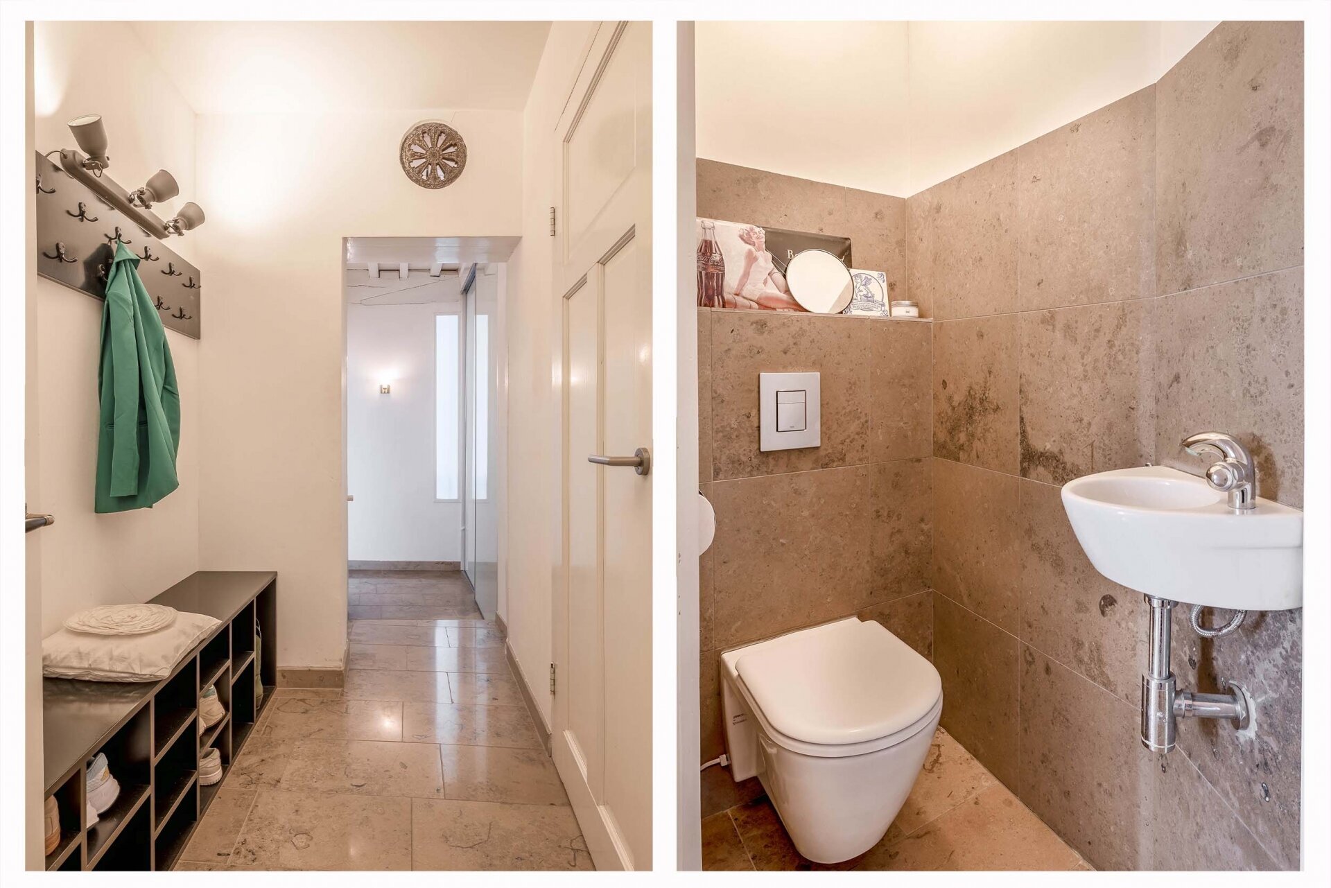 Via de entree lopen we de trap omhoog richting het appartement. We komen in een fraaie gang met toilet, een wasruimte en kastruimte en een prachtige licht marmeren vloer.