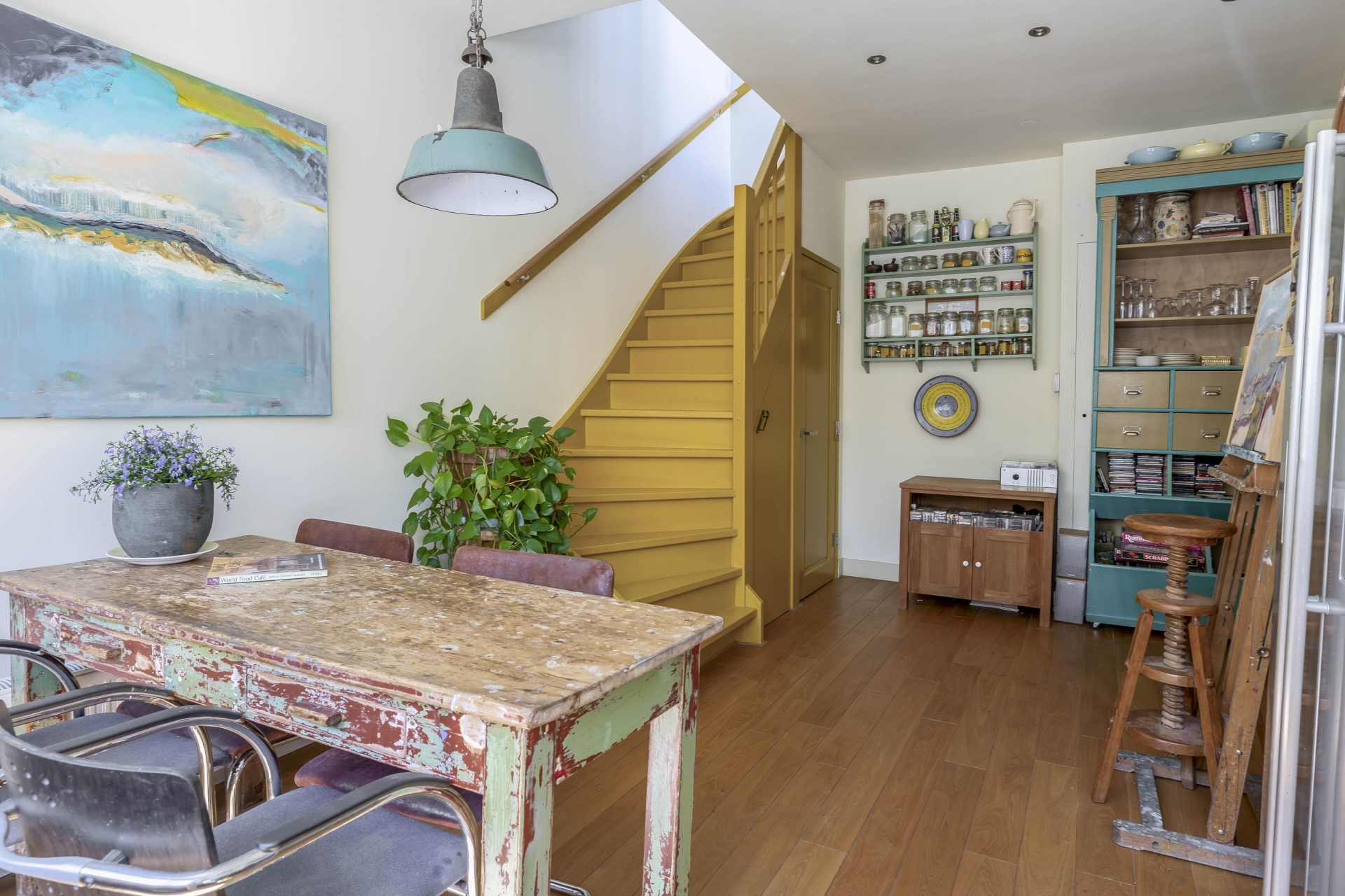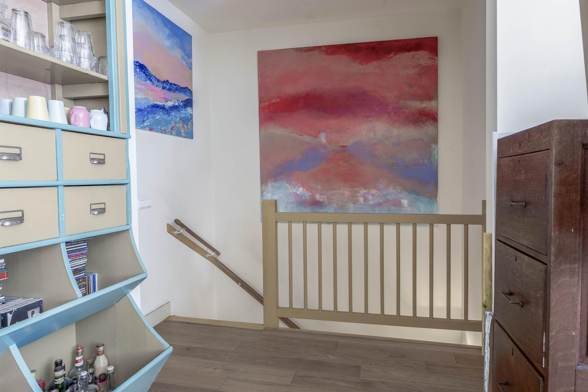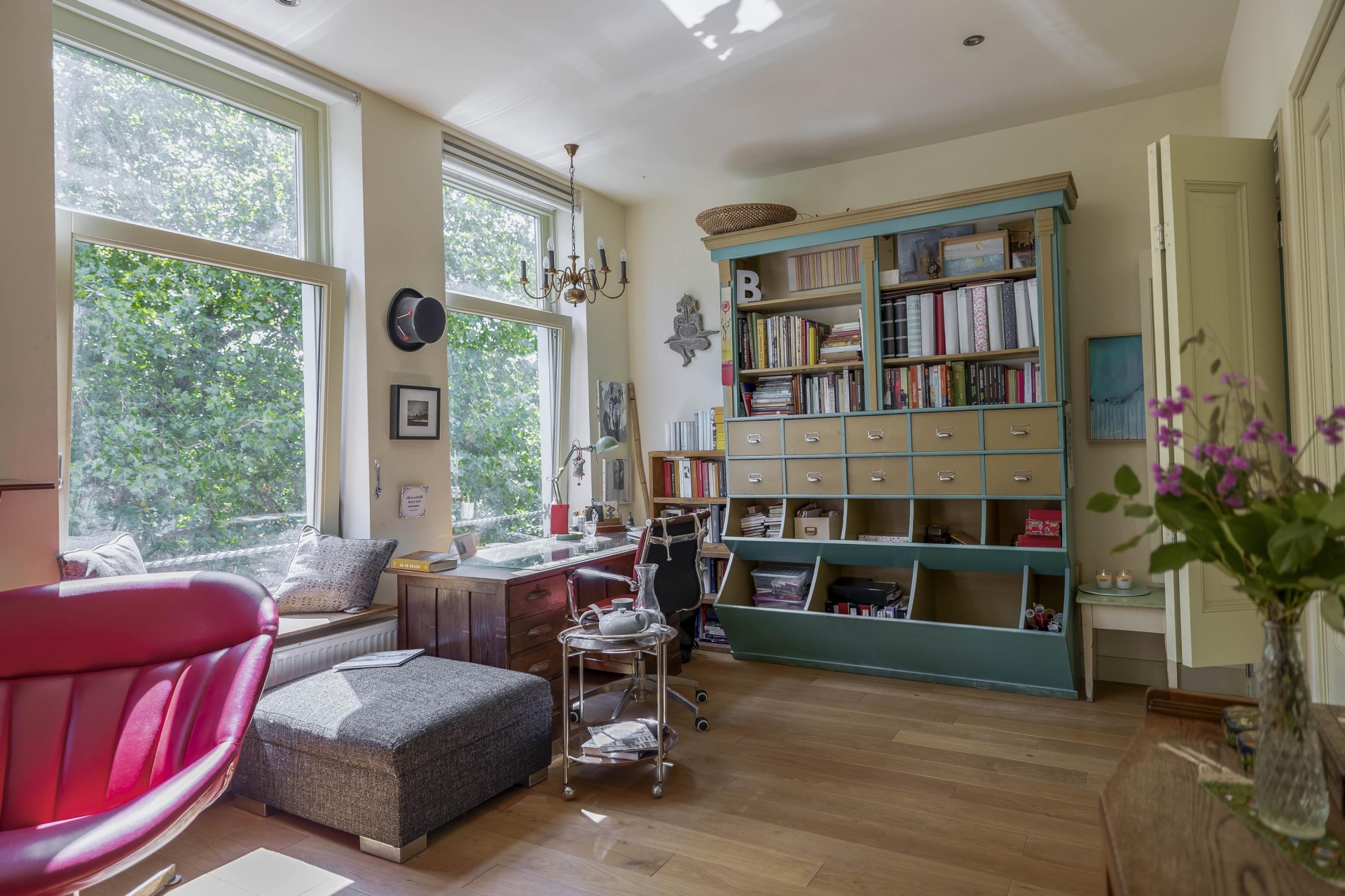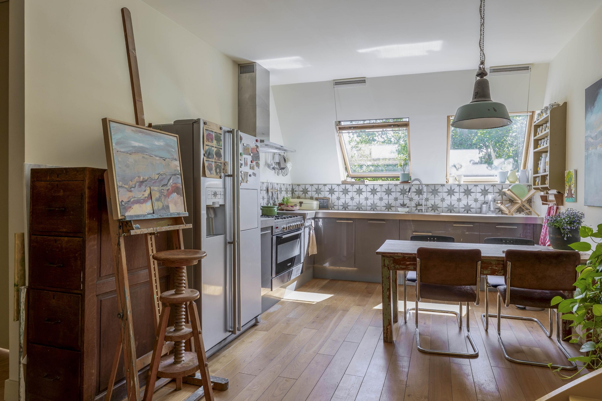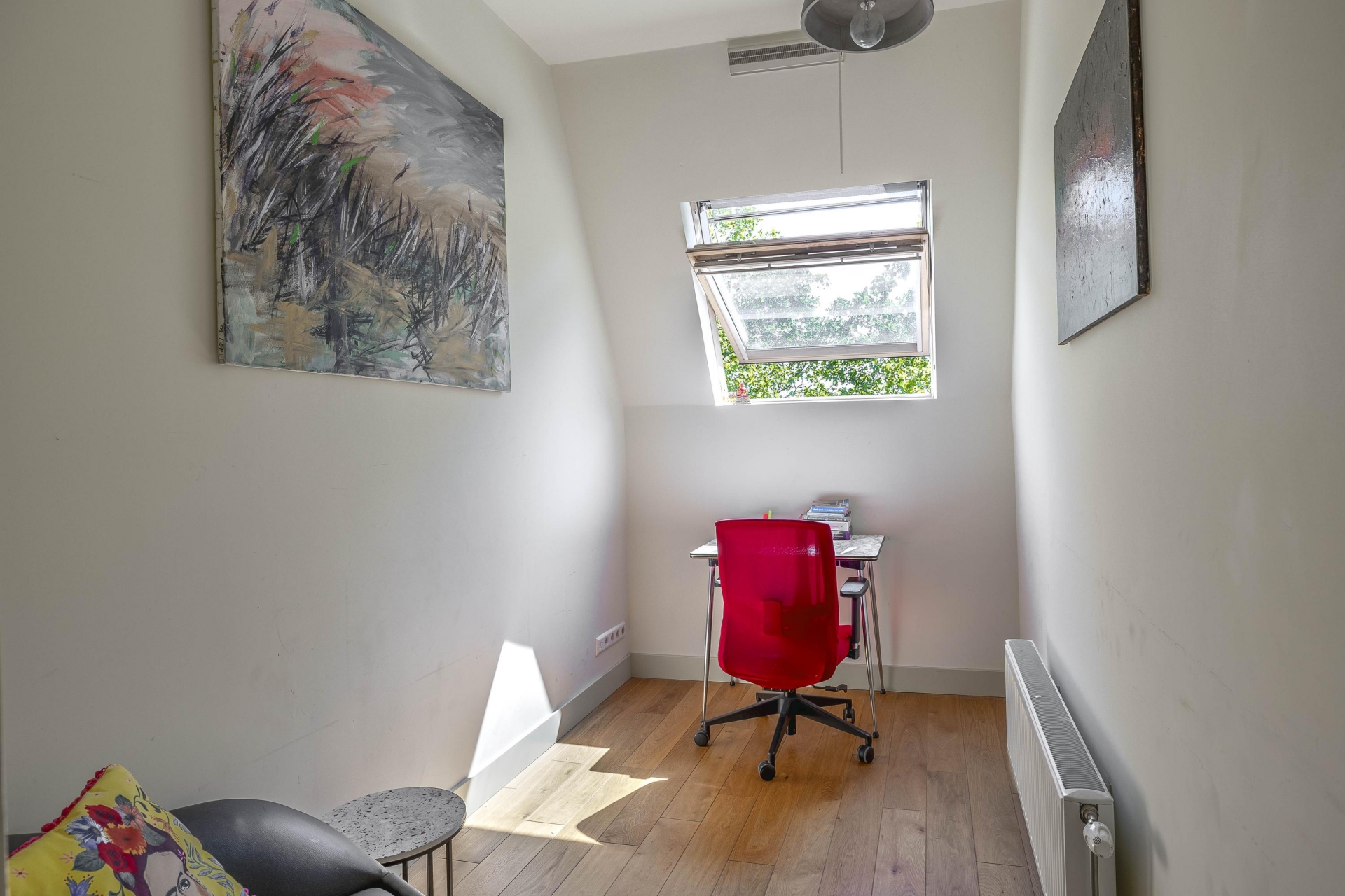 De derde verdieping is ingericht met een keukenruimte waar alles samenkomt. Hier tref je niet alleen een ruime keuken, maar ook een lichte slaapkamer die desgewenst dienst kan doen als hobbyruimte of werkplek. Door de hoogte en het uitzicht ervaar je hier een oase van rust, midden in de stad. De verkoper noemt dit dan ook niet voor niks 'het hart van het huis'.