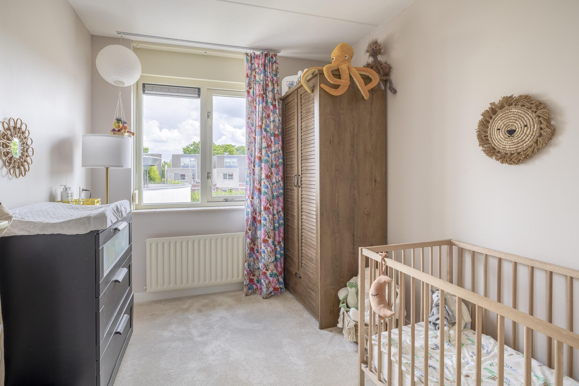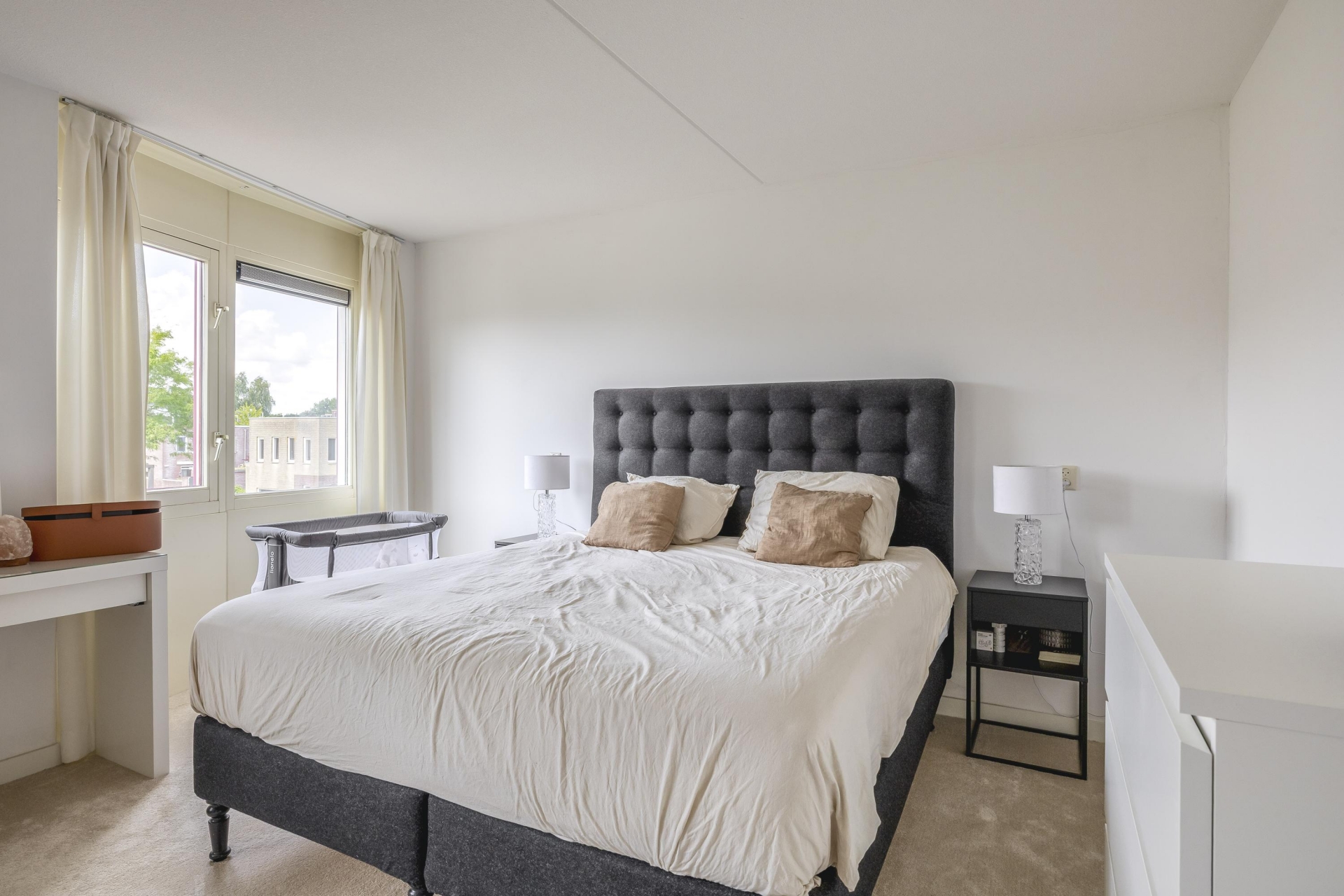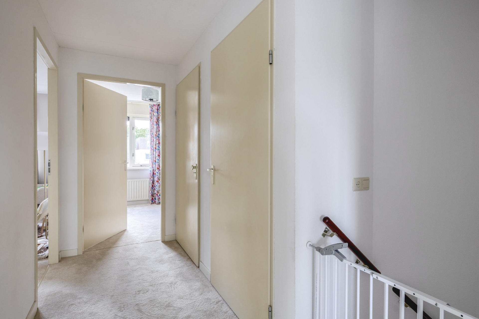 Op de bovenste verdieping vind je drie slaapkamers, waarvan de grootste aan de voorzijde ligt. Deze kamer biedt uitzicht op het water en de buurt – een fijne plek om ’s ochtends rustig wakker te worden. De twee andere kamers zijn ideaal als kinderkamer, werkkamer of logeerkamer. Alle slaapkamers zijn netjes afgewerkt met een gestoffeerde vloer en lichte wanden.