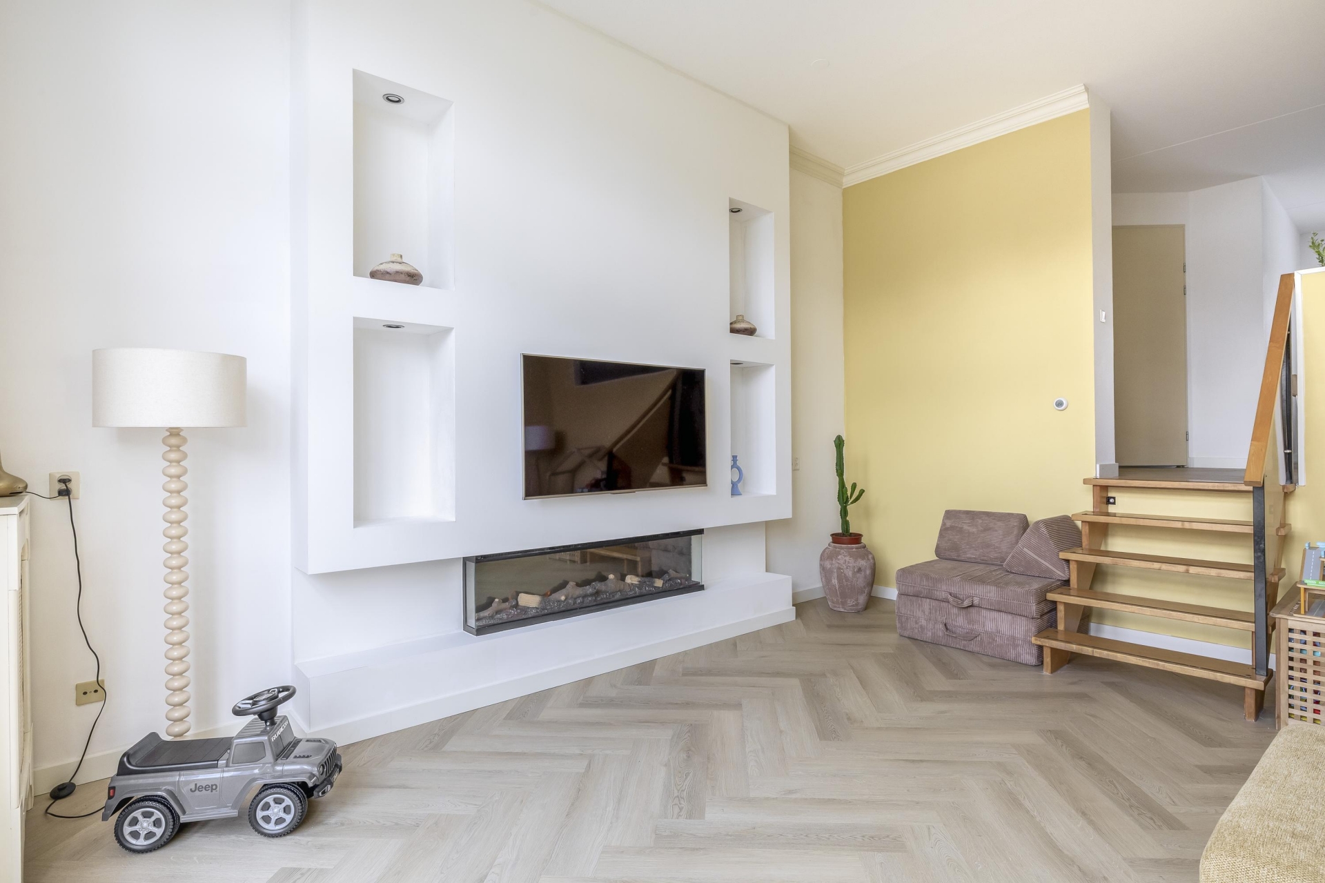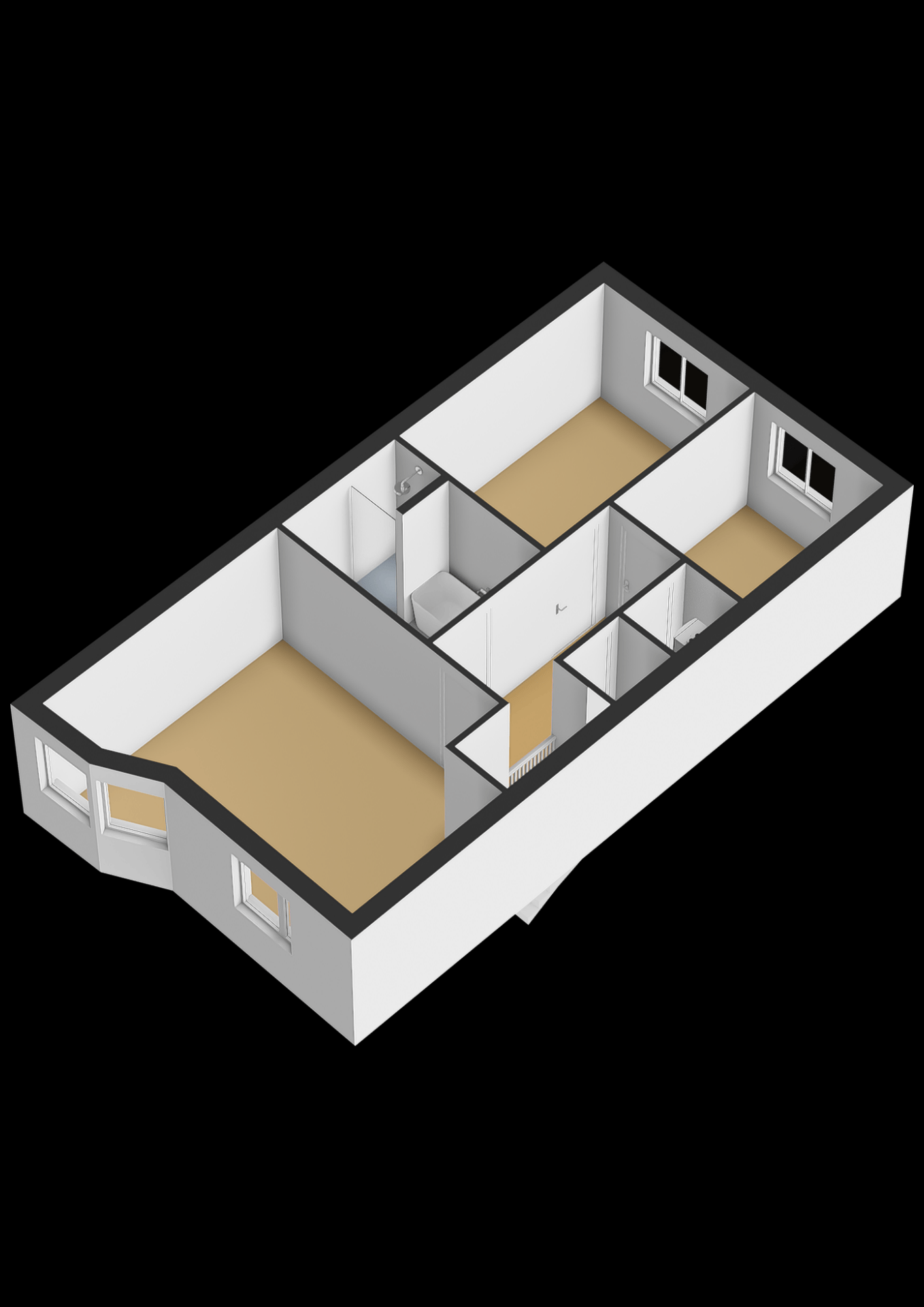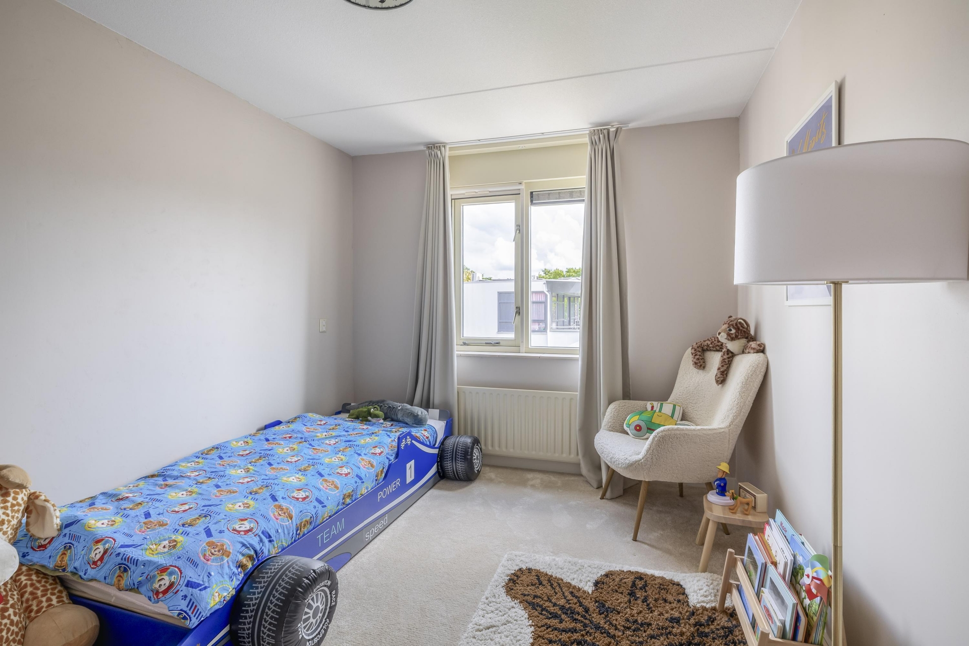 Op de bovenste verdieping vind je drie slaapkamers, waarvan de grootste aan de voorzijde ligt. Deze kamer biedt uitzicht op het water en de buurt – een fijne plek om ’s ochtends rustig wakker te worden. De twee andere kamers zijn ideaal als kinderkamer, werkkamer of logeerkamer. Alle slaapkamers zijn netjes afgewerkt met een gestoffeerde vloer en lichte wanden.