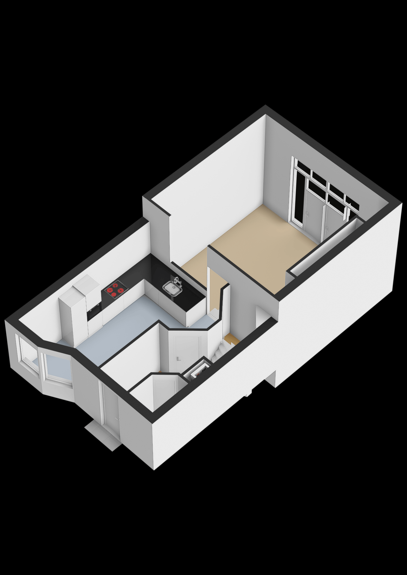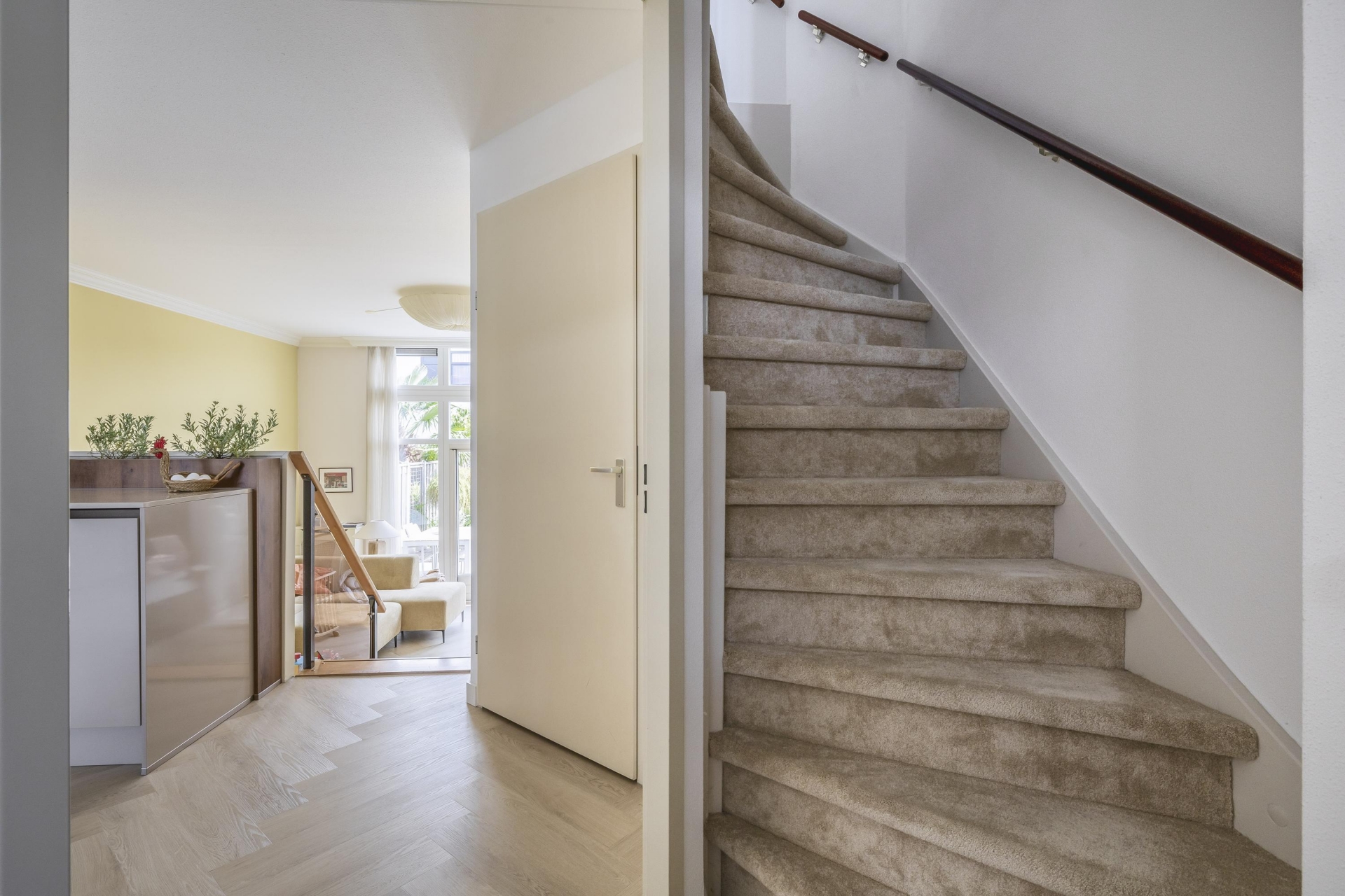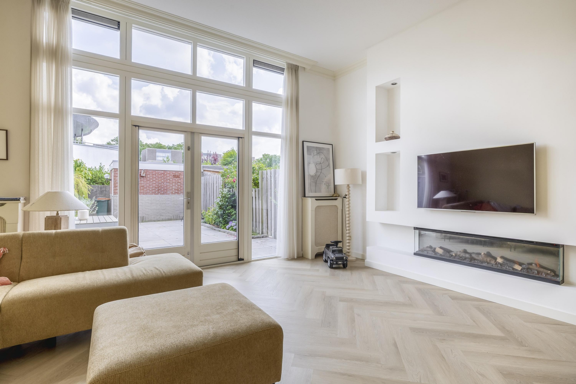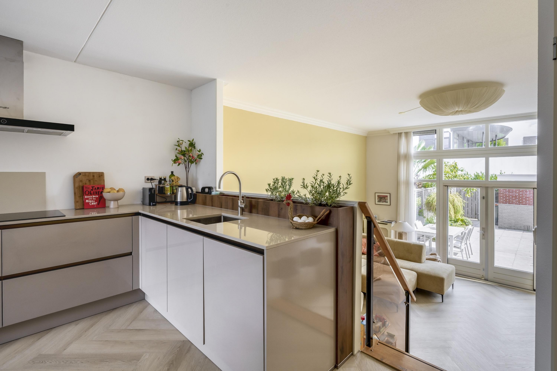 Wat meteen opvalt zodra je binnenkomt, is de unieke indeling. De woonkamer ligt verdiept ten opzichte van de keuken, waardoor je niet alleen extra hoogte ervaart, maar ook een fantastisch zicht naar buiten hebt. De grote raampartijen laten het daglicht rijkelijk binnenstromen, en de openslaande deuren verbinden binnen moeiteloos met buiten. De woonkamer voelt warm en uitnodigend aan en biedt voldoende plek voor een royale zithoek.
