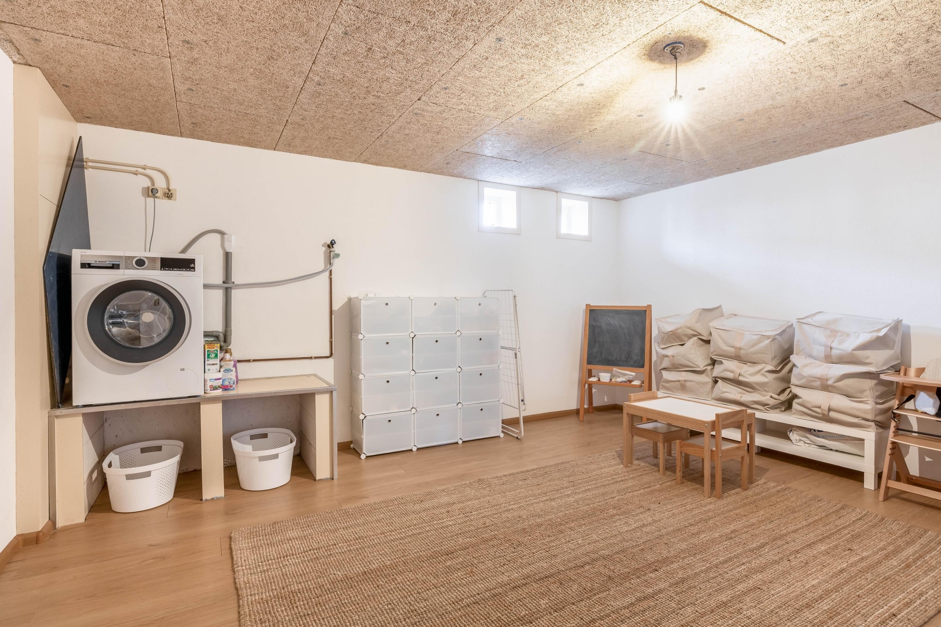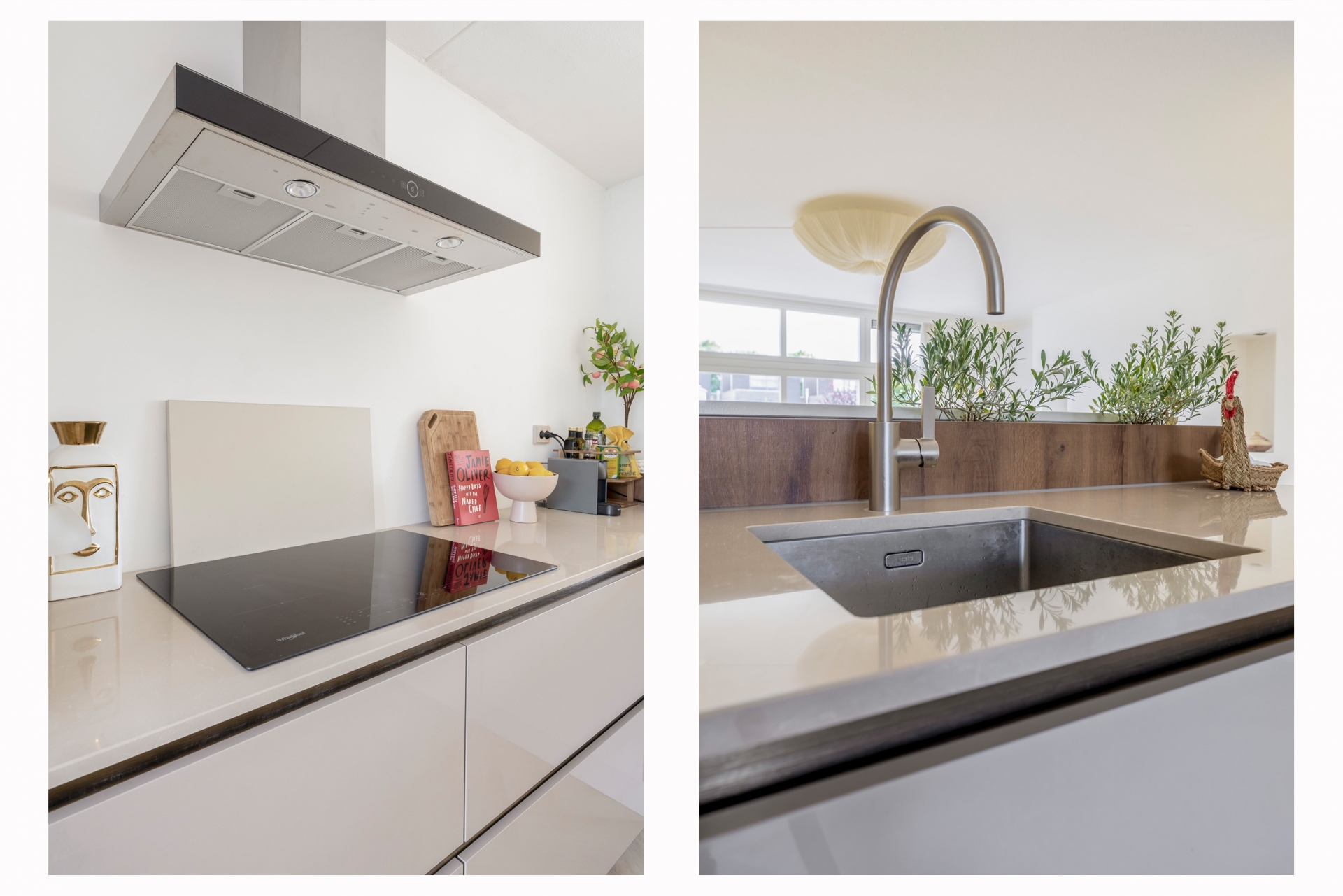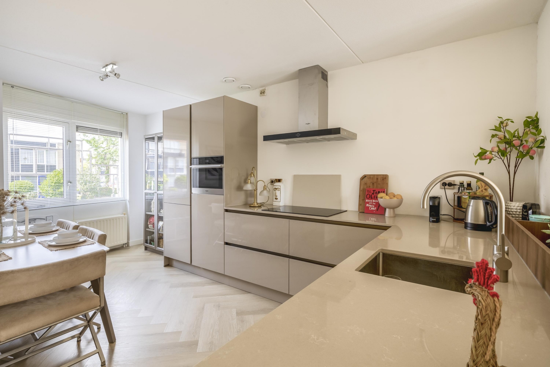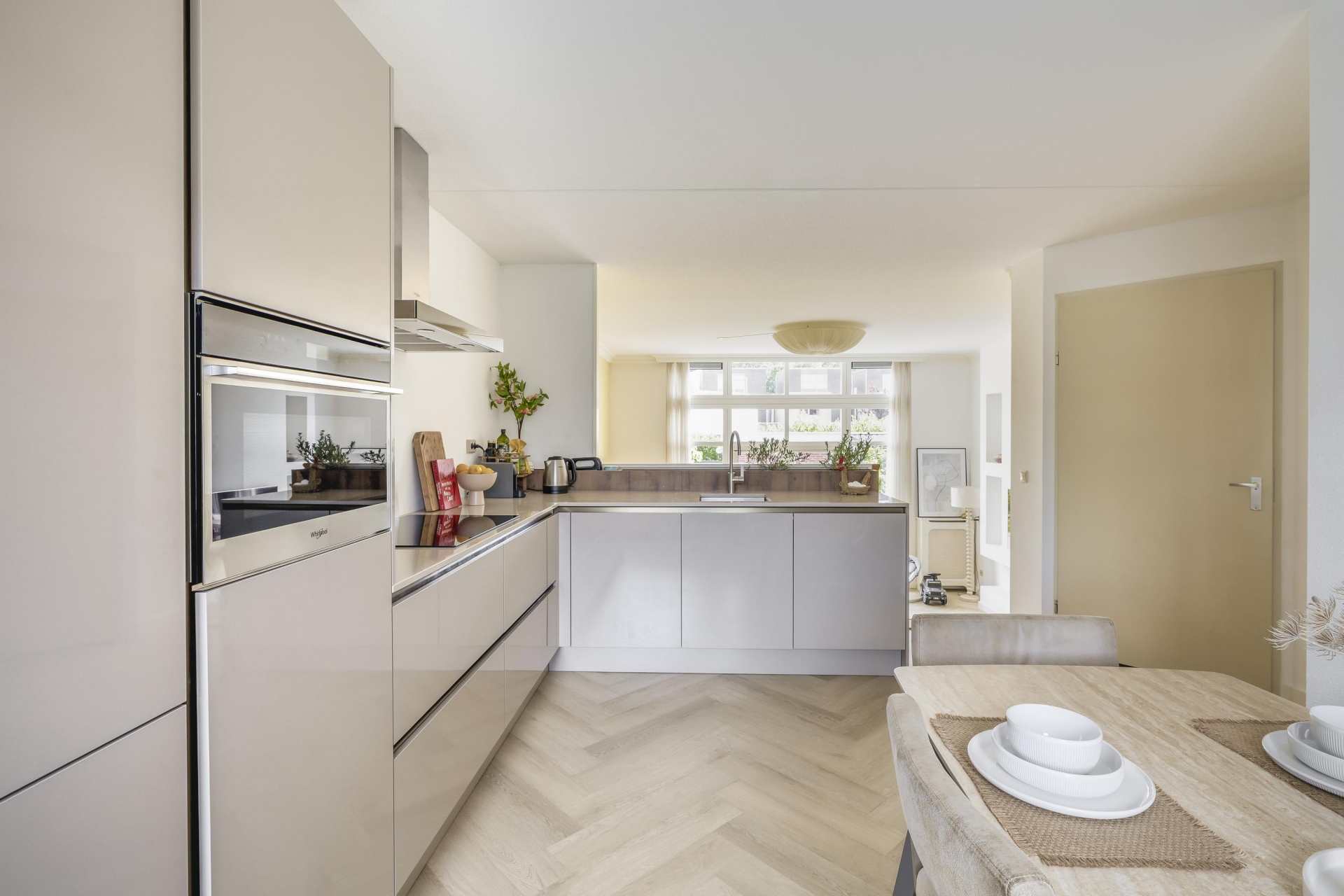 De woonkeuken is op een verhoogd niveau geplaatst en vernieuwd in 2024. Deze is strak, modern en van alle gemakken voorzien: inbouwapparatuur, veel werkruimte en plek voor een eethoek. Perfect voor wie graag kookt en gasten ontvangt. De lichte kleurstelling en de nette afwerking maken het plaatje compleet.