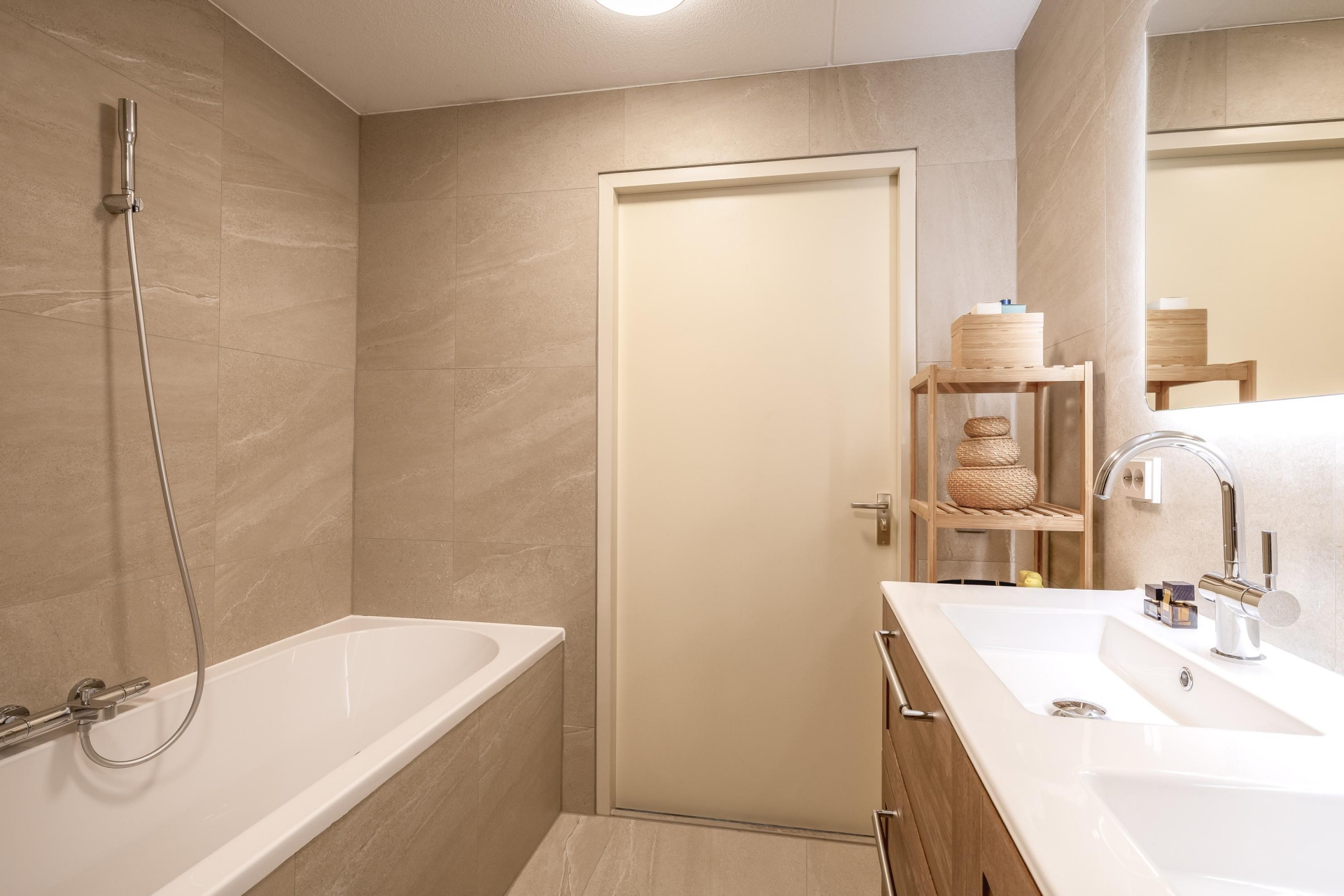 De badkamer is in 2024 volledig vernieuwd en straalt rust en comfort uit. Met een ruime douche, modern wastafelmeubel en fraai tegelwerk is dit een fijne plek om de dag te beginnen of juist ontspannen af te sluiten. Ook is er een separaat toilet, vernieuwd in dezelfde stijl.