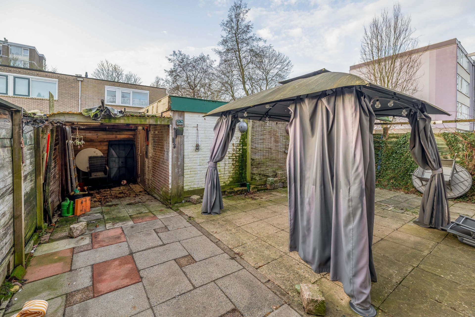 - ruime achtertuin met stenen berging;