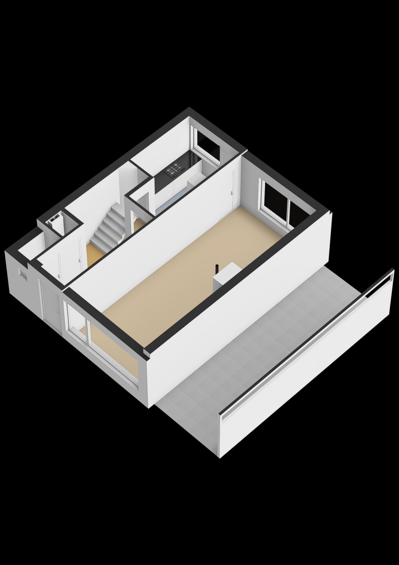 Begane grond: Entree in de ruime hal met toilet, garderobekast met meterkast en de trapopgang naar de eerste verdieping. Eenvoudig toilet. Ruime doorzonkamer met grote raampartijen. Keuken met eenvoudig keukenblok en trapkast.