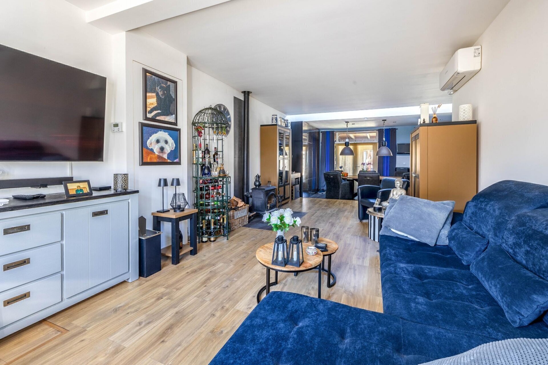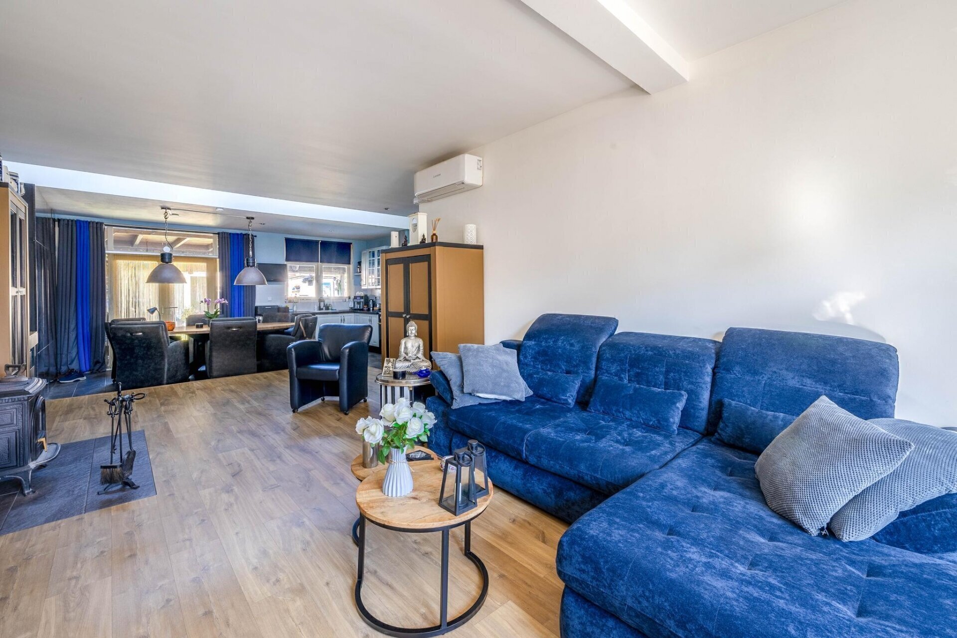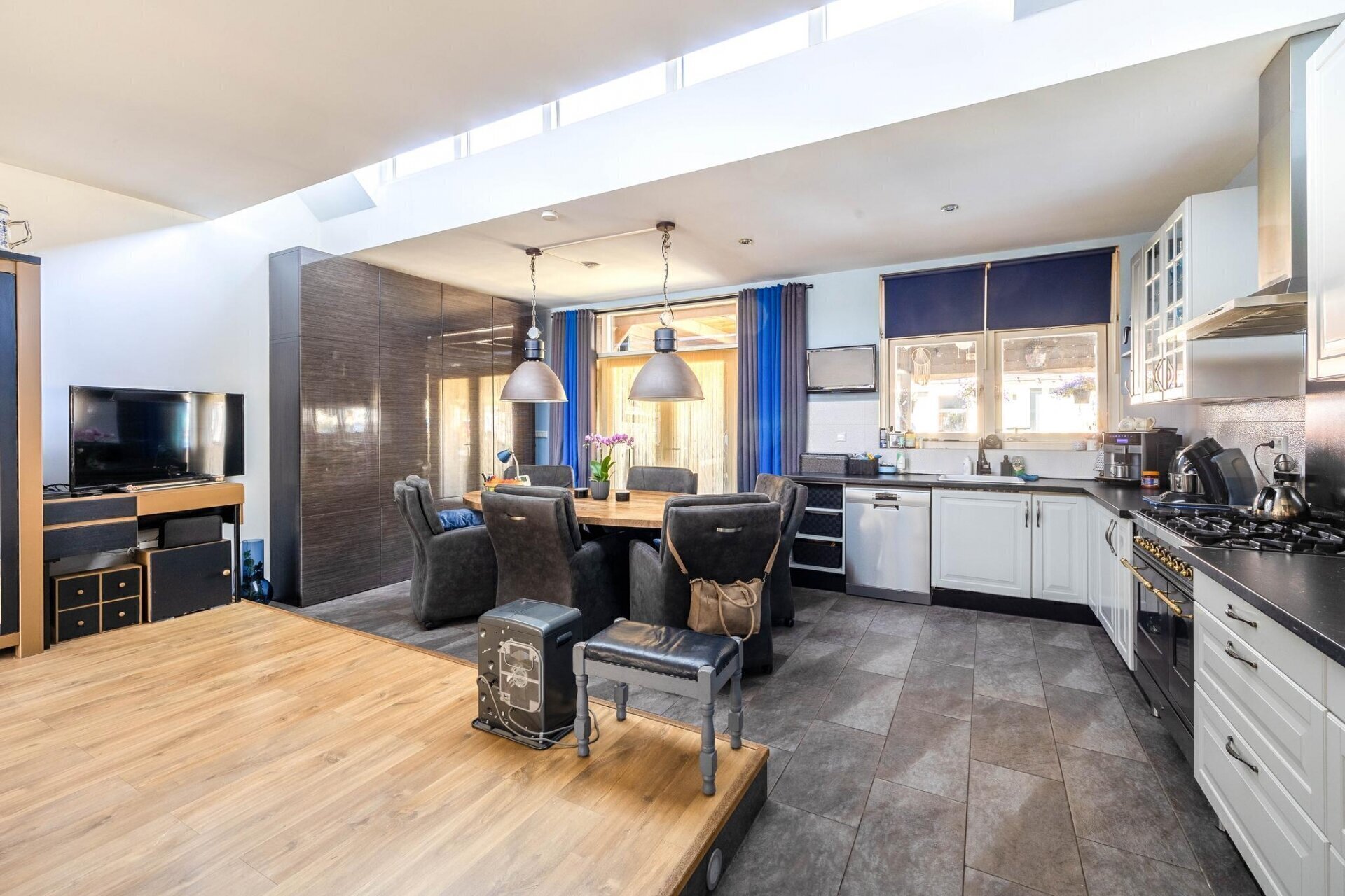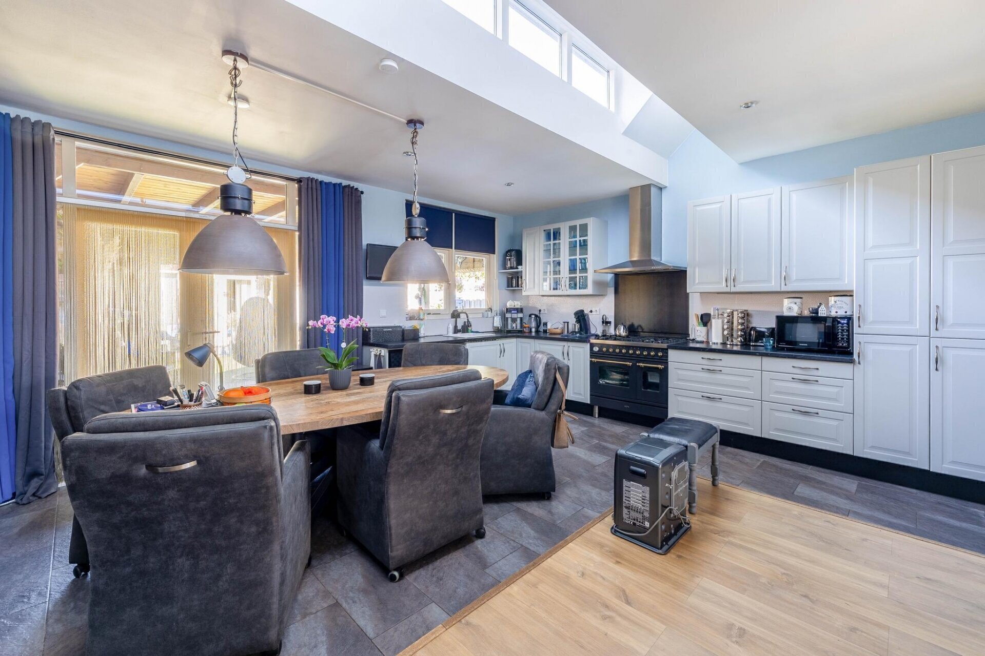 Woonkamer met open keuken en vloerverwarming onder de tegelvloer in de woonkamer en houtkachel. Open keuken is ruim (keuken alleen inclusief vaatwasser, overige apparatuur van huidige bewoners);