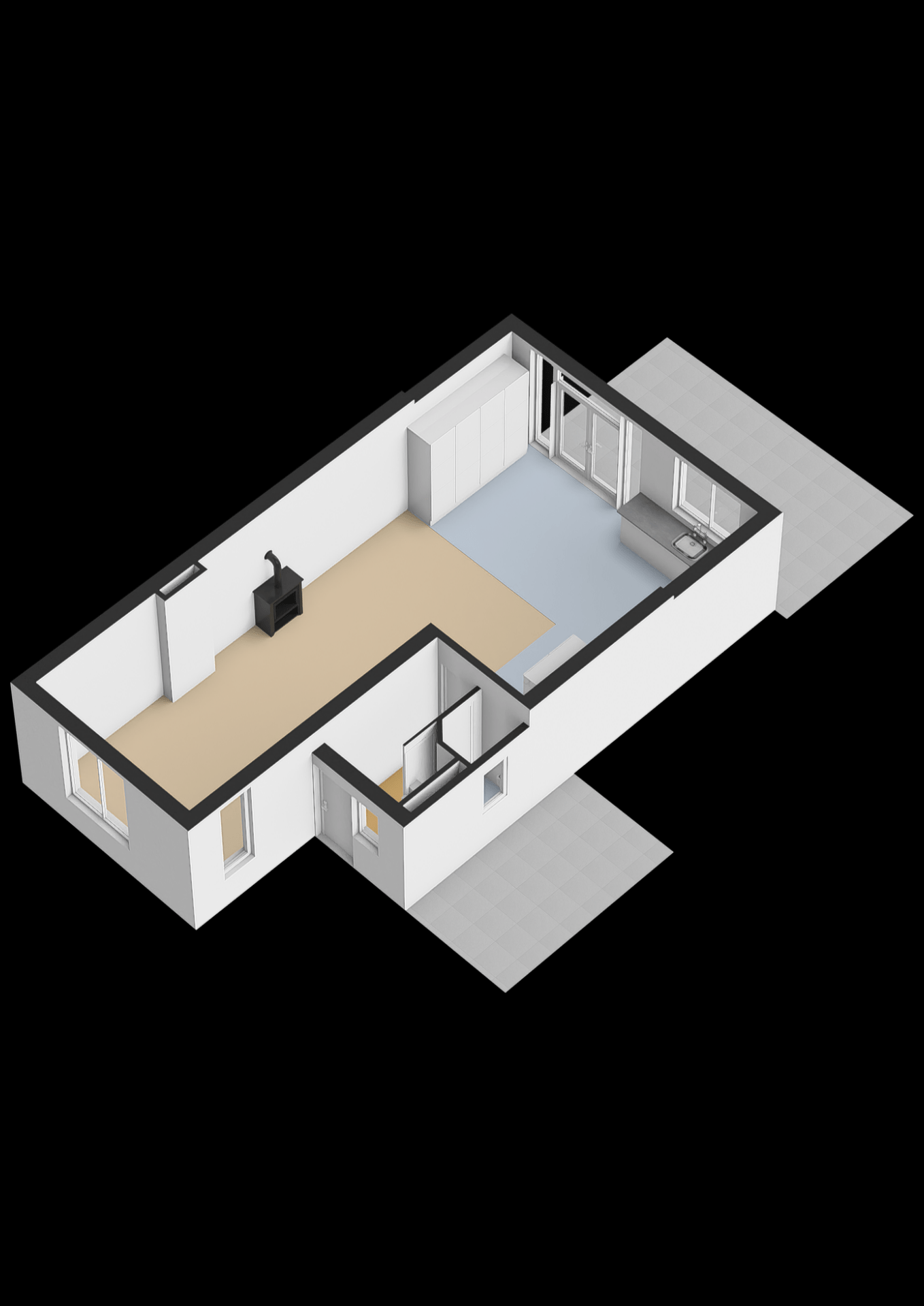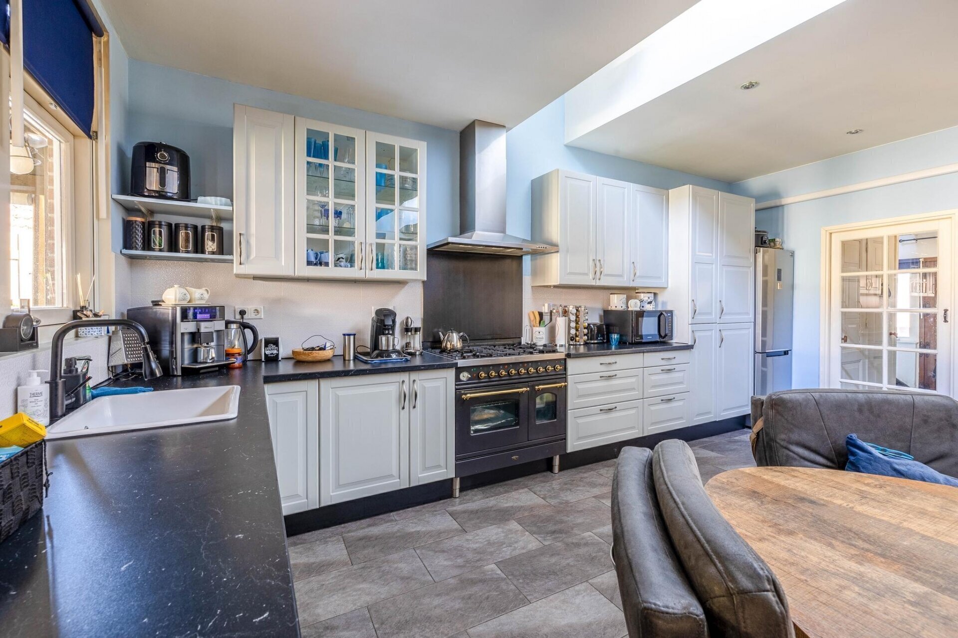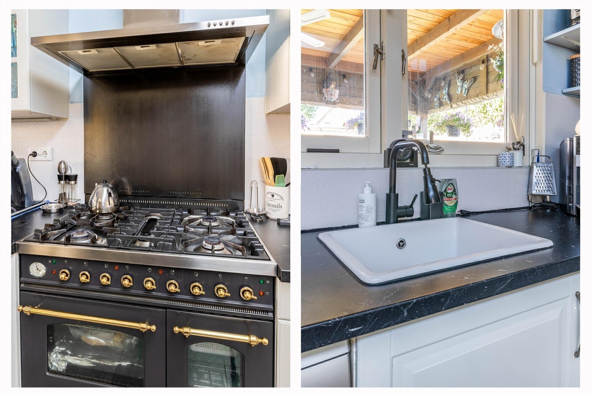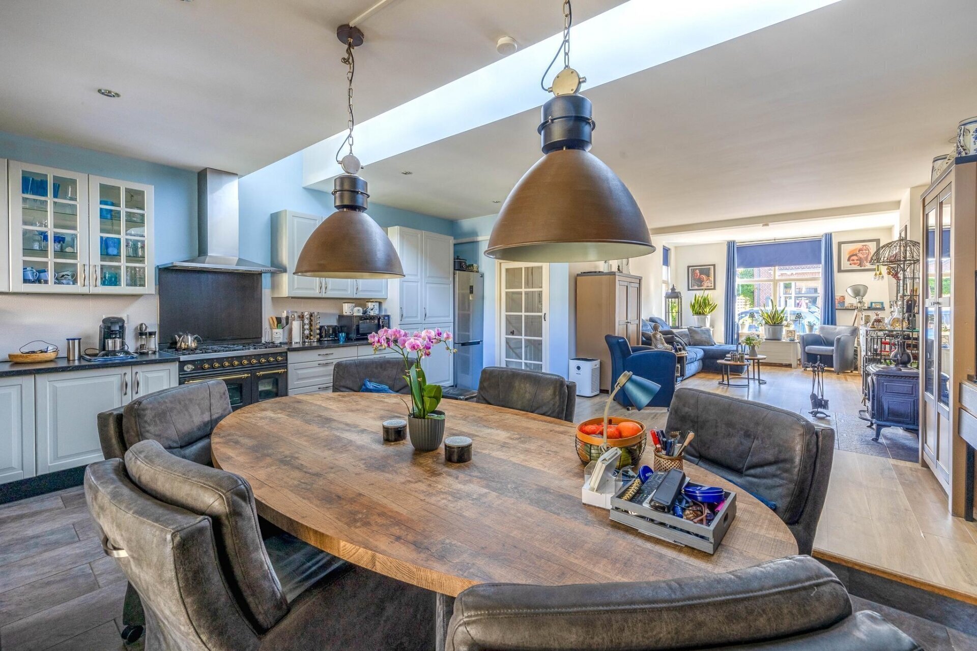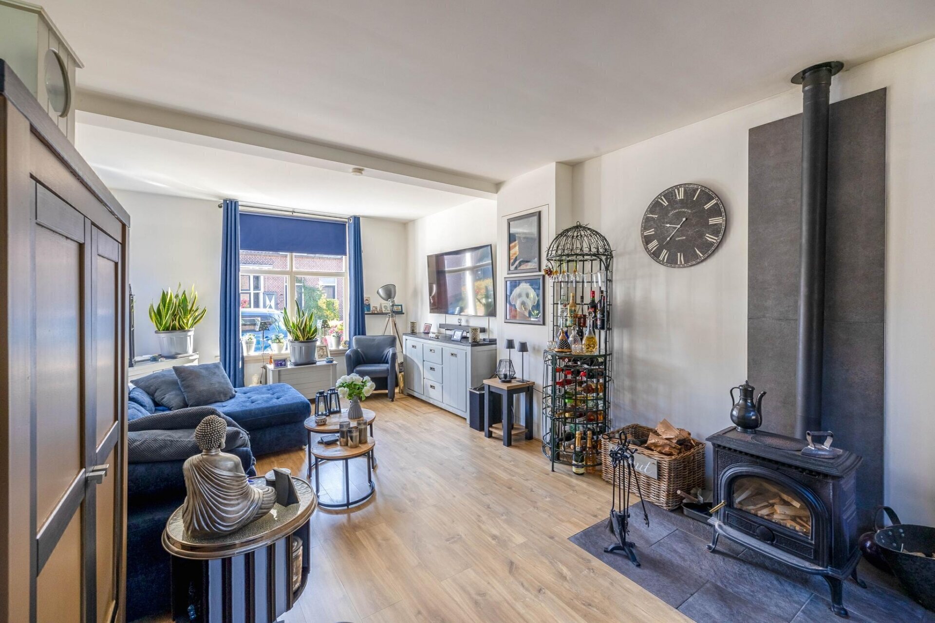 Woonkamer met open keuken en vloerverwarming onder de tegelvloer in de woonkamer en houtkachel. Open keuken is ruim (keuken alleen inclusief vaatwasser, overige apparatuur van huidige bewoners);