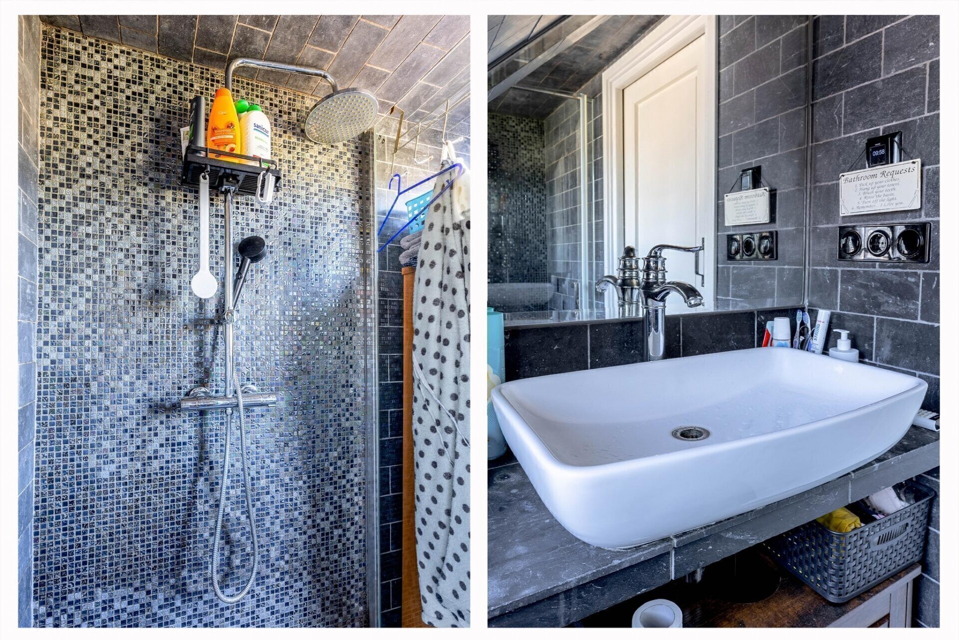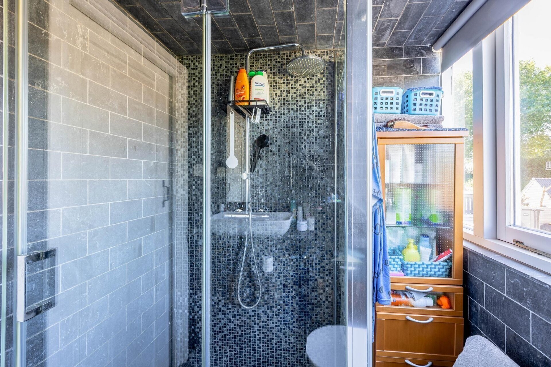 Overloop; Badkamer met toilet, inloopdouche en wastafelmeubel;