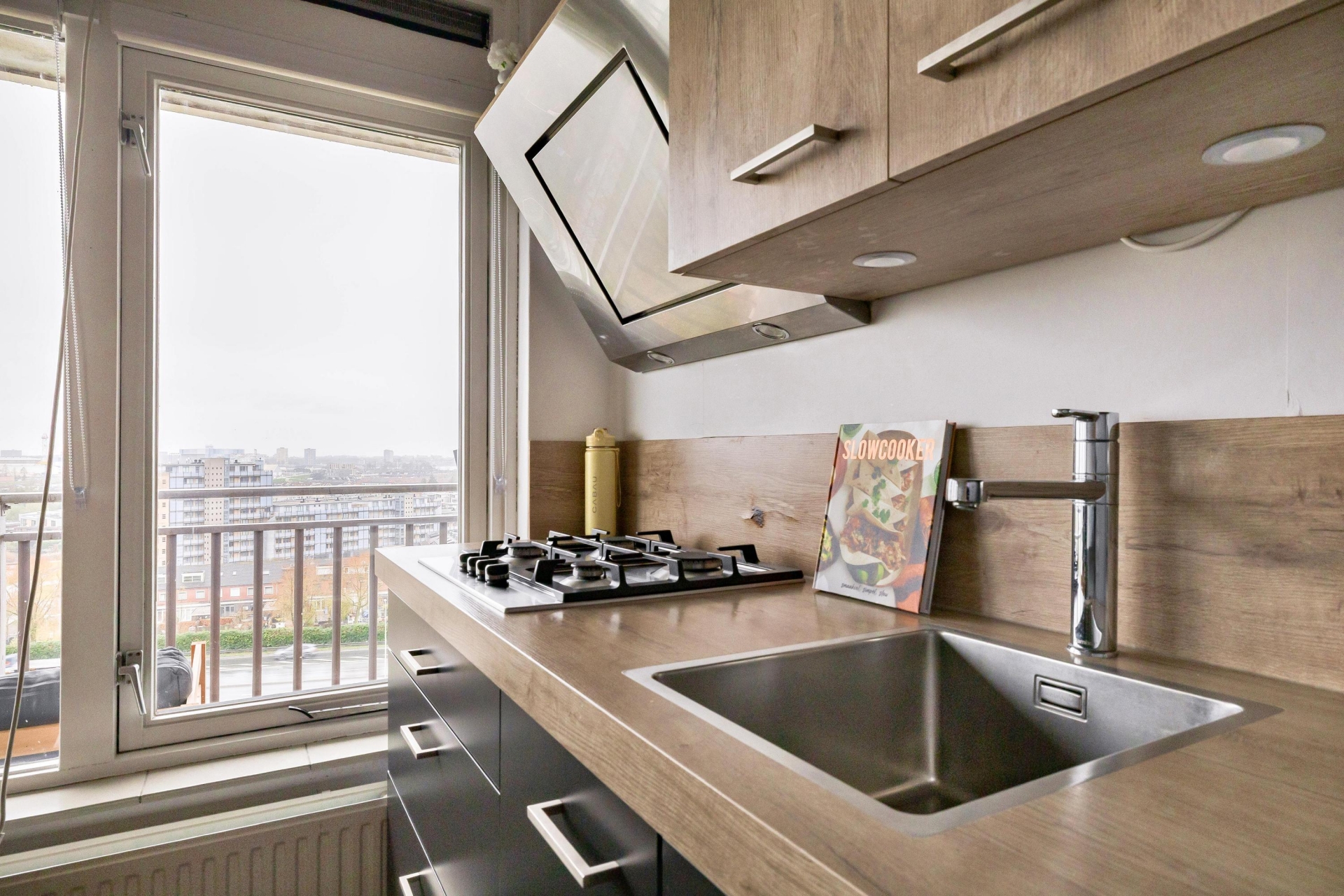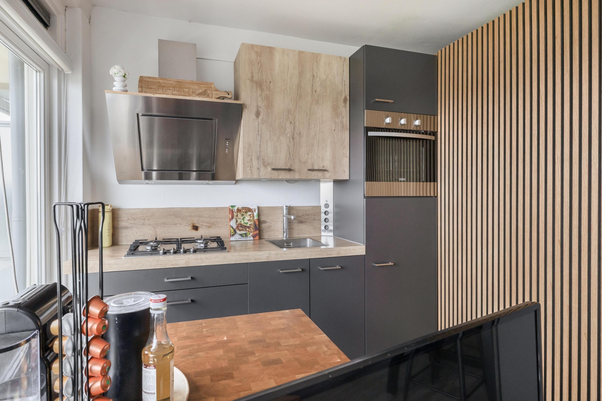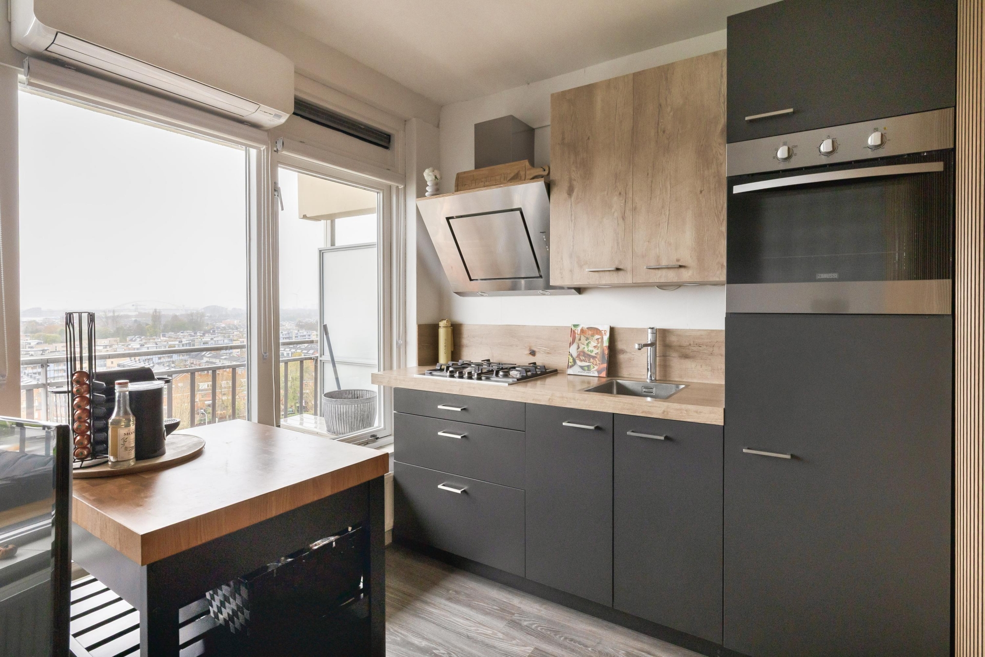 De keuken is compact maar functioneel en fraai afgewerkt met een combinatie van houttinten en donkere fronten. Je hebt alles binnen handbereik om comfortabel te koken. Aangrenzend vind je de badkamer, die twee jaar geleden volledig is vernieuwd. Deze is uitgerust met een inloopdouche, een modern wastafelmeubel en een hangend toilet, kortom fris, praktisch en helemaal van deze tijd.