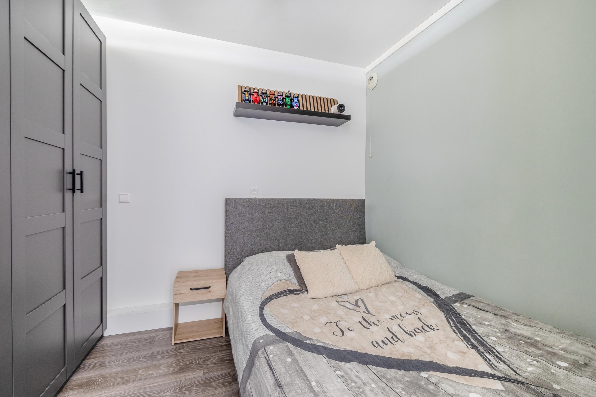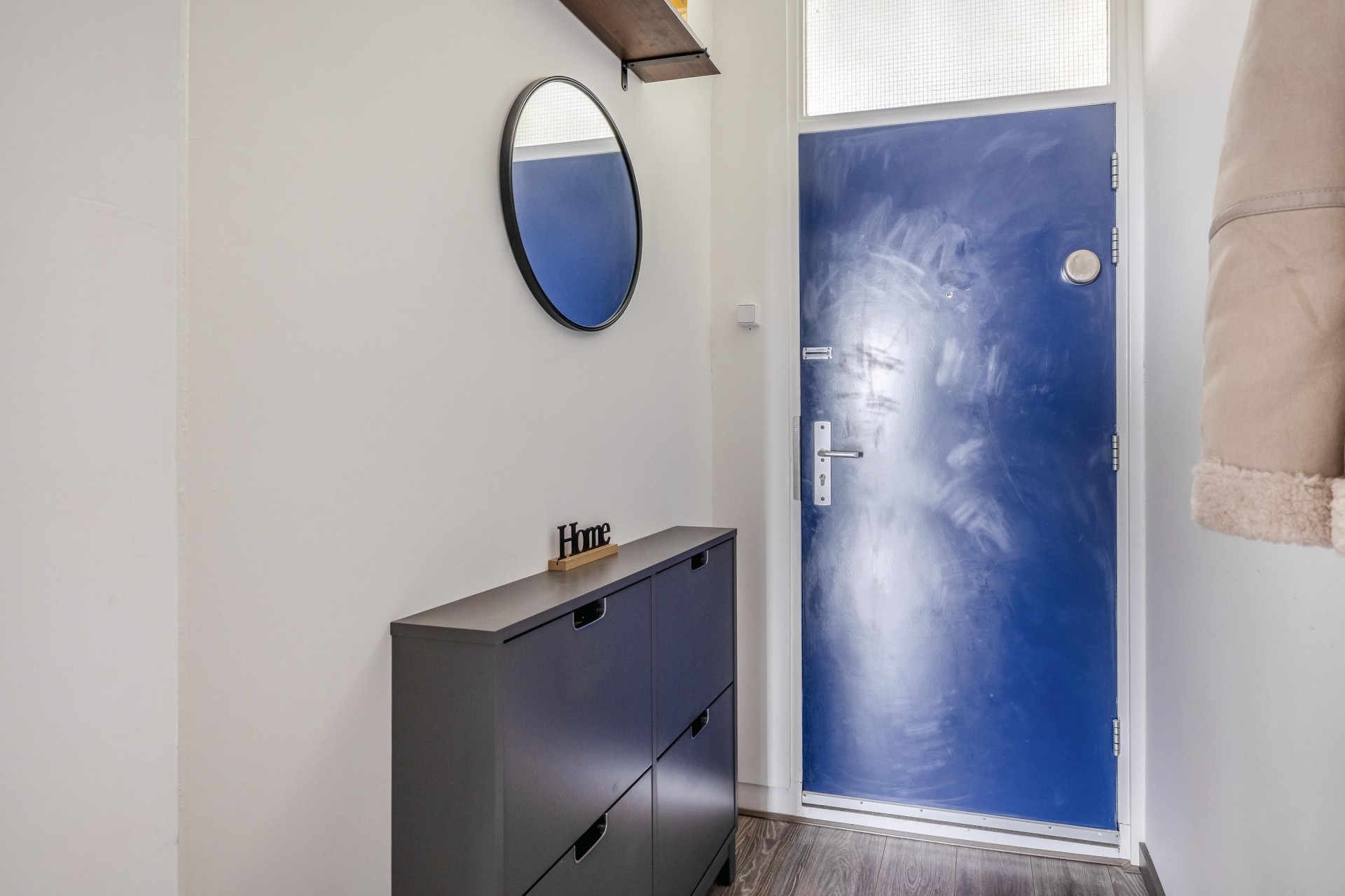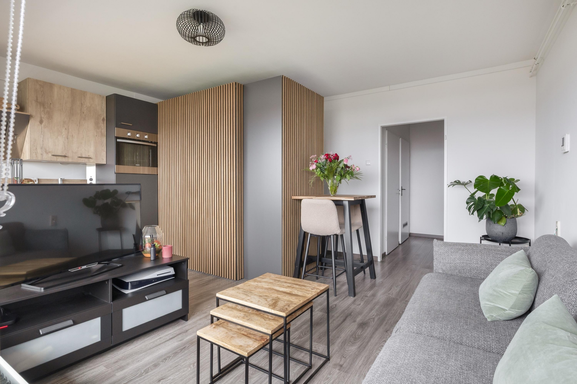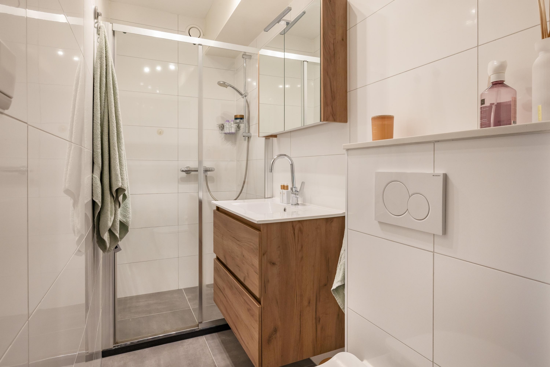 De keuken is compact maar functioneel en fraai afgewerkt met een combinatie van houttinten en donkere fronten. Je hebt alles binnen handbereik om comfortabel te koken. Aangrenzend vind je de badkamer, die twee jaar geleden volledig is vernieuwd. Deze is uitgerust met een inloopdouche, een modern wastafelmeubel en een hangend toilet, kortom fris, praktisch en helemaal van deze tijd.