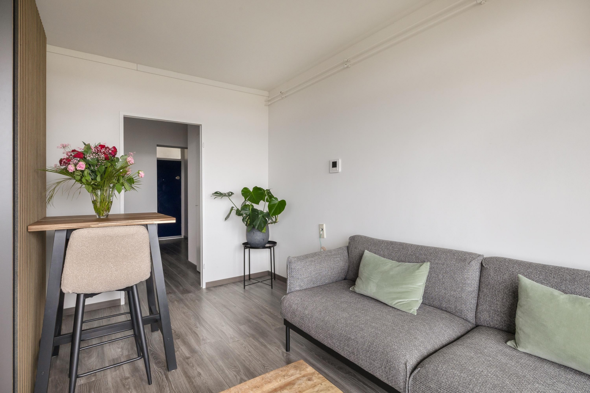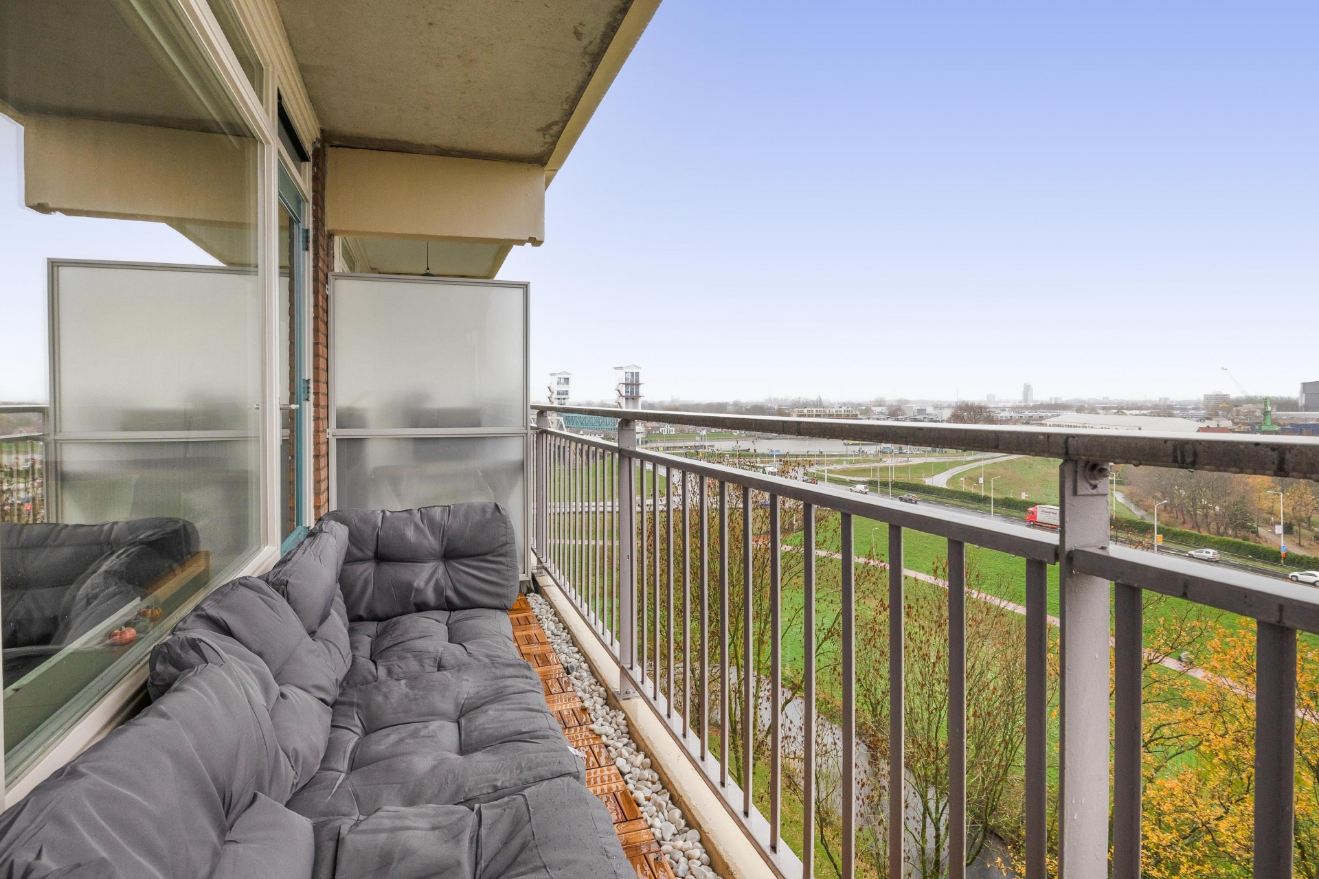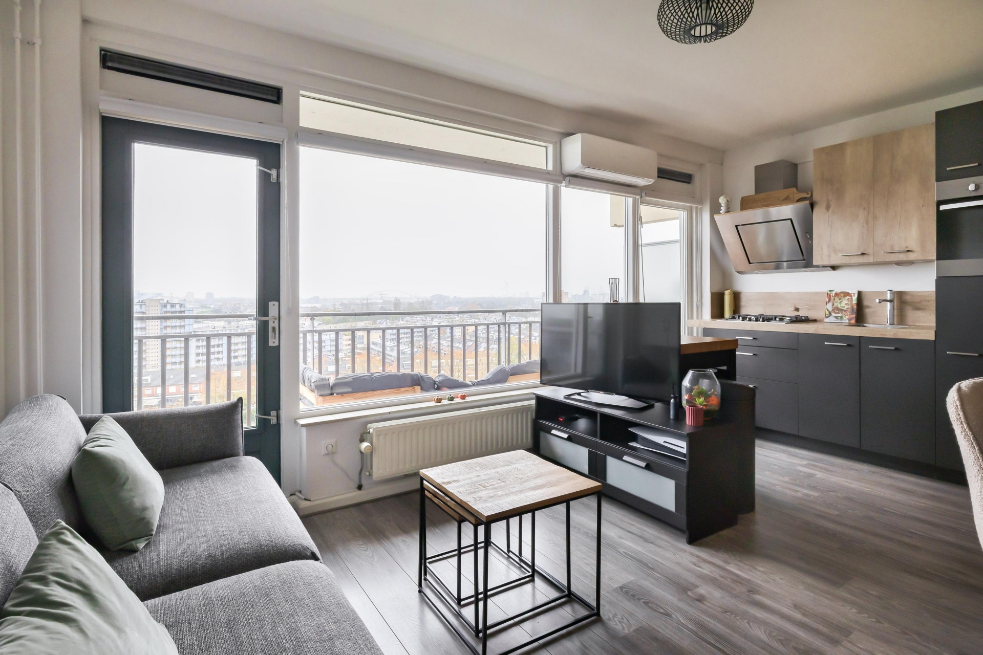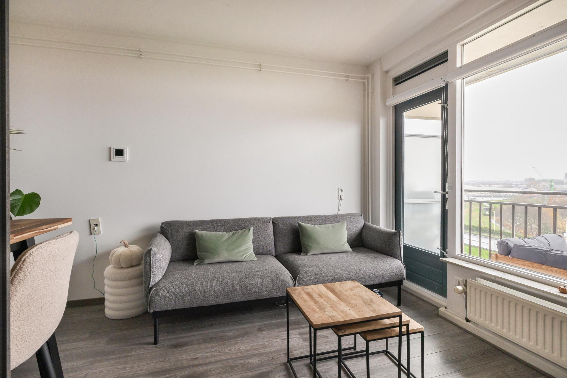 De open studio-indeling maakt het appartement praktisch en overzichtelijk. Dankzij de grote raampartijen komt er veel daglicht binnen en heb je een vrij uitzicht, op heldere dagen kijk je zelfs richting de skyline van Rotterdam. De ruimte is slim ingericht, waardoor je eenvoudig een zithoek, eethoek en slaapgedeelte kunt combineren zonder dat het benauwd aanvoelt. De strakke vloer en neutrale afwerking geven het geheel een moderne en rustige uitstraling.